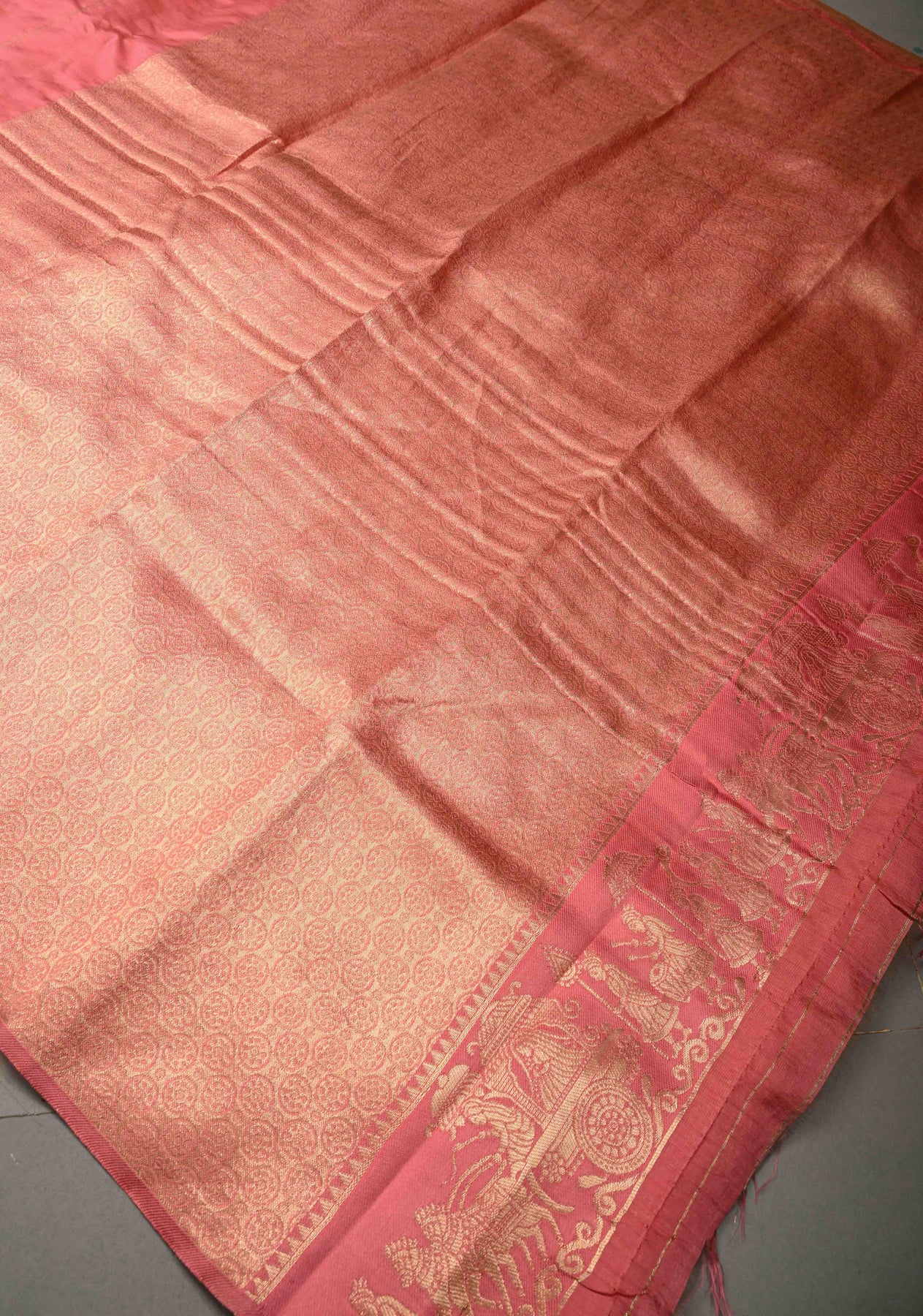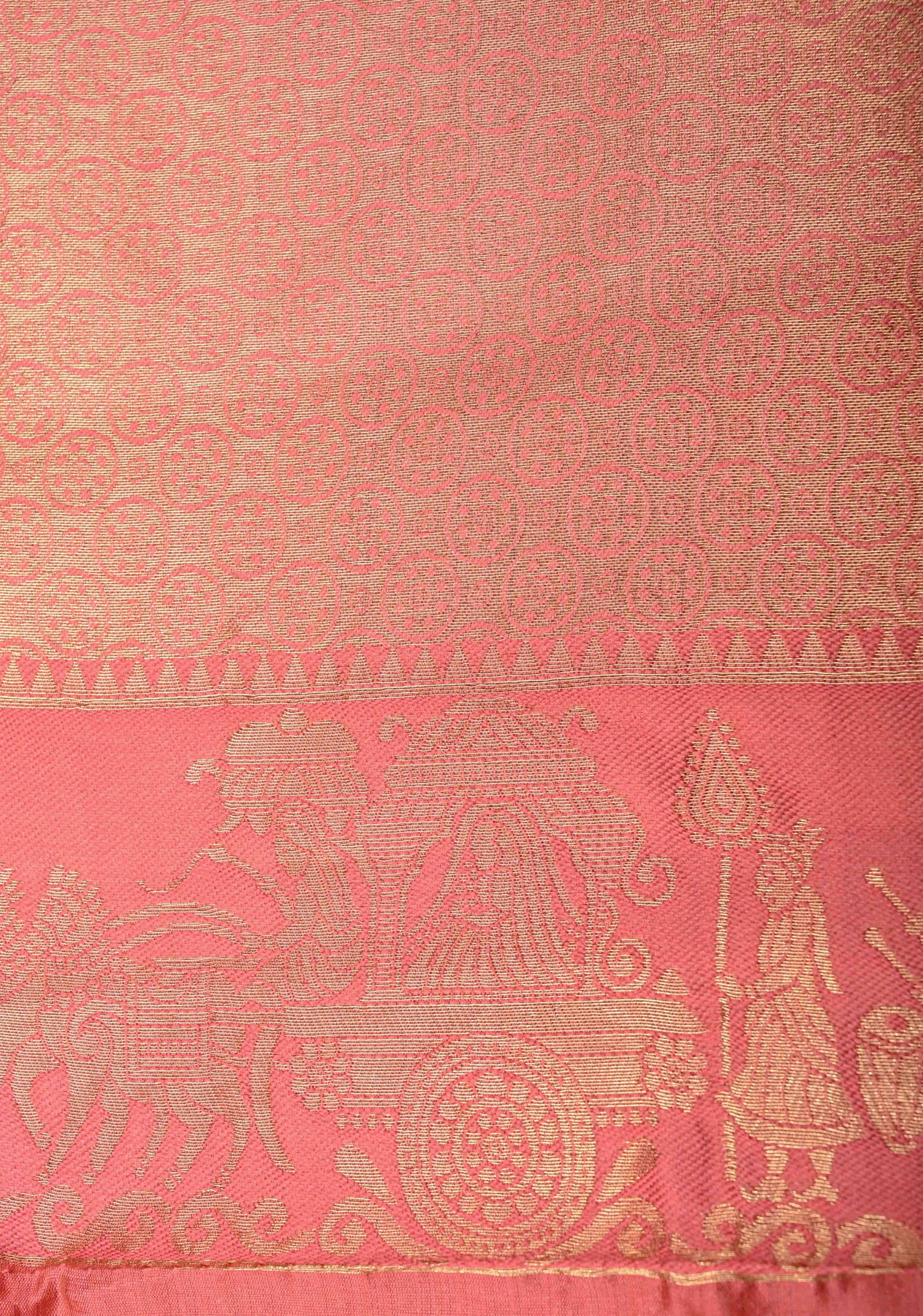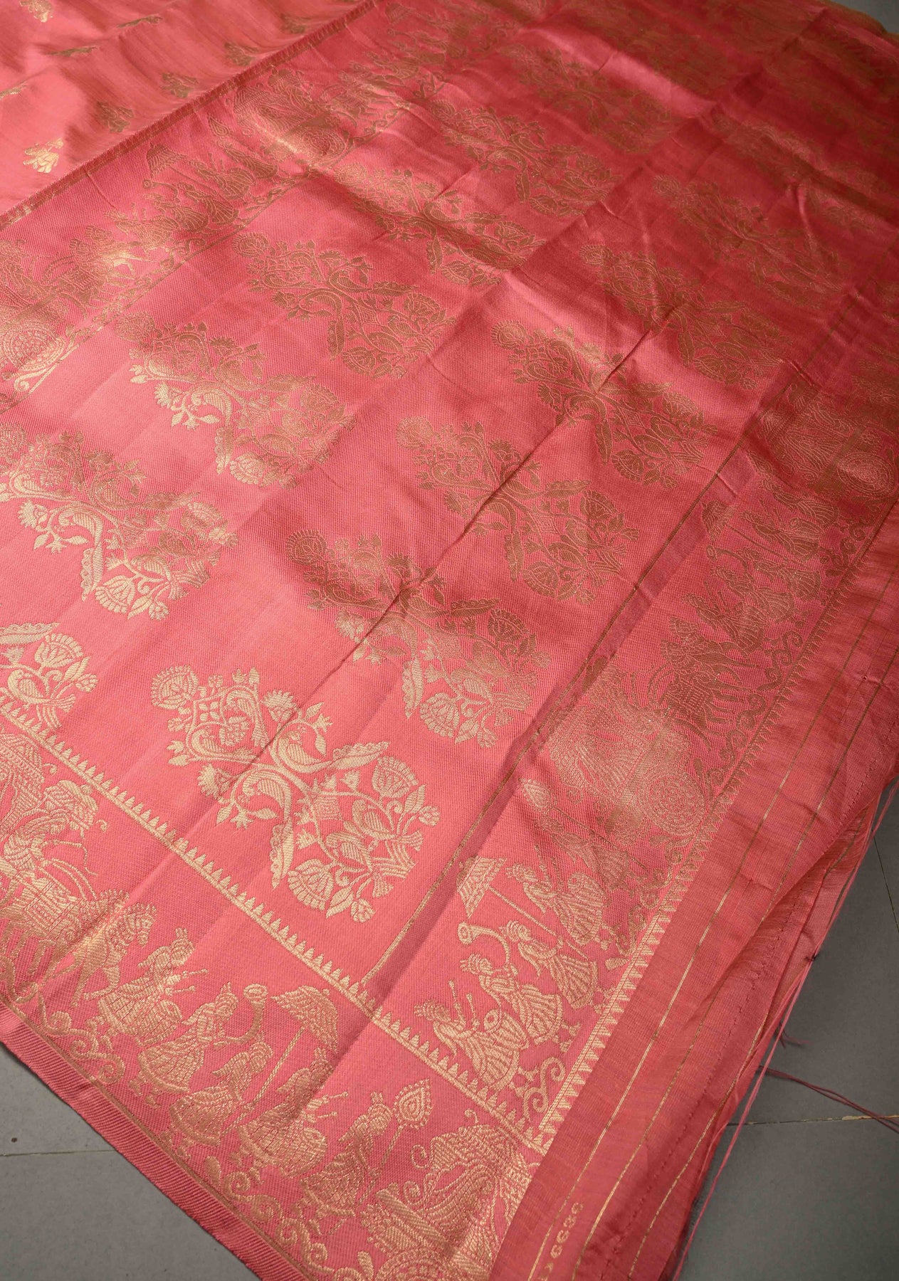 The soft coral pink body is beautifully adorned with elephant-inspired zari buttas, symbolizing strength and prosperity, adding a playful yet elegant motif to the design. A procession-style zari border completes the look with grandeur, while the Kanjivaram-inspired pallu adds a traditional finishing touch. Perfect for weddings, festive occasions, and cultural celebrations, this saree is ideal for women who love heritage-inspired weaves with a modern twist.