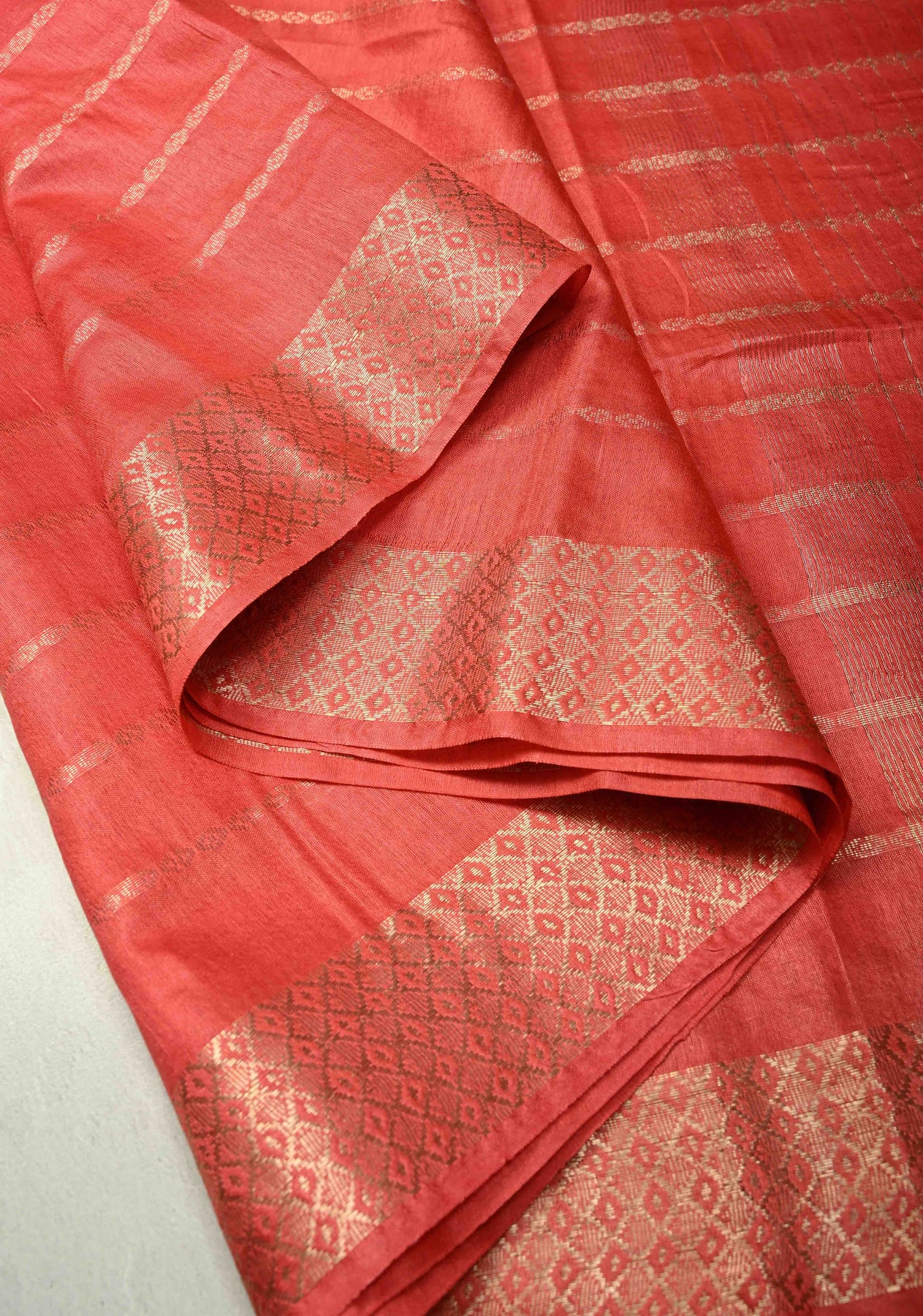 Coral Pink Semi Tussar Saree with Zari Stripes and Zari Border