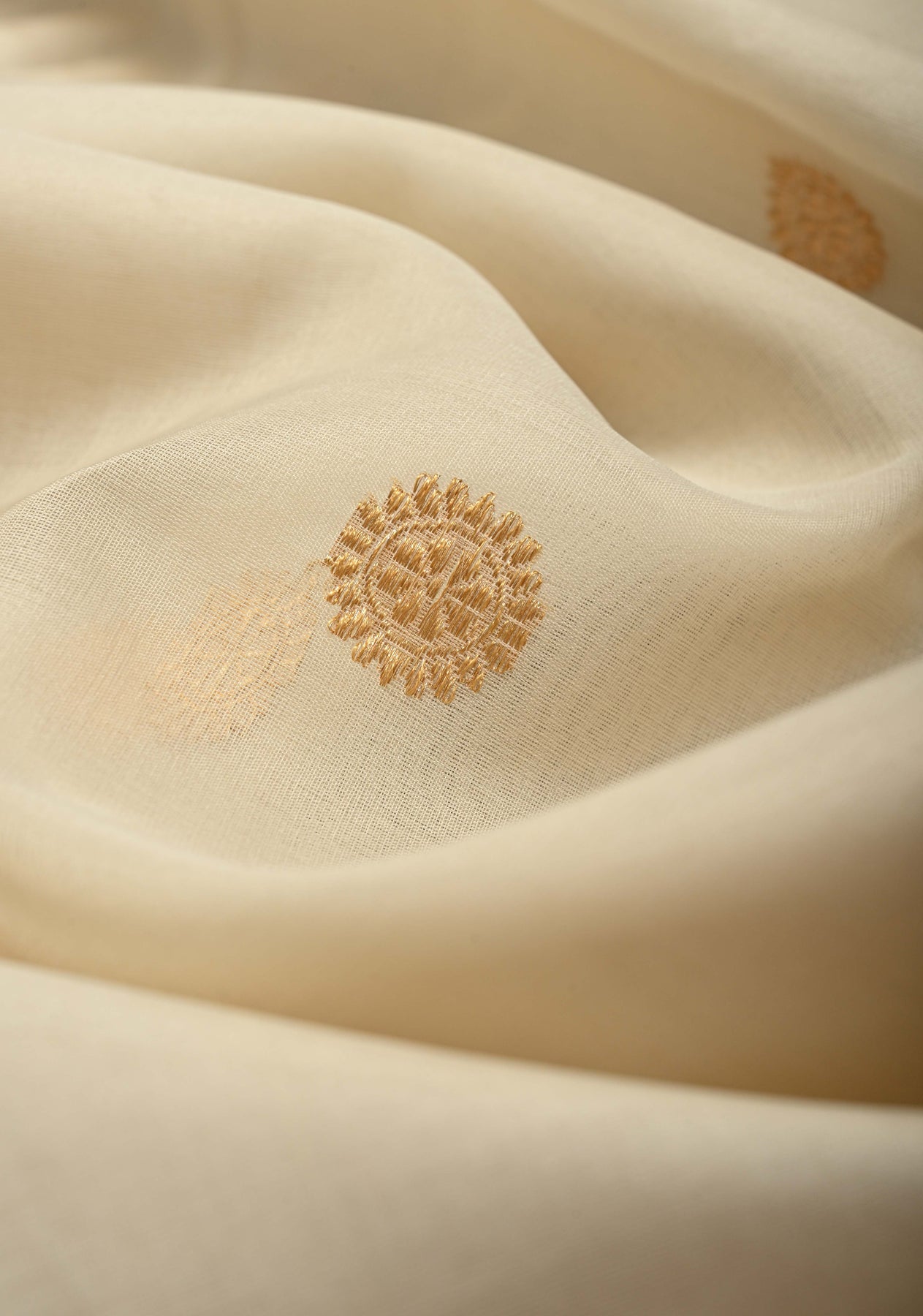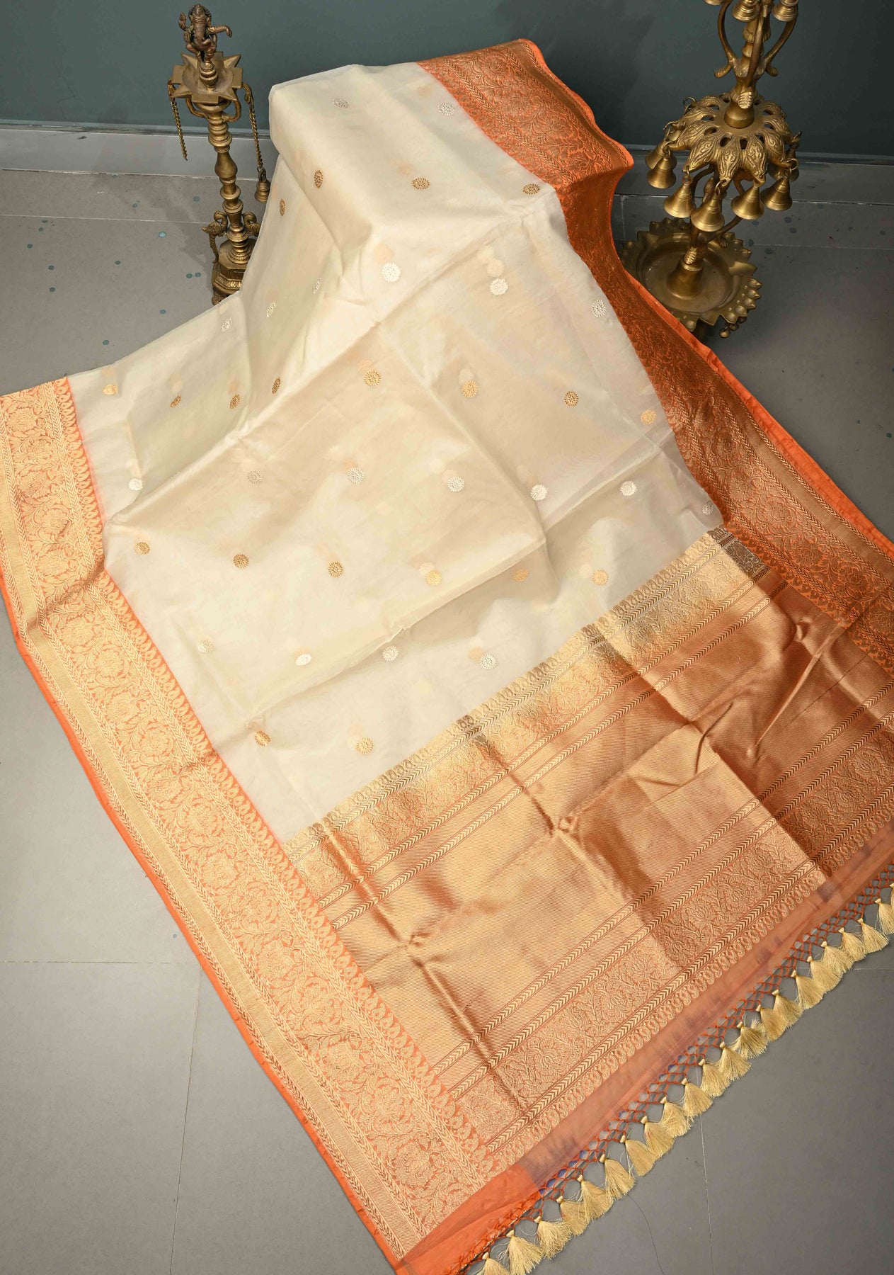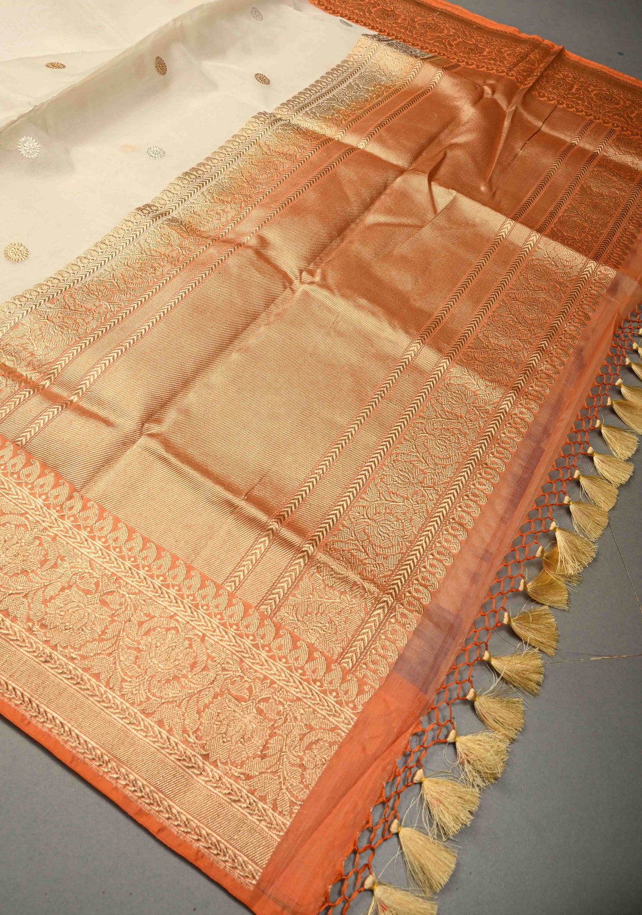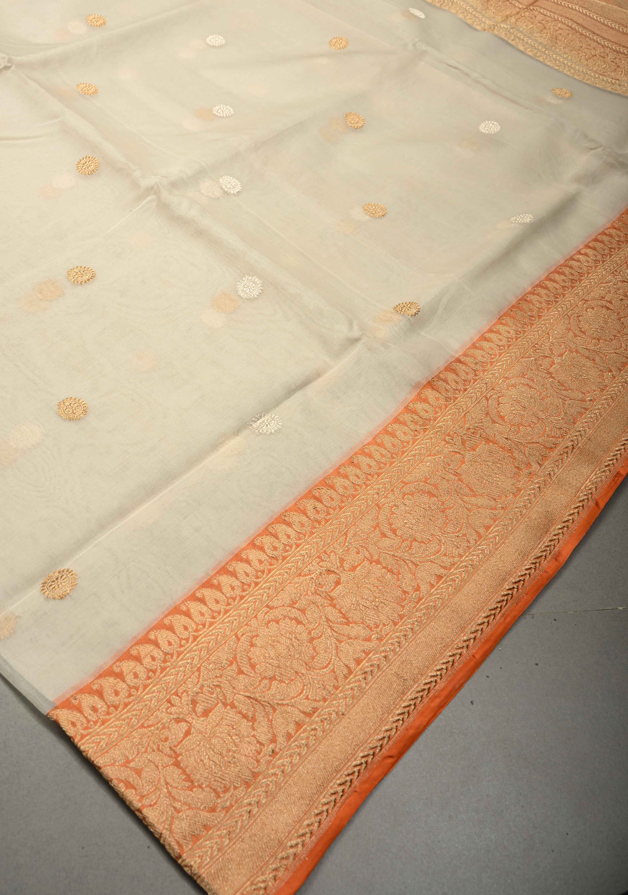 This cream Banarasi Kora silk saree is a timeless classic, exuding elegance and tradition. Crafted from fine Kora silk, the saree features intricate Sona Rupa buttas—golden and silver motifs that enhance its luxurious charm. The soft, lightweight fabric ensures a graceful drape, while the subtle cream hue provides a perfect canvas for the exquisite detailing. A contrast zari border adds a regal touch, creating a stunning visual contrast against the serene base. Ideal for weddings, formal events, and festive occasions, this saree is a perfect blend of heritage craftsmanship and modern sophistication.