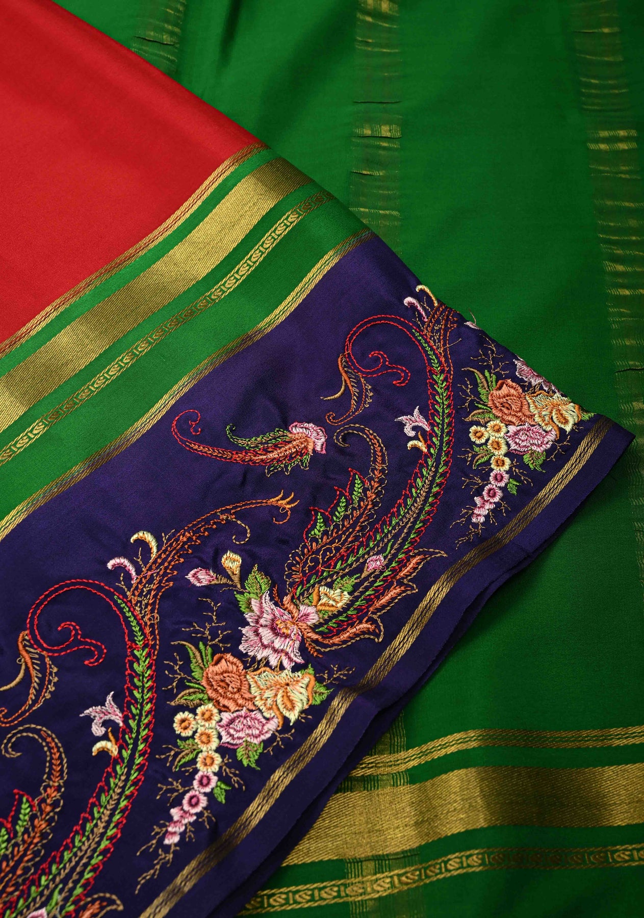 Crimson Red Mysore Silk Saree with Floral Embroidery on Contrast Border | SILK MARK CERTIFIED