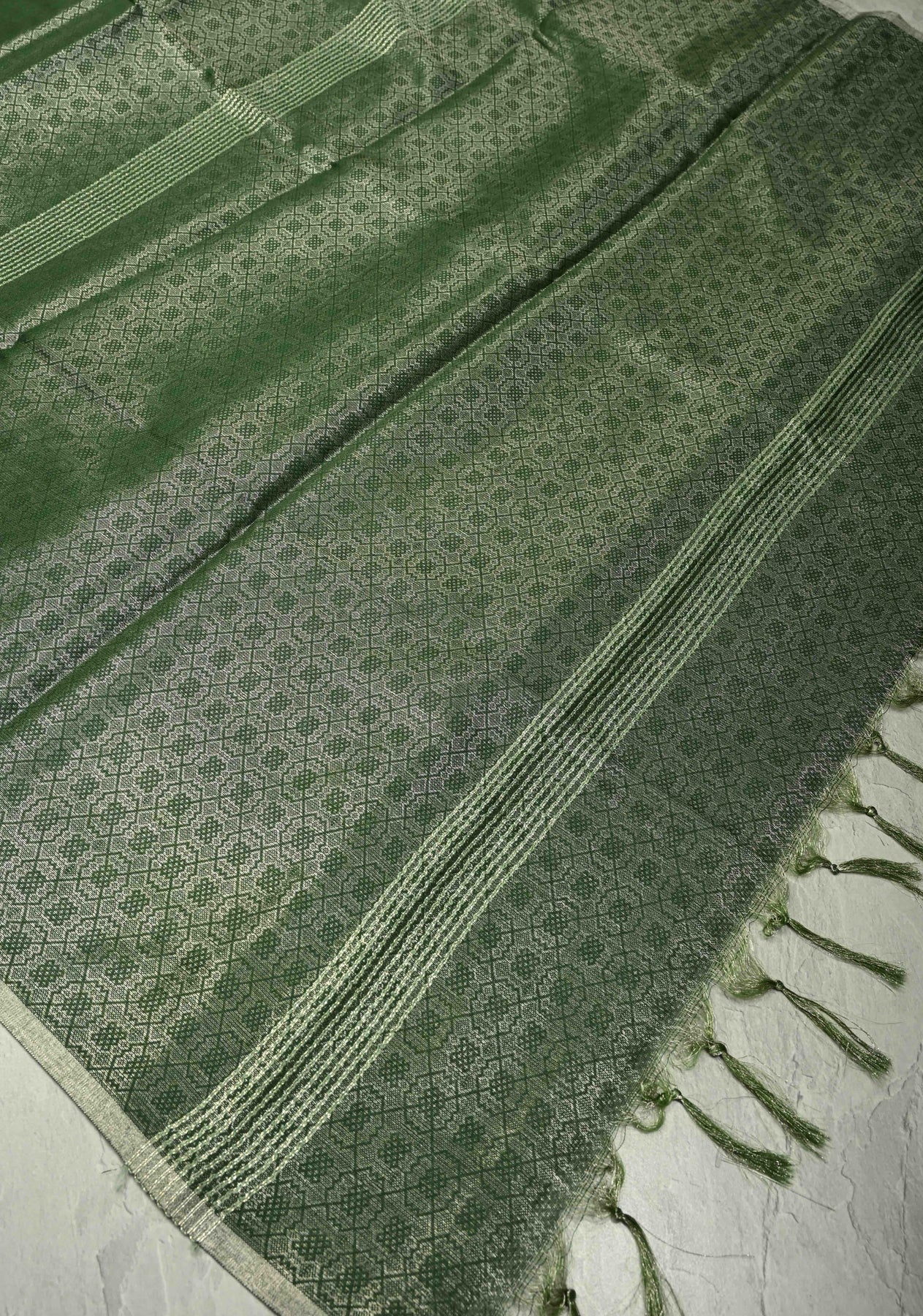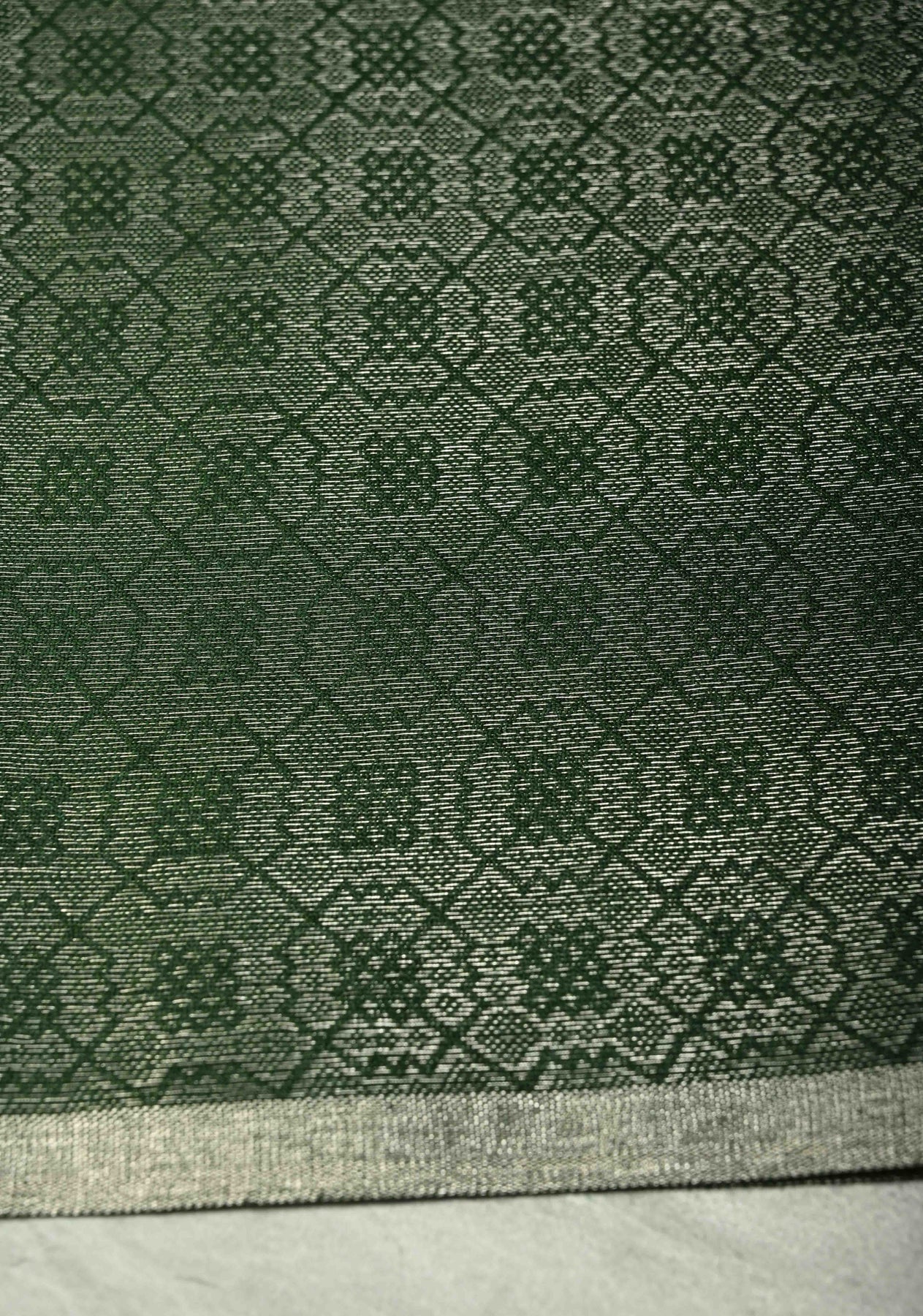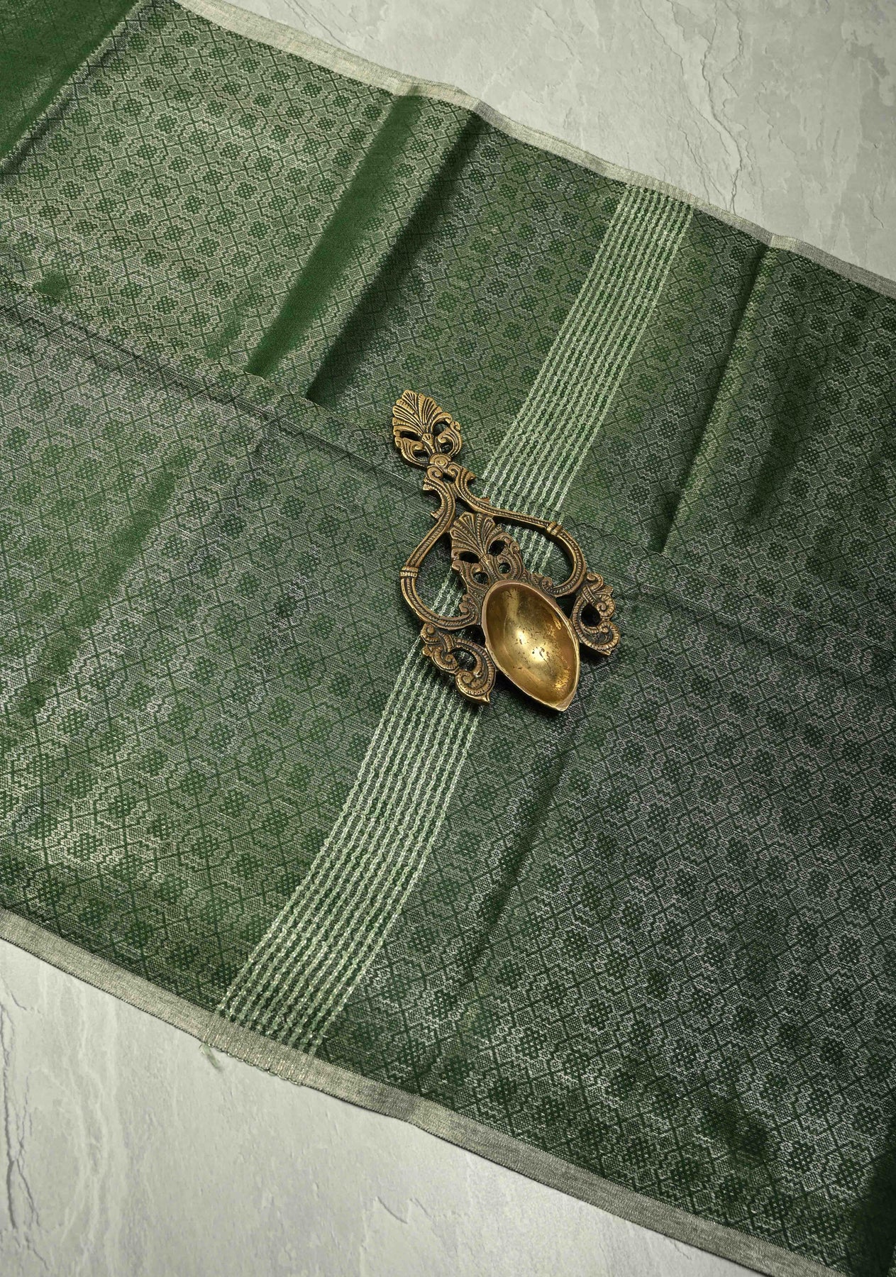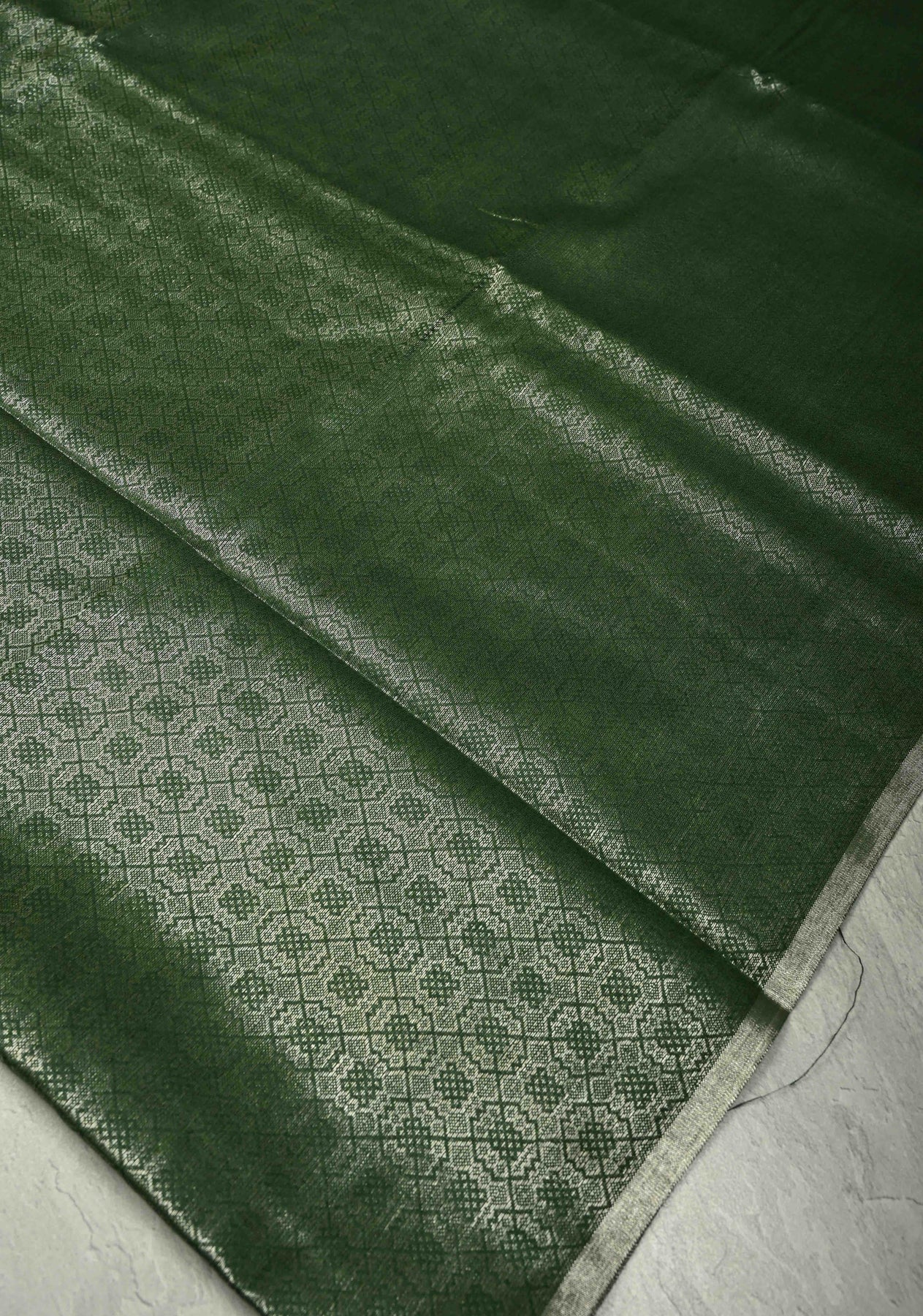 Exude understated elegance with this Deep Green Semi Tussar Saree, crafted from soft, lightweight fabric for a graceful drape. The deep green body is adorned with intricate zari brocade work, adding subtle shimmer and refined texture, while a minimal silver zari border enhances the saree with sophisticated charm. Perfect for weddings, festive occasions, and cultural celebrations, this saree blends traditional artistry with contemporary elegance, making it a timeless addition to your wardrobe.
