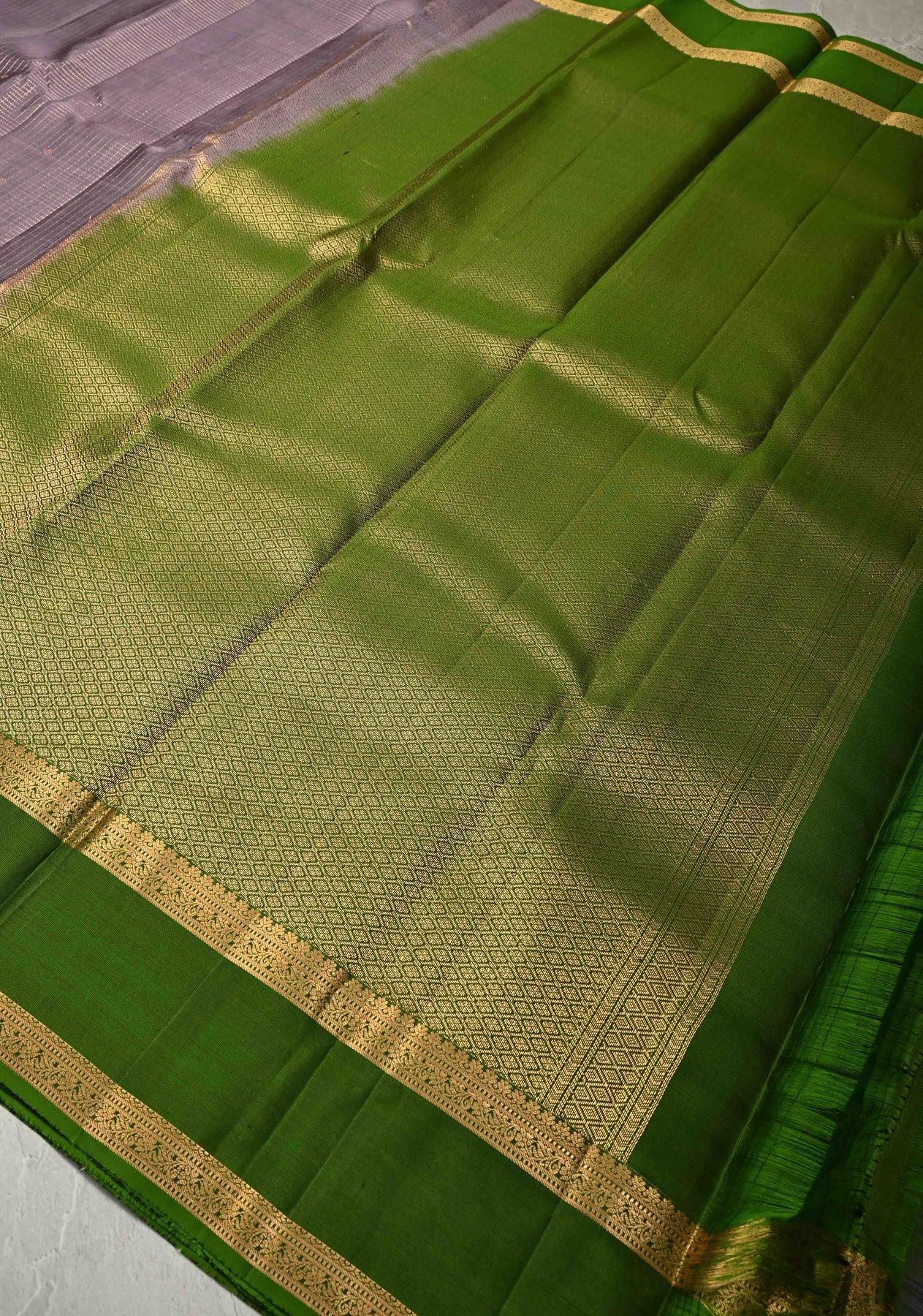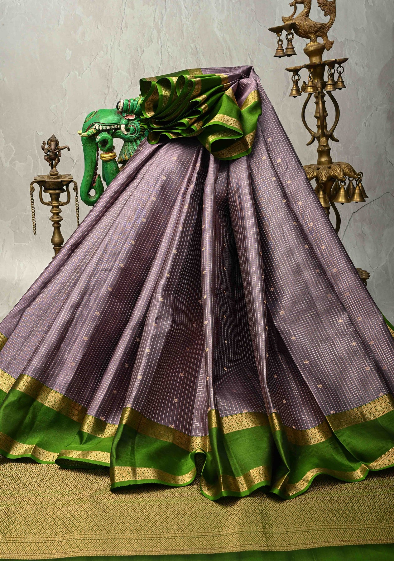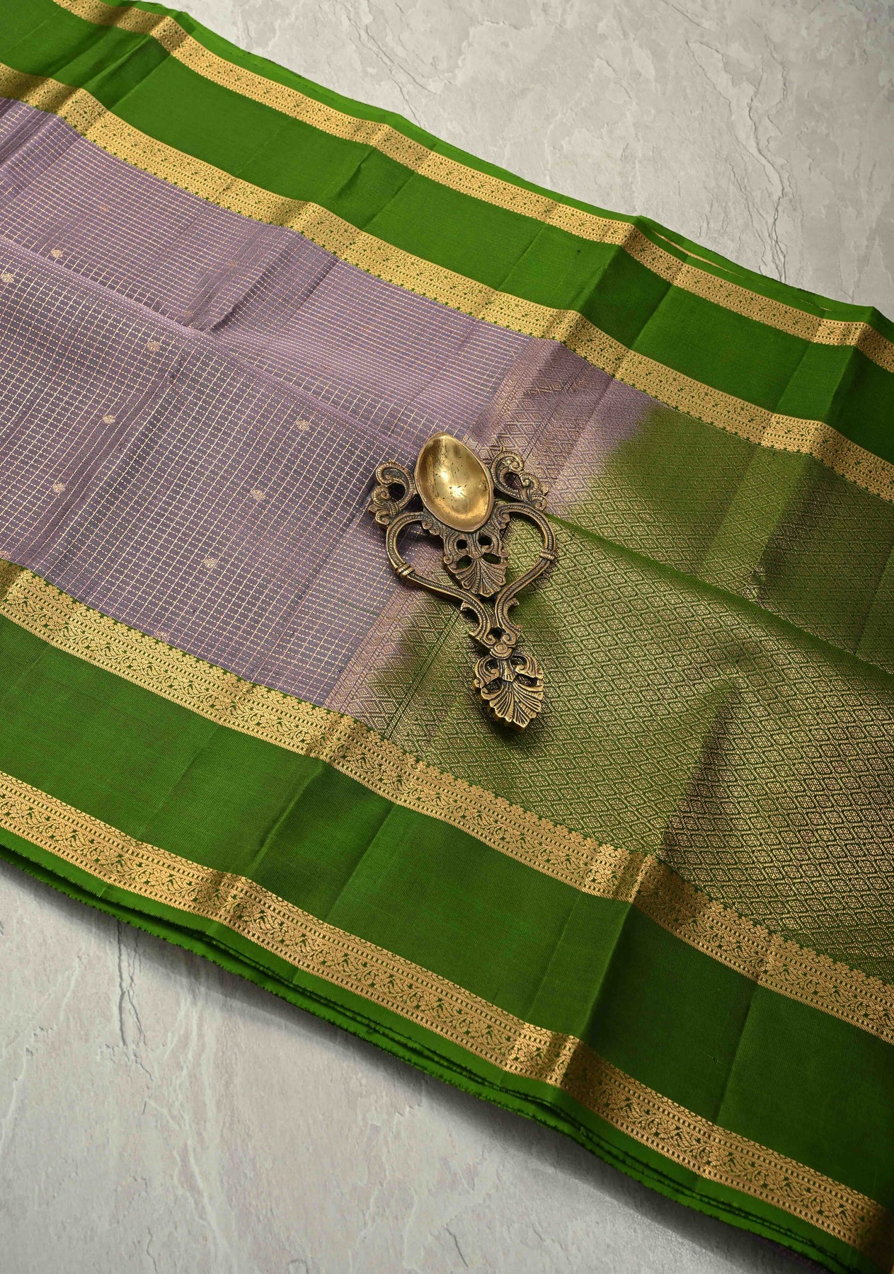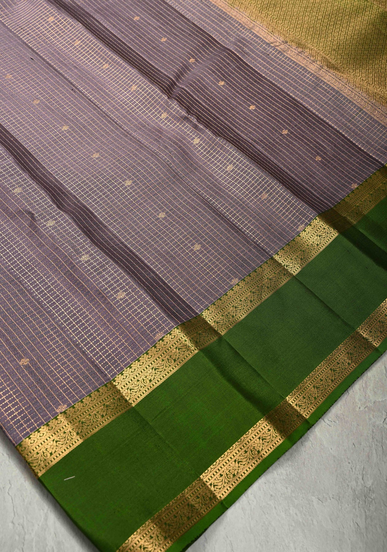 This elegant Dusty Amethyst Kanjivaram soft silk saree beautifully combines traditional craftsmanship with subtle sophistication. The saree features intricate Podi-Kattam zari checks across the body, complemented by delicate zari buttis that add shimmer and texture. Its contrasting Rettaipet zari border enhances the overall design, creating a striking yet balanced look. Woven in soft silk, the dusty amethyst hue lends a graceful, understated charm. Perfect for weddings, festive occasions, and special celebrations, this saree drapes effortlessly, reflecting timeless South Indian heritage.