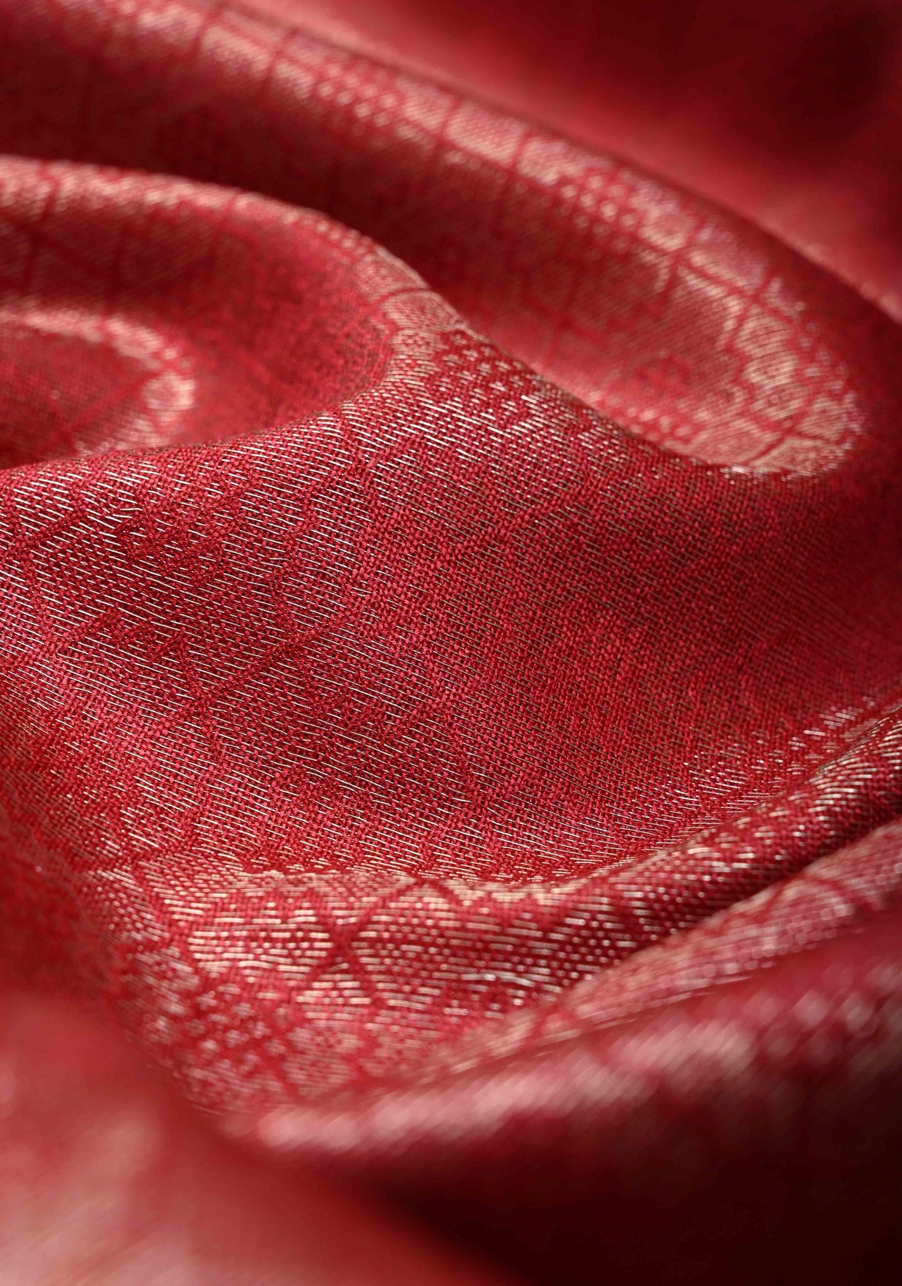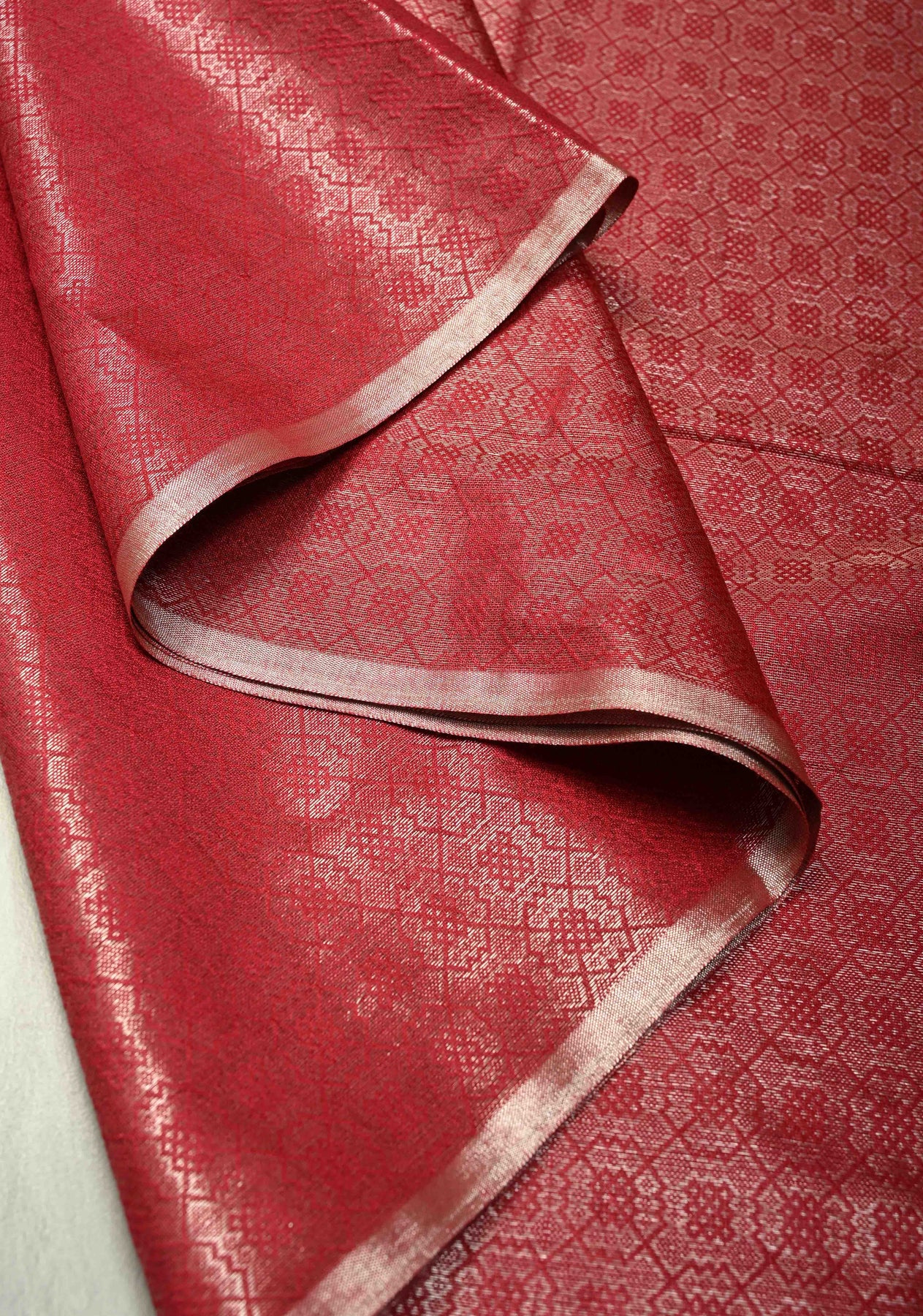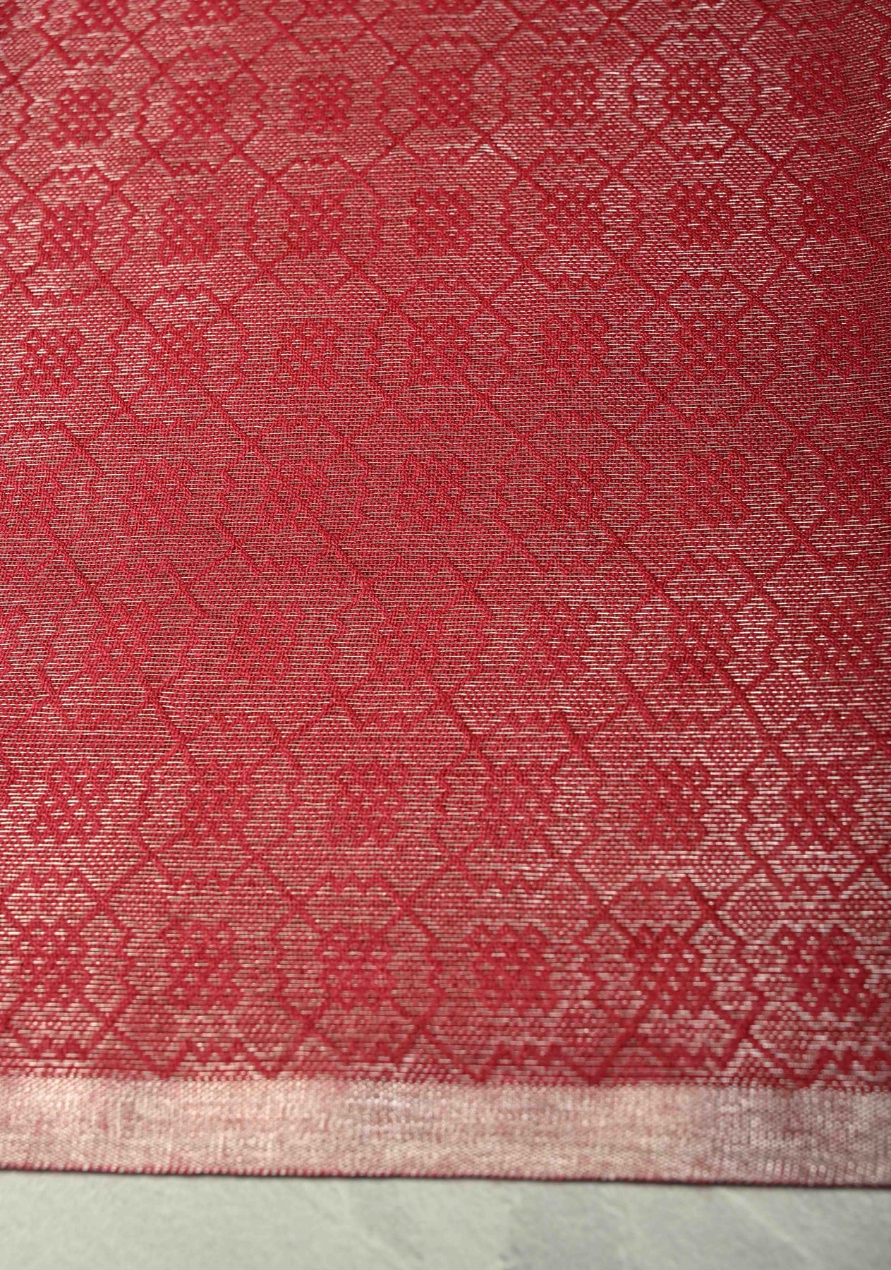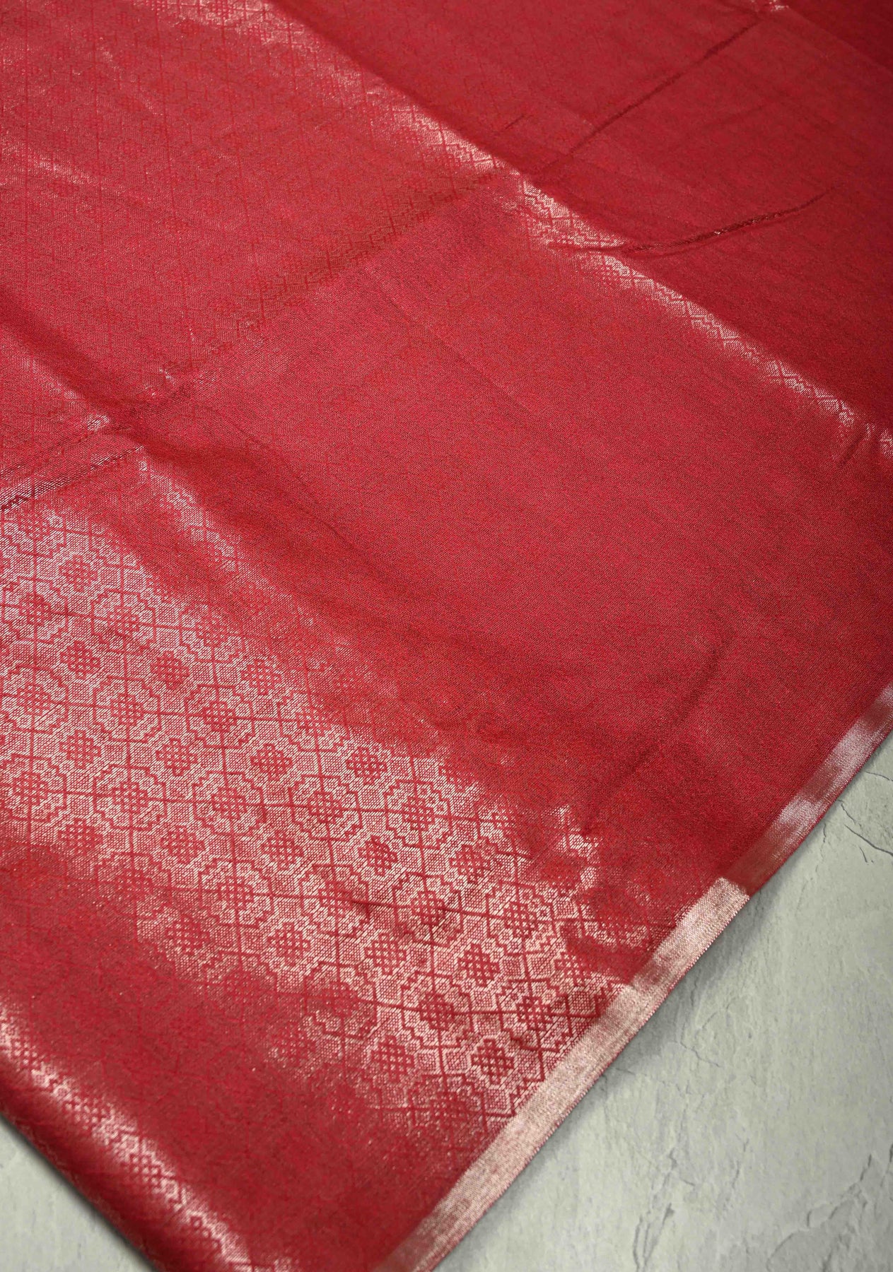 Turn heads with this Red Semi Tussar Saree, crafted from soft, lightweight fabric for a graceful drape. The vibrant flame red body features intricate brocade work, adding shimmer and sophisticated texture, while a minimal silver zari border provides subtle elegance. Perfect for weddings, festive occasions, and cultural celebrations, this saree combines traditional craftsmanship with contemporary style, making it a statement piece for any special event.