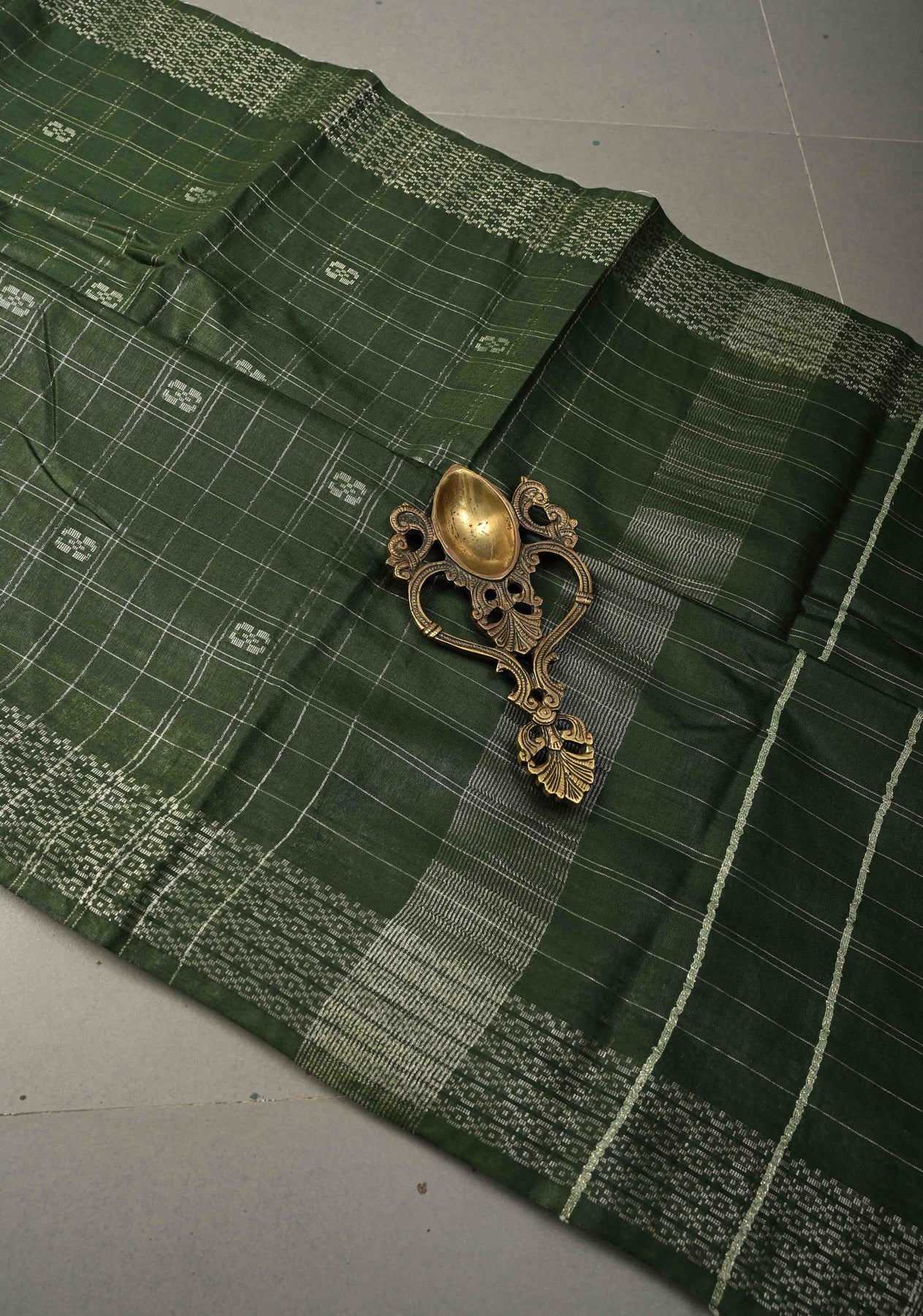 The Forest Green Zari Checks on Semi Tussar Saree with Zari Buttas and Zari Border is a perfect combination of rich color and intricate design. The forest green semi-tussar fabric provides an elegant and earthy base, while the zari checks woven throughout the saree add texture and a subtle gleam. Scattered zari buttas lend a refined touch, enhancing the overall design with their detailed craftsmanship. The zari border beautifully frames the saree, adding a luxurious finish. Ideal for weddings, festive events, or evening gatherings, this saree offers a sophisticated, timeless look with a modern twist, making it an exceptional choice for any special occasion.