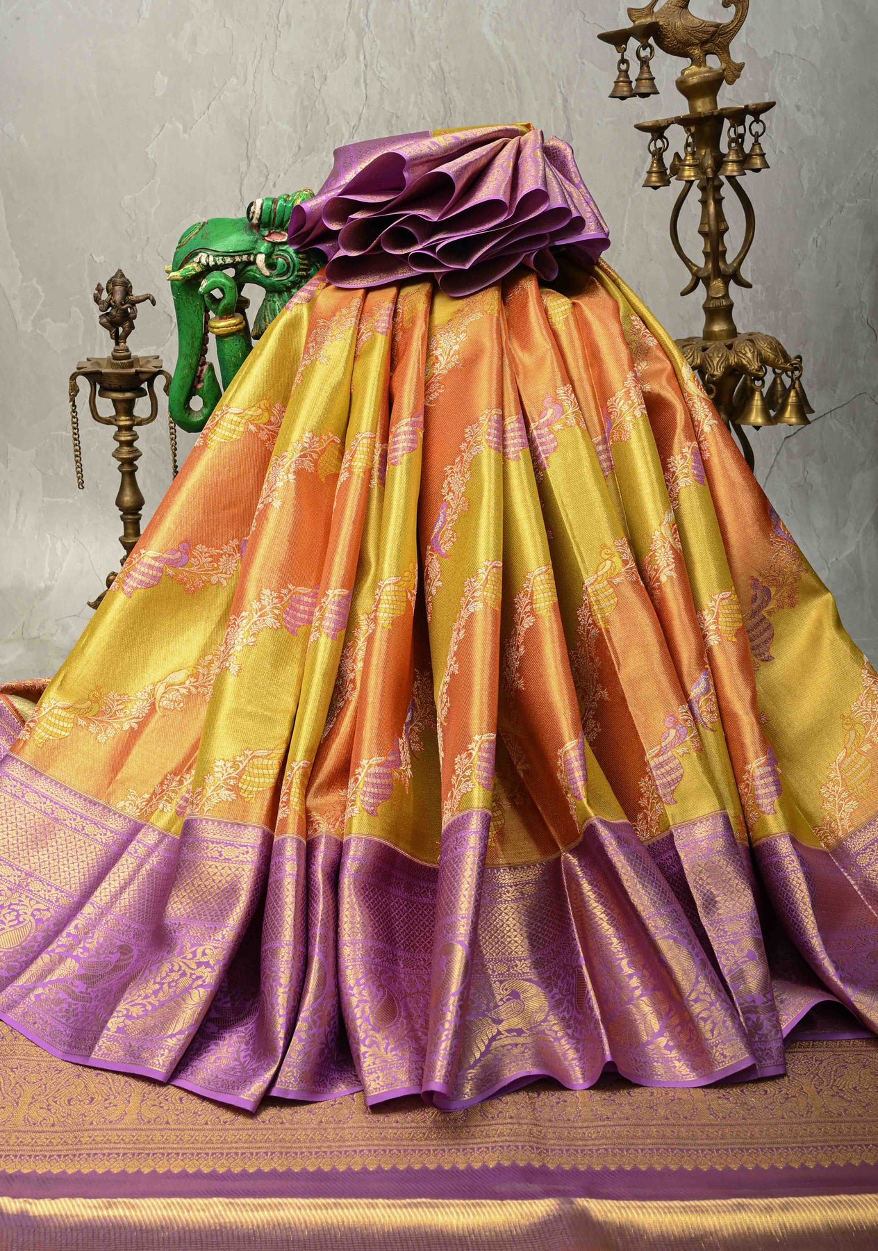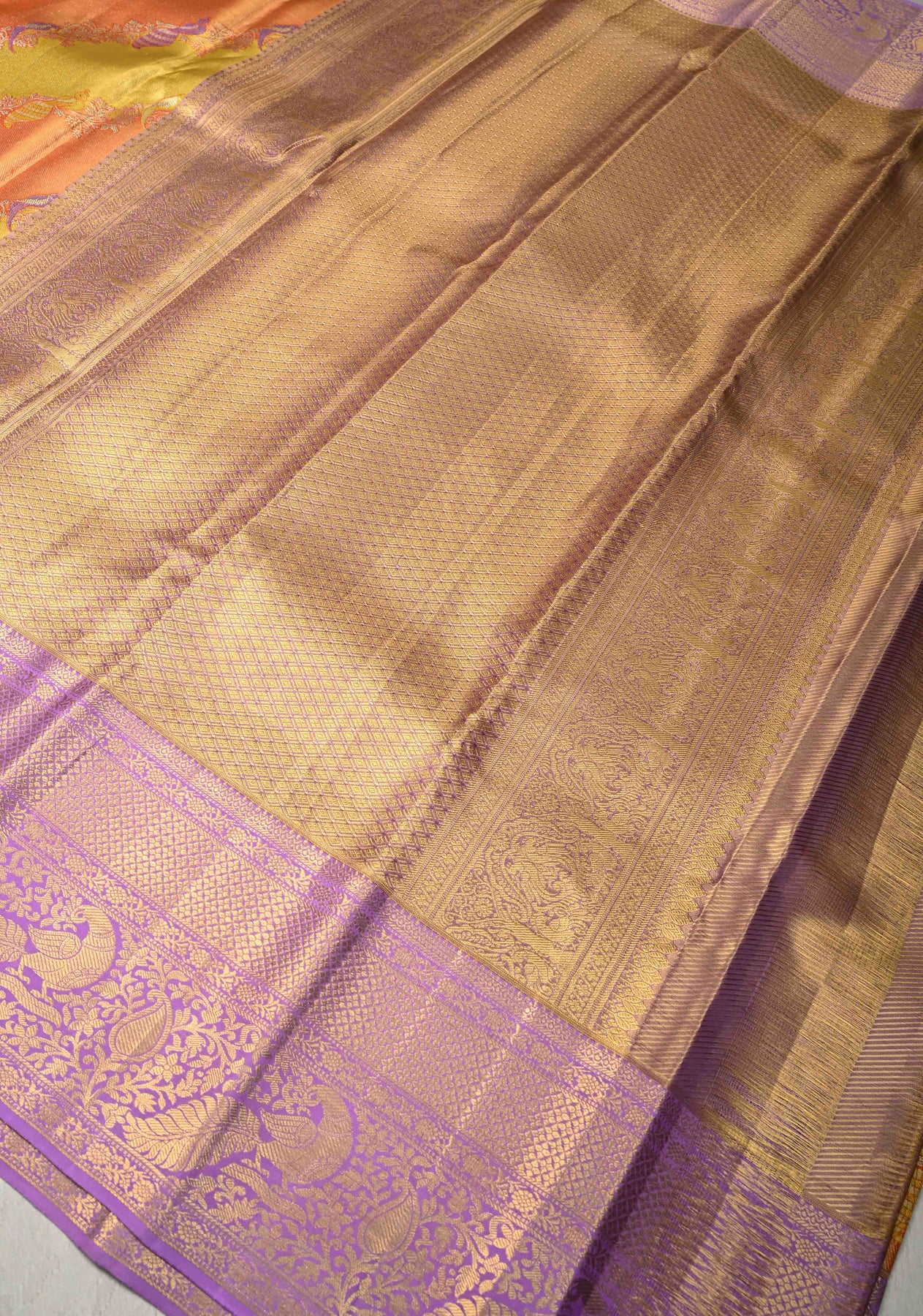 This magnificent Gold-Orange Leheria design pure Kanjivaram tissue silk saree is a radiant blend of tradition and artistry. The shimmering tissue silk body features flowing Leheria-inspired patterns enriched with intricate Meenakari floral and bird stripes, creating a dynamic yet elegant visual appeal. The vibrant Meenakari detailing adds depth and color to the saree, while the richly woven contrast zari border enhances its regal charm. Finished with a beautifully crafted zari pallu, this saree is an exceptional choice for weddings, festive occasions, and grand celebrations that call for timeless Kanjivaram elegance.