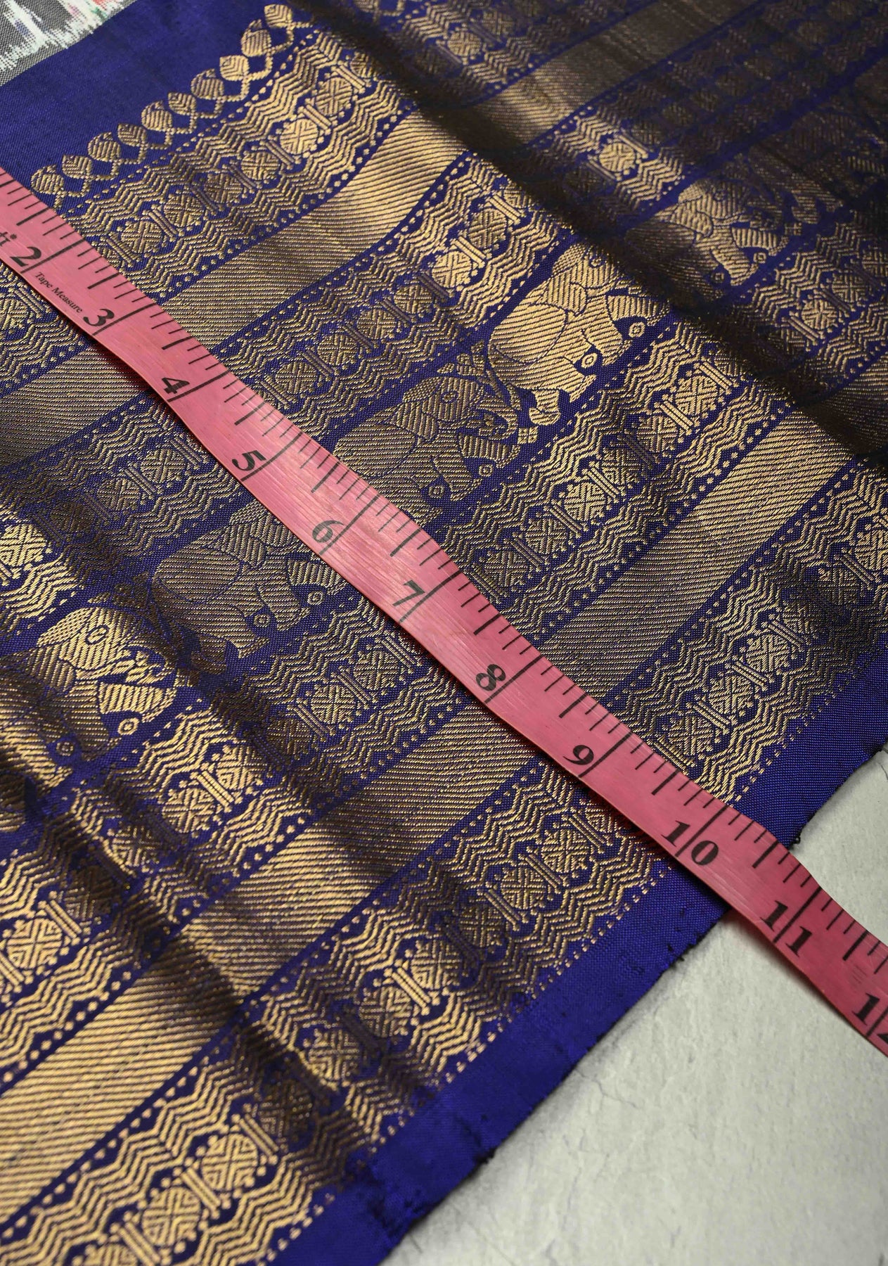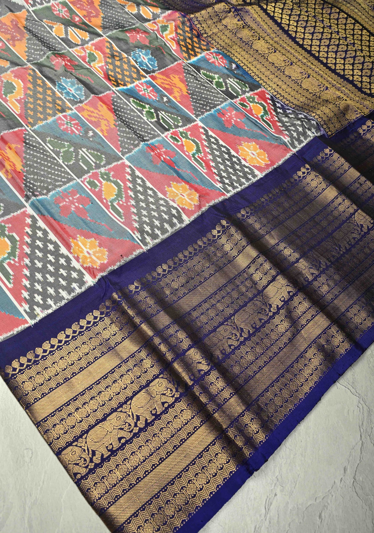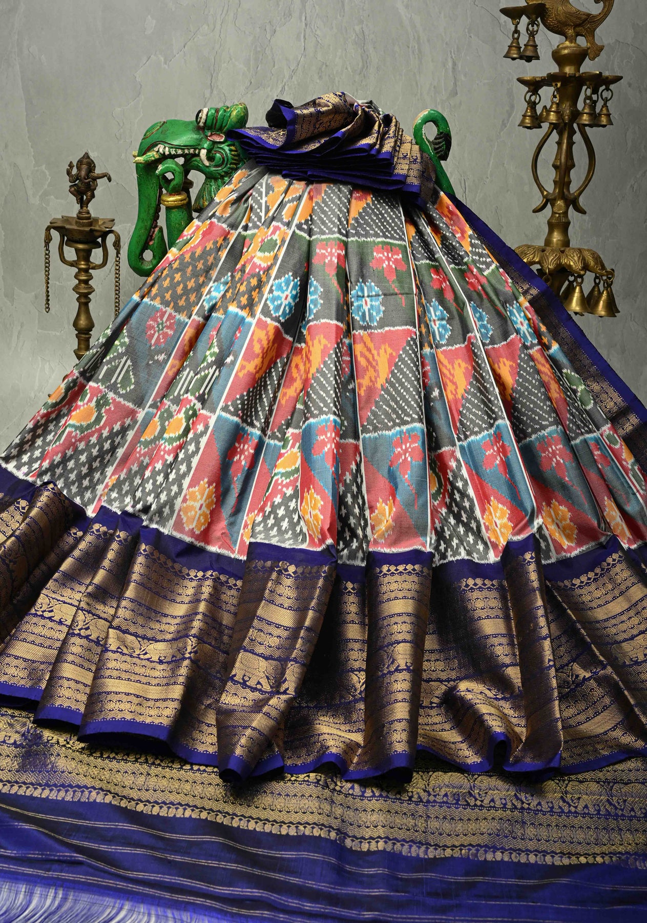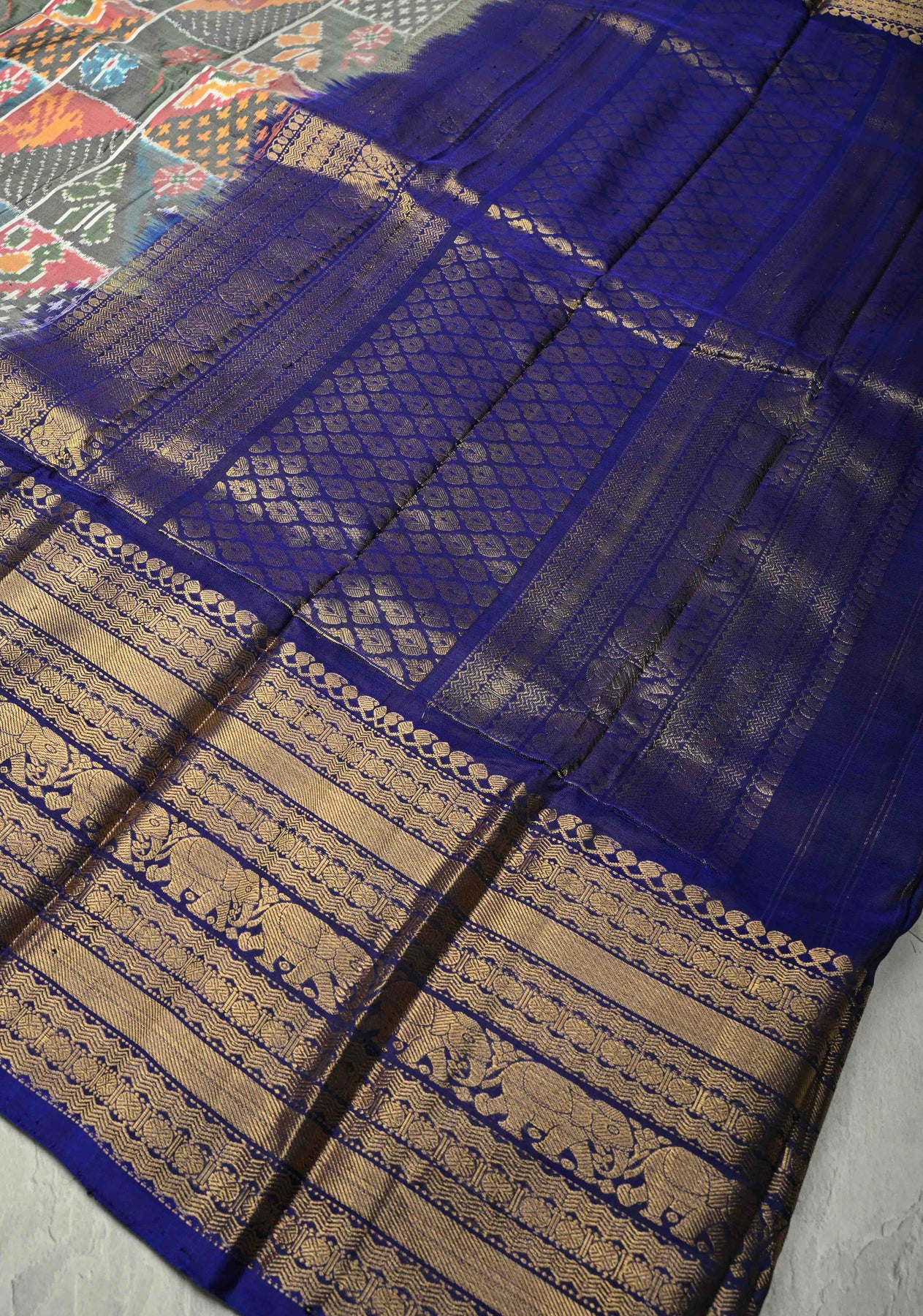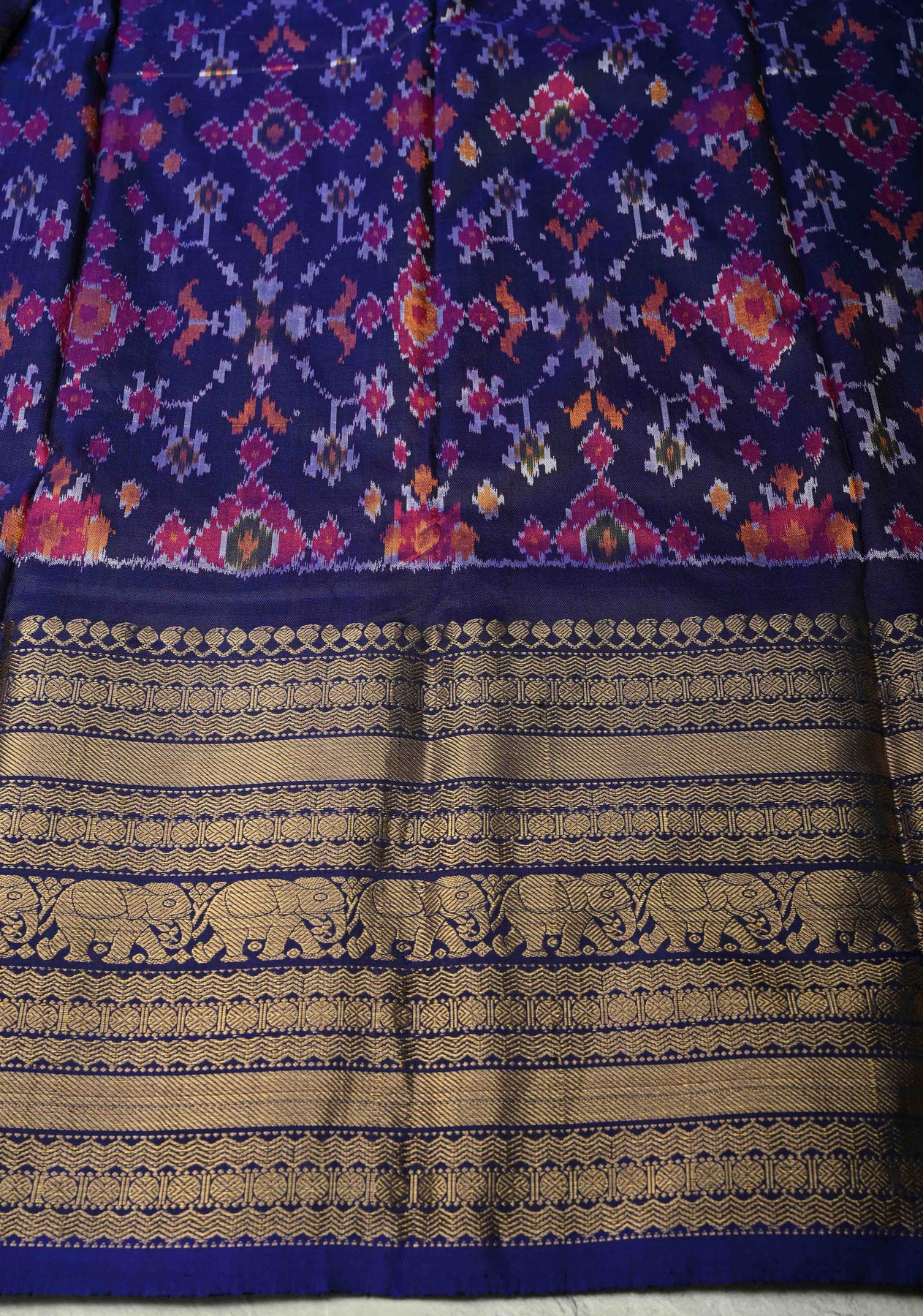 The saree showcases a Patola-inspired design woven throughout, beautifully complemented by the bold Ikkat patterns, creating a striking visual appeal. A contrast wide zari border enhances the elegance, adding a regal finish and highlighting the fusion of modern and traditional craftsmanship.