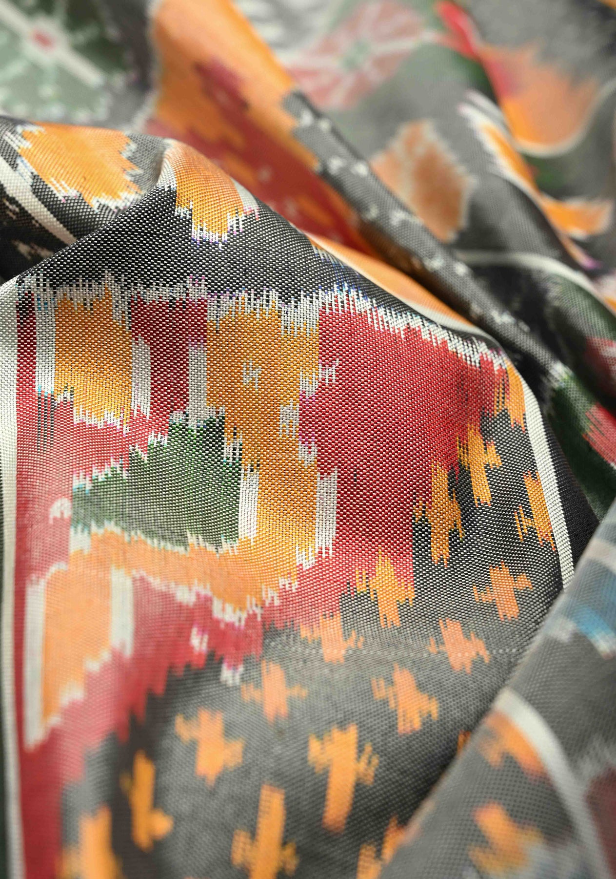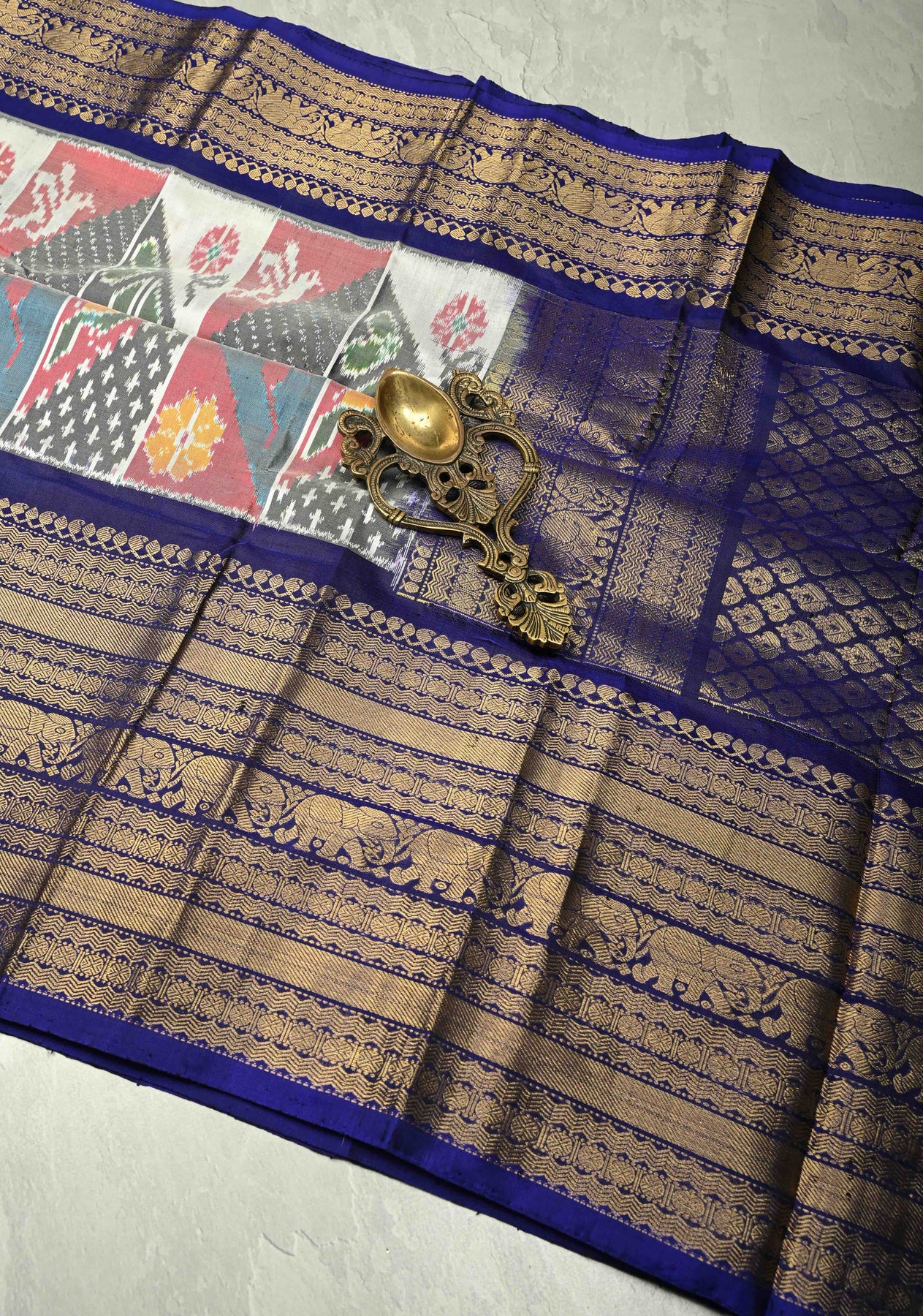Celebrate a perfect blend of tradition and contemporary artistry with this Multicolor Ikkat Kanjivaram Fusion Silk Saree, crafted from silk that offers a soft texture, drape, and lustrous sheen. Ideal for weddings, festive occasions, and grand celebrations, this saree stands out with its vibrant colors and intricate designs.