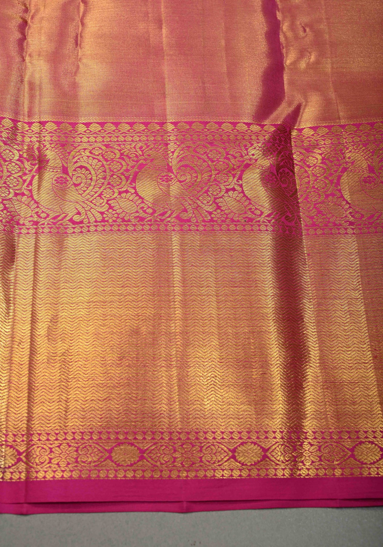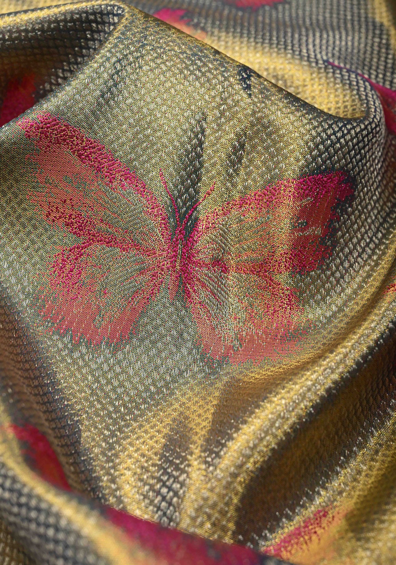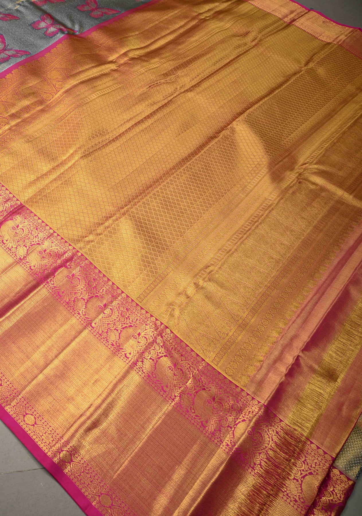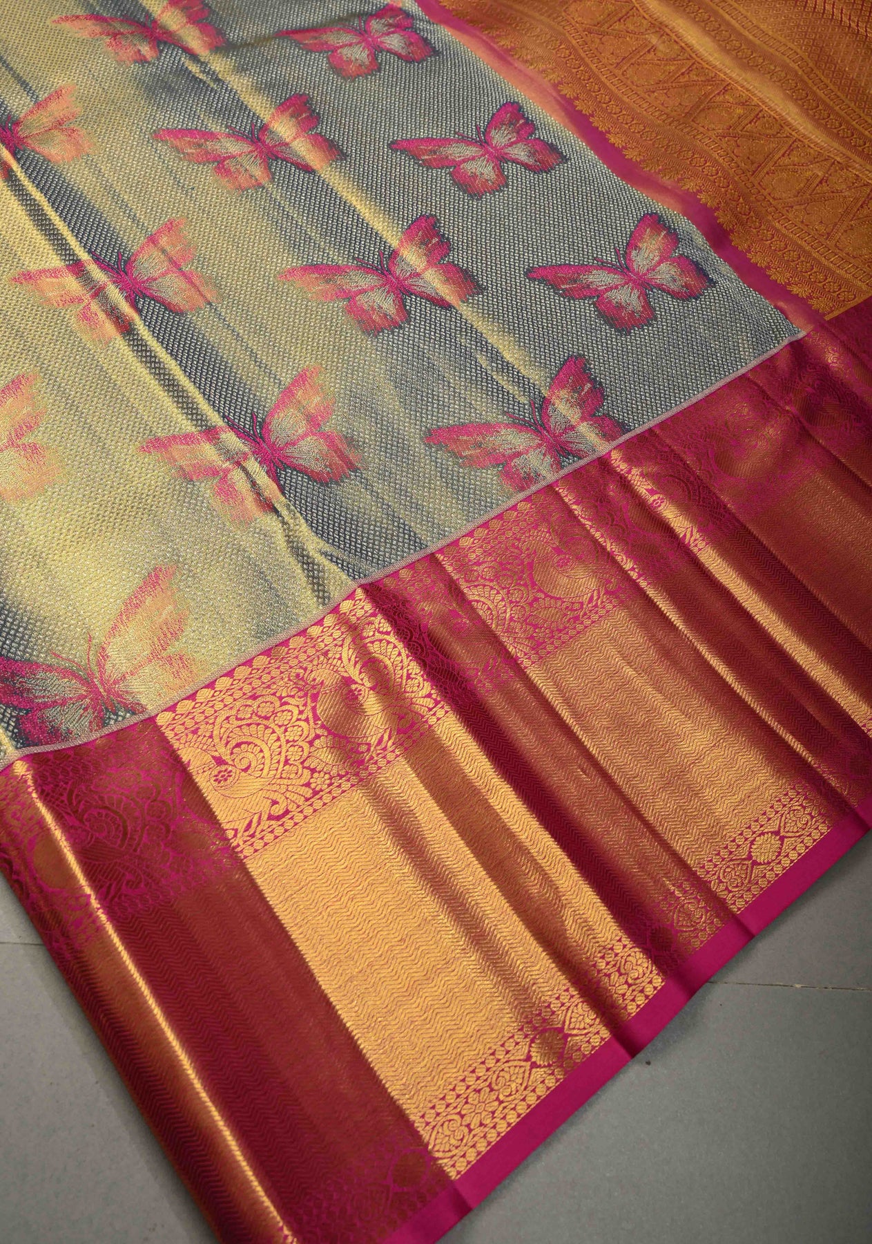 The exquisite green–blue dual tone body is adorned with intricate Meenakari butterfly motifs, symbolizing beauty and transformation, and adding vibrant artistic detail to the weave. A striking contrast zari border frames the saree beautifully, lending depth and grandeur, while the classic Kanjivaram pallu completes the look with heritage elegance. Perfect for weddings, festive celebrations, receptions, and special occasions, this saree is a true statement of refined luxury.