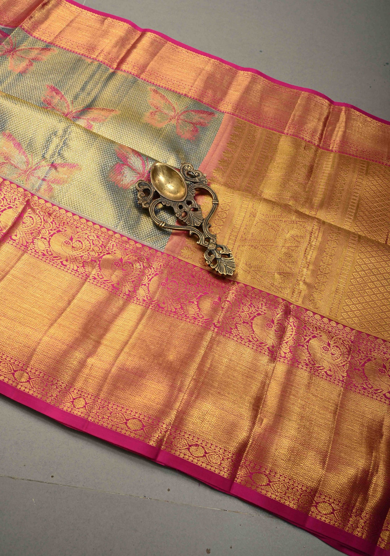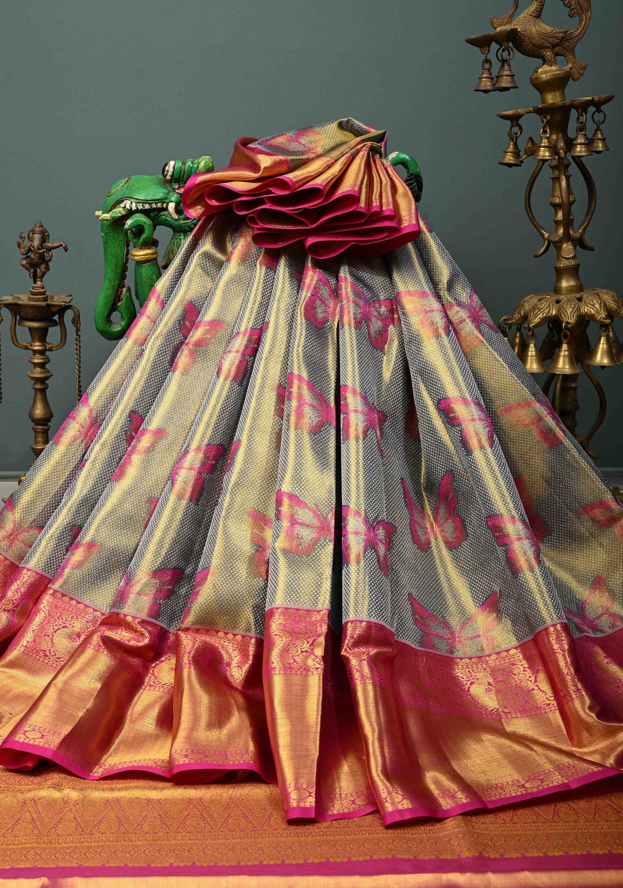 Green-Blue Dual Tone Tissue Kanjivaram Pure Silk Saree with Meenakari Butterfly and Zari Border | SILK MARK CERTIFIED