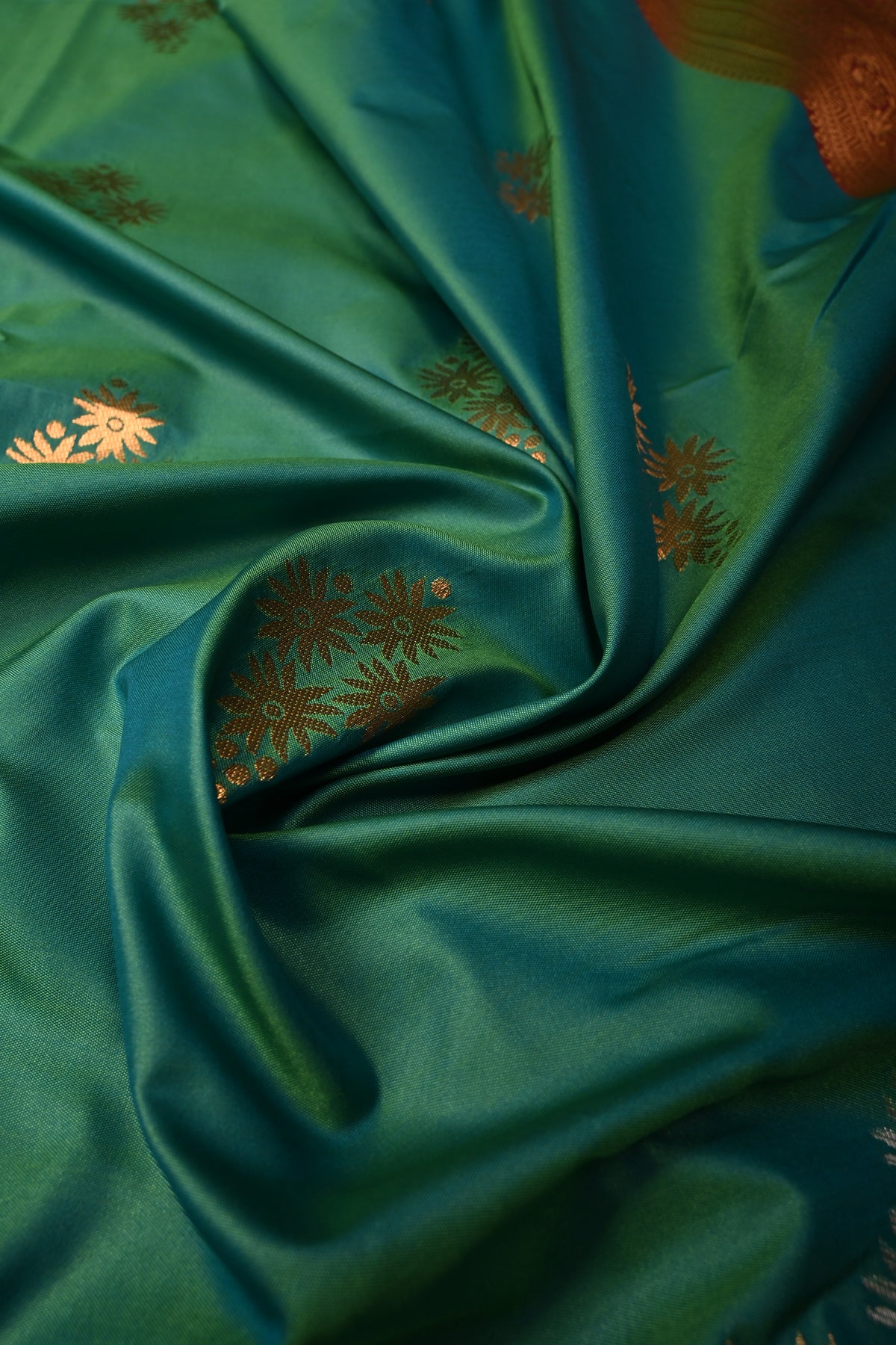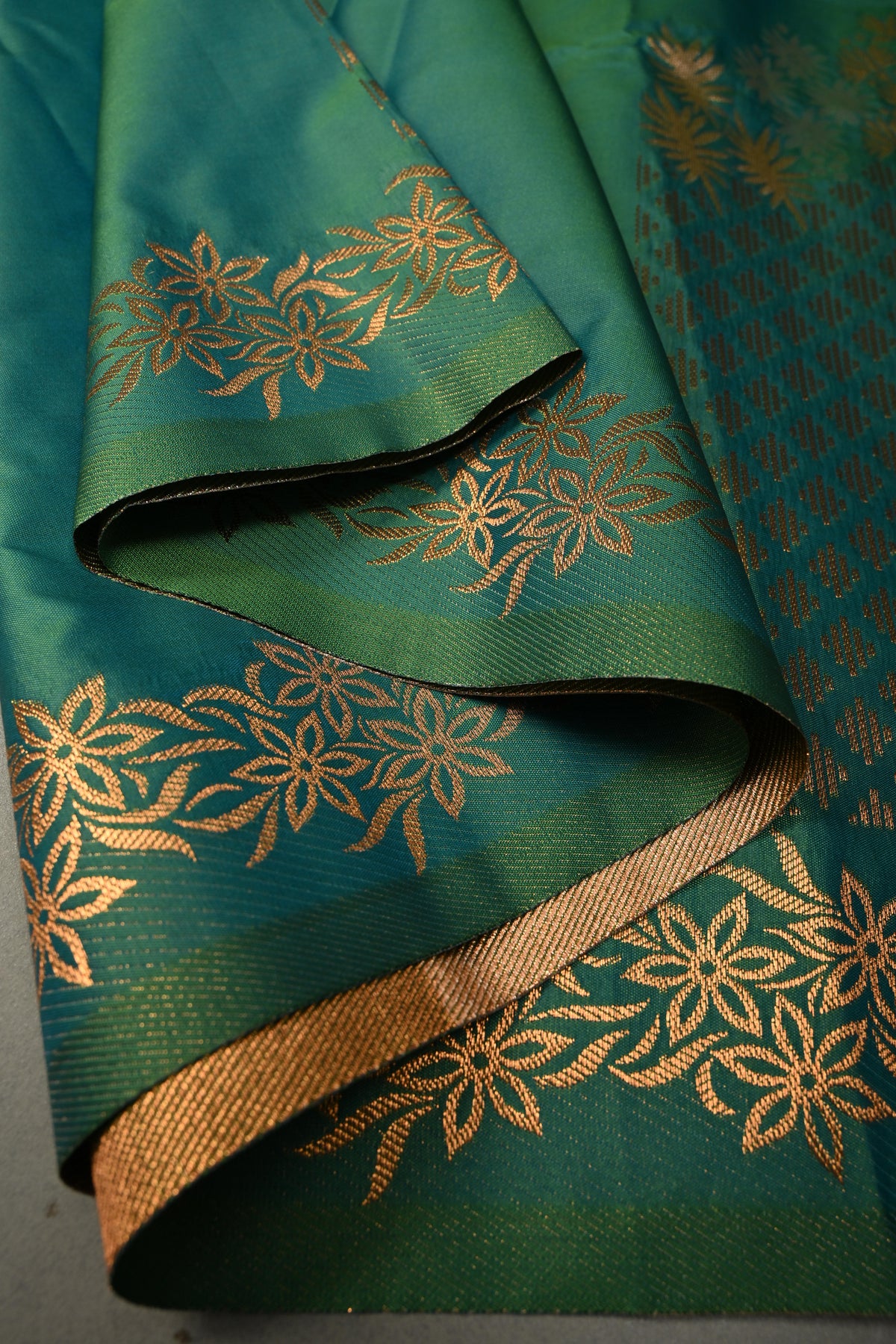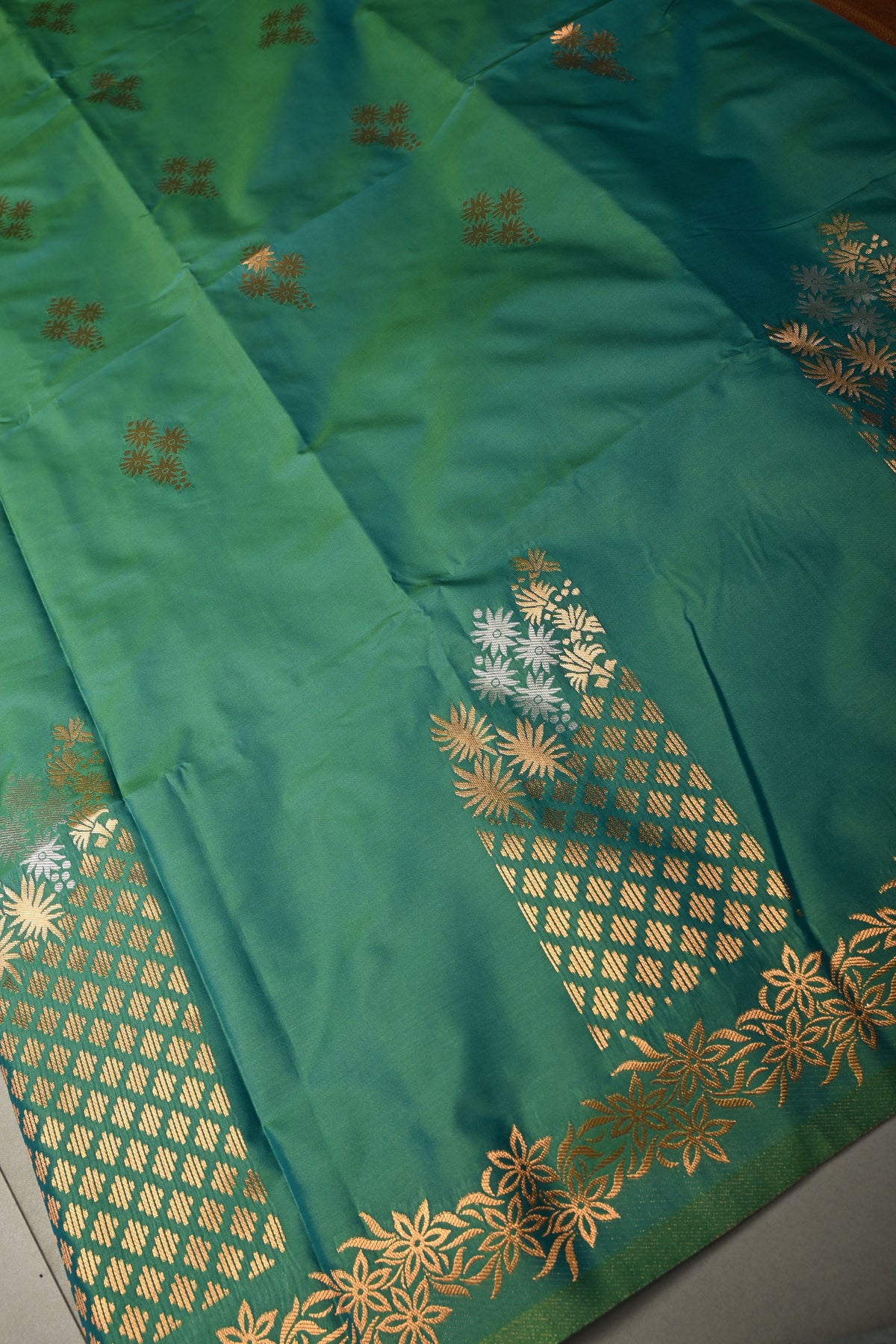 Enhance your festive wardrobe with this exquisite Green Dual Tone Kanchi Semi Silk Saree, combining traditional elegance with contemporary charm. The saree features a stunning dual-tone green body that shimmers beautifully with every movement, adorned with delicate floral zari buttas that add a subtle sparkle and timeless appeal. Crafted from semi silk, it provides the luxurious feel of silk while remaining lightweight and comfortable to drape. The saree is further elevated with a striking border embellished with intricate gold and silver motifs, adding a regal and sophisticated finish. Perfect for weddings, festive occasions, and cultural celebrations, this saree effortlessly blends classic Kanchipuram-inspired craftsmanship with graceful modern style.