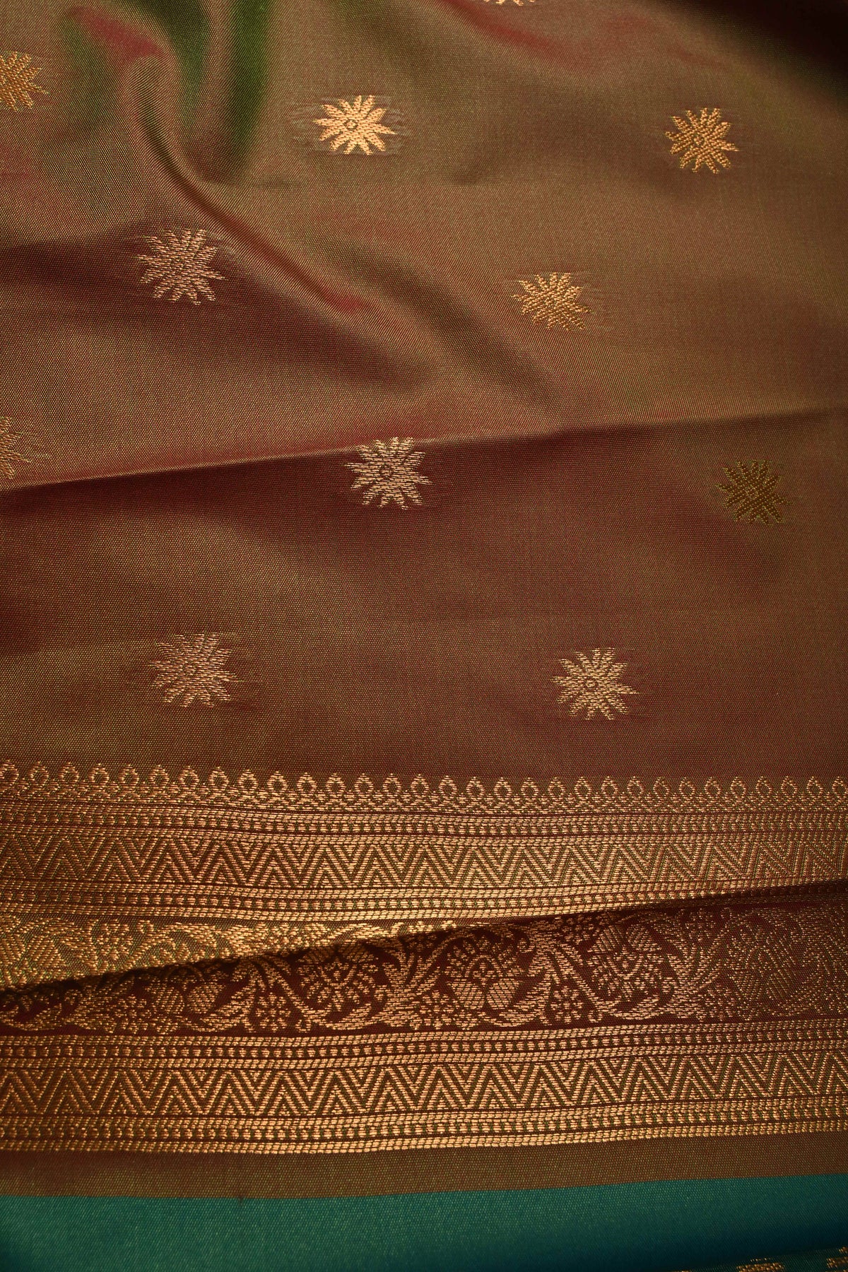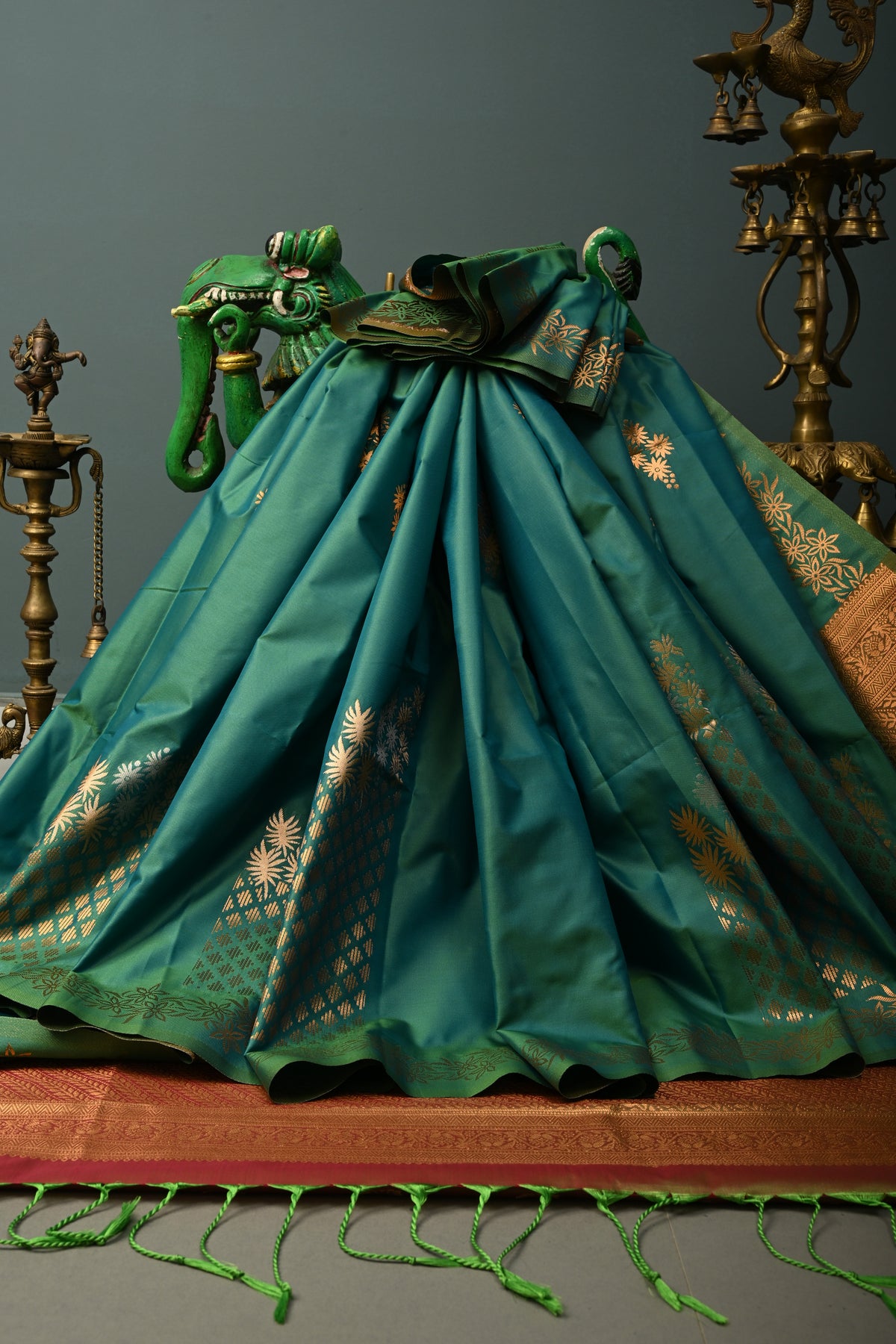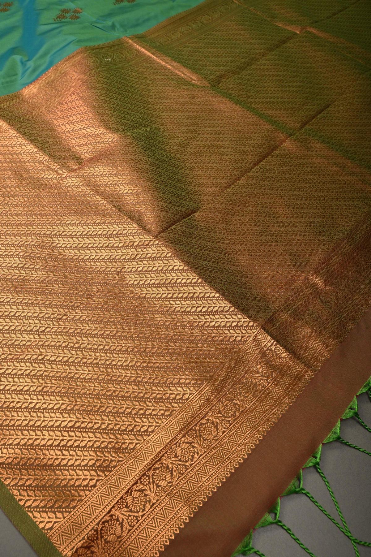 Enhance your festive wardrobe with this exquisite Green Dual Tone Kanchi Semi Silk Saree, combining traditional elegance with contemporary charm. The saree features a stunning dual-tone green body that shimmers beautifully with every movement, adorned with delicate floral zari buttas that add a subtle sparkle and timeless appeal. Crafted from semi silk, it provides the luxurious feel of silk while remaining lightweight and comfortable to drape. The saree is further elevated with a striking border embellished with intricate gold and silver motifs, adding a regal and sophisticated finish. Perfect for weddings, festive occasions, and cultural celebrations, this saree effortlessly blends classic Kanchipuram-inspired craftsmanship with graceful modern style.