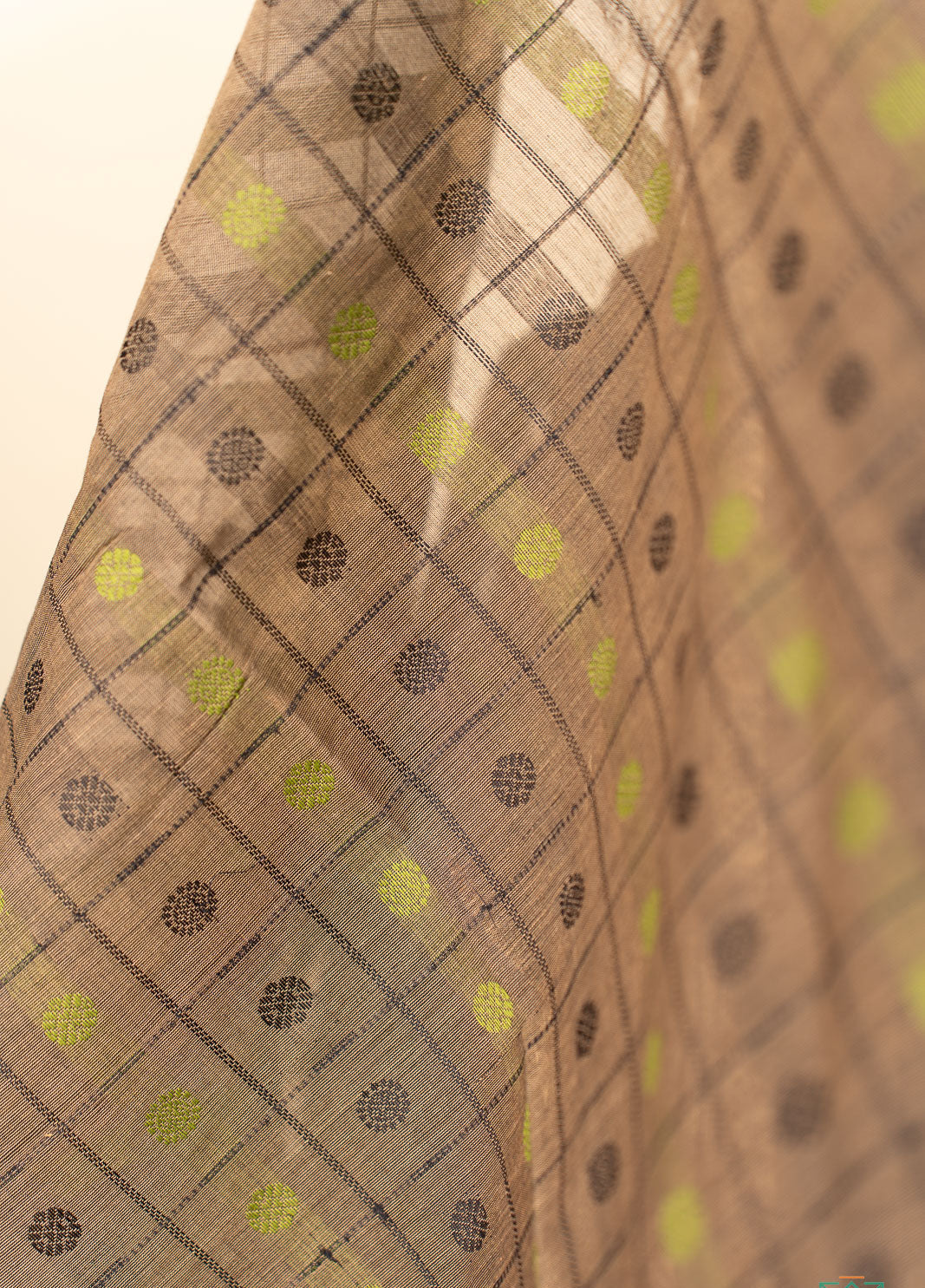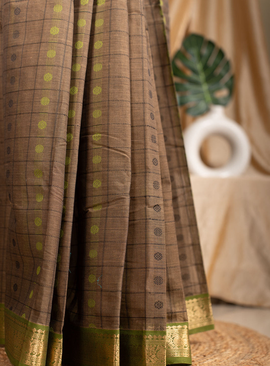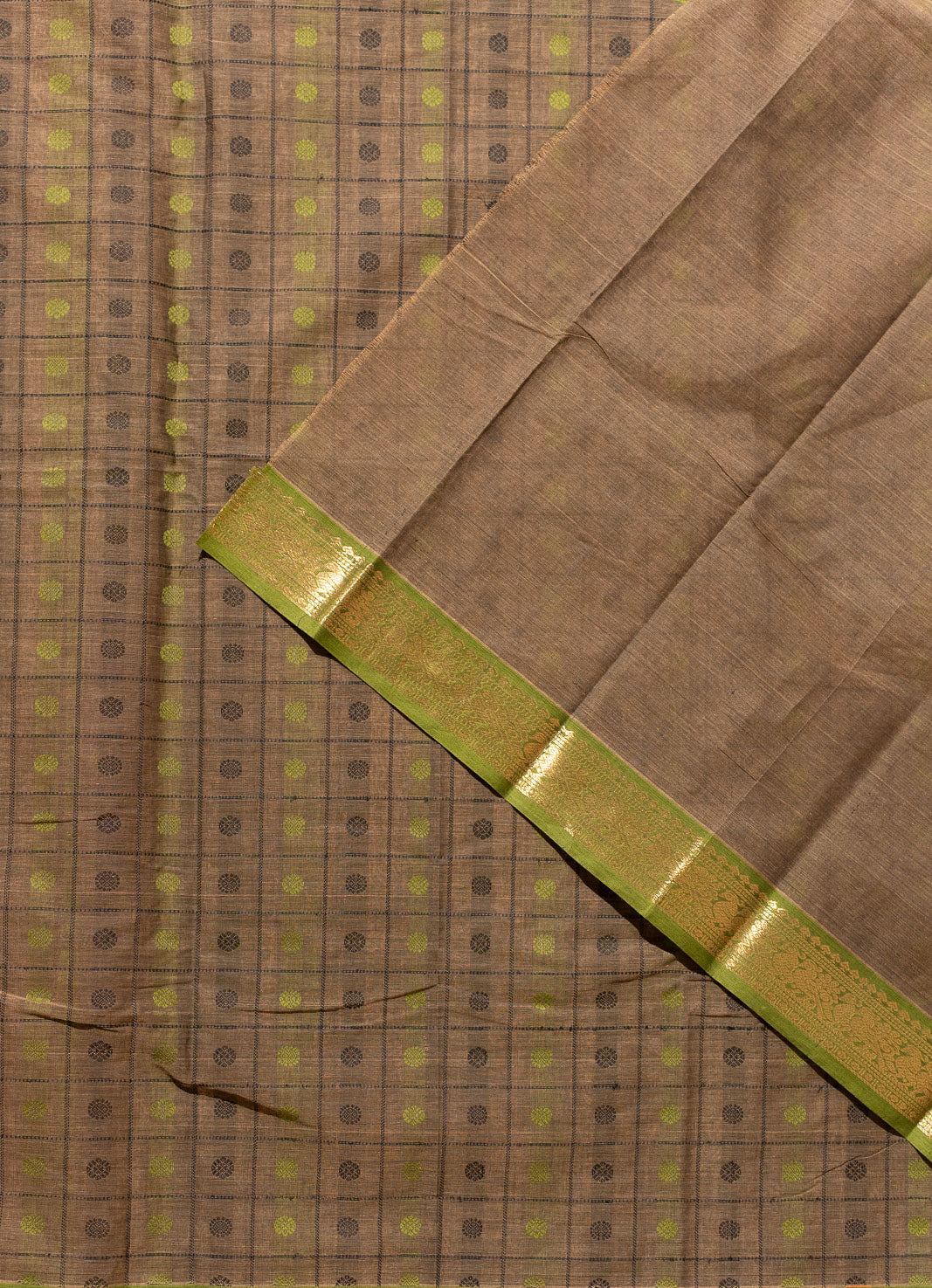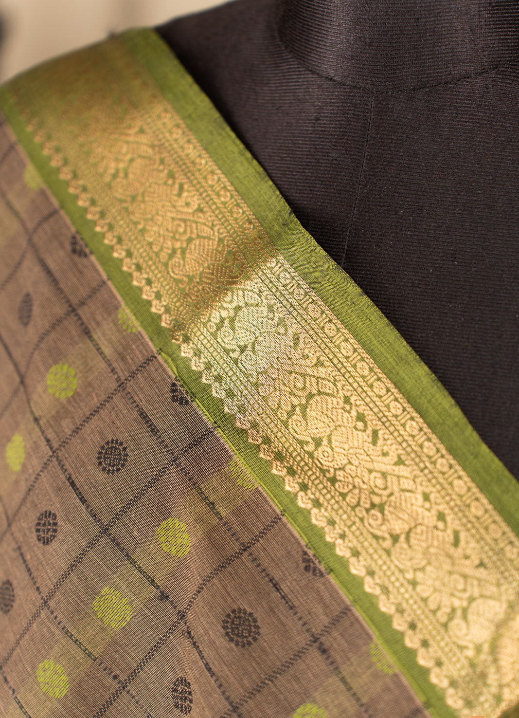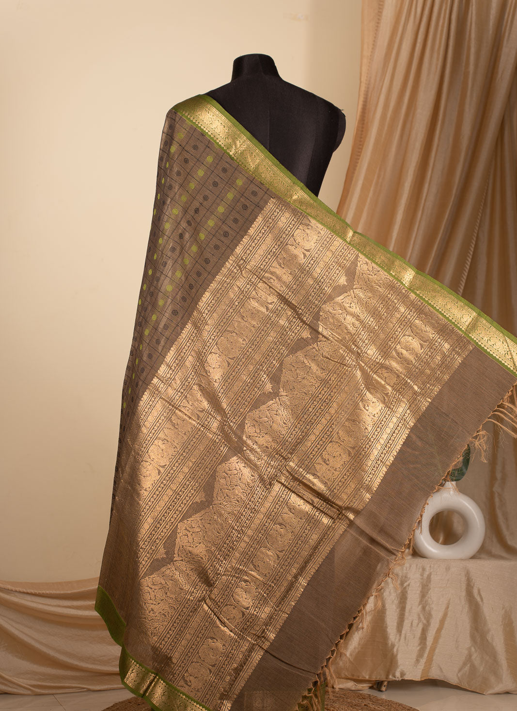 A rare blend of subtlety and grandeur, this 1000 Butta Kanchi Cotton Saree in an uncommon shade of grey is a true handloom treasure. The body is adorned with Chakram motifs — symbolizing completeness and divinity — woven in an alternating pattern of green and black, creating a harmonious rhythm across the drape.