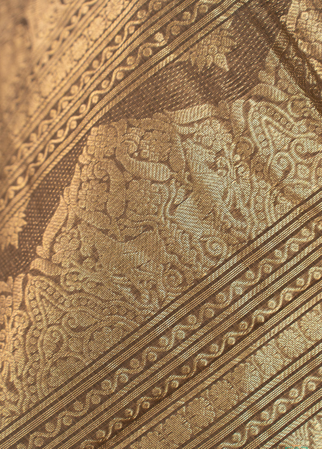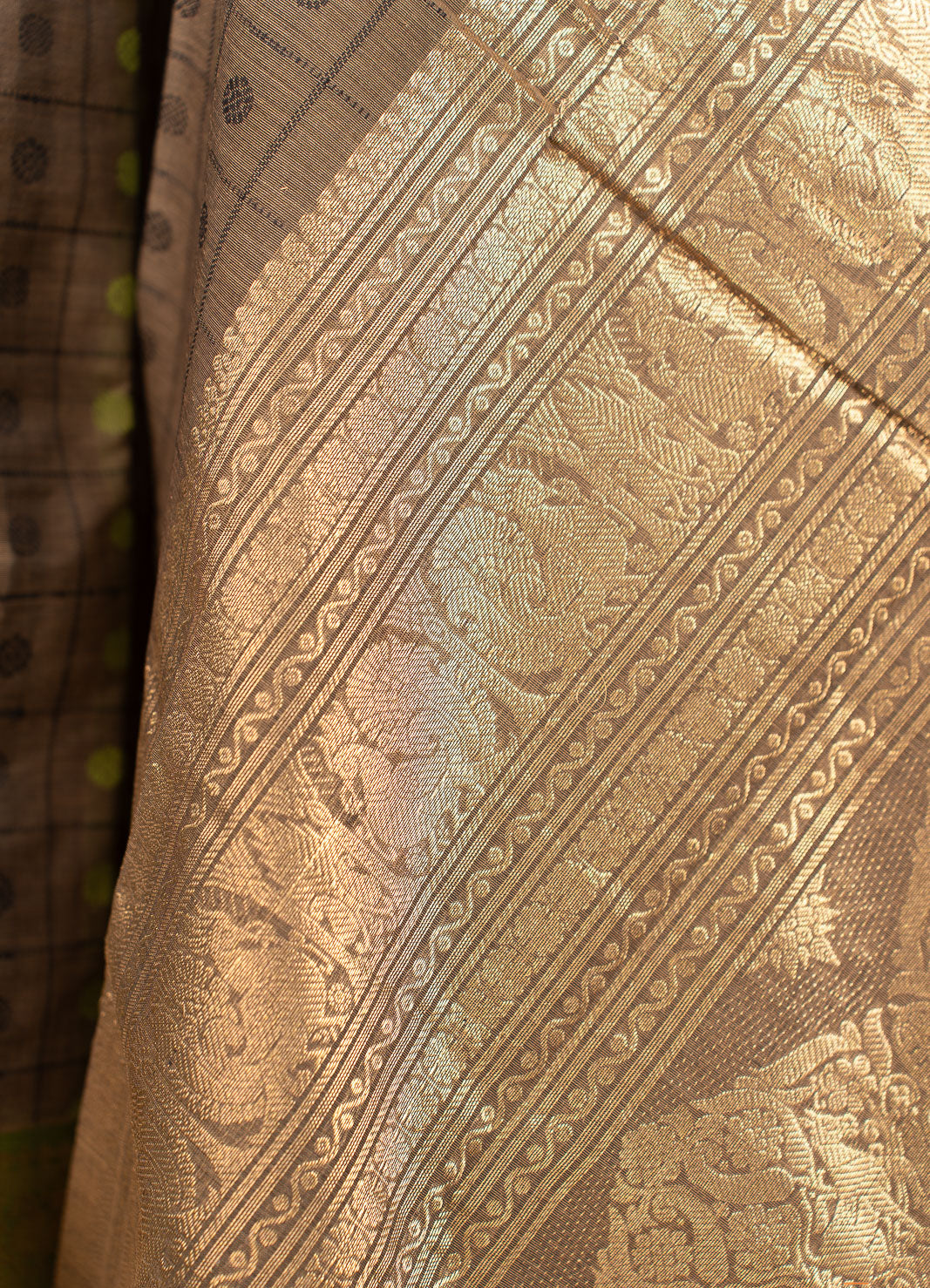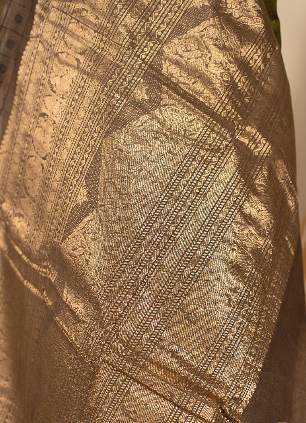 The saree is framed by a stunning olive green zari border, a unique and earthy hue that enhances the understated elegance of the grey base. The pallu features rich zari work, finely woven with traditional motifs that reflect the legacy of Kanchipuram's master weavers.