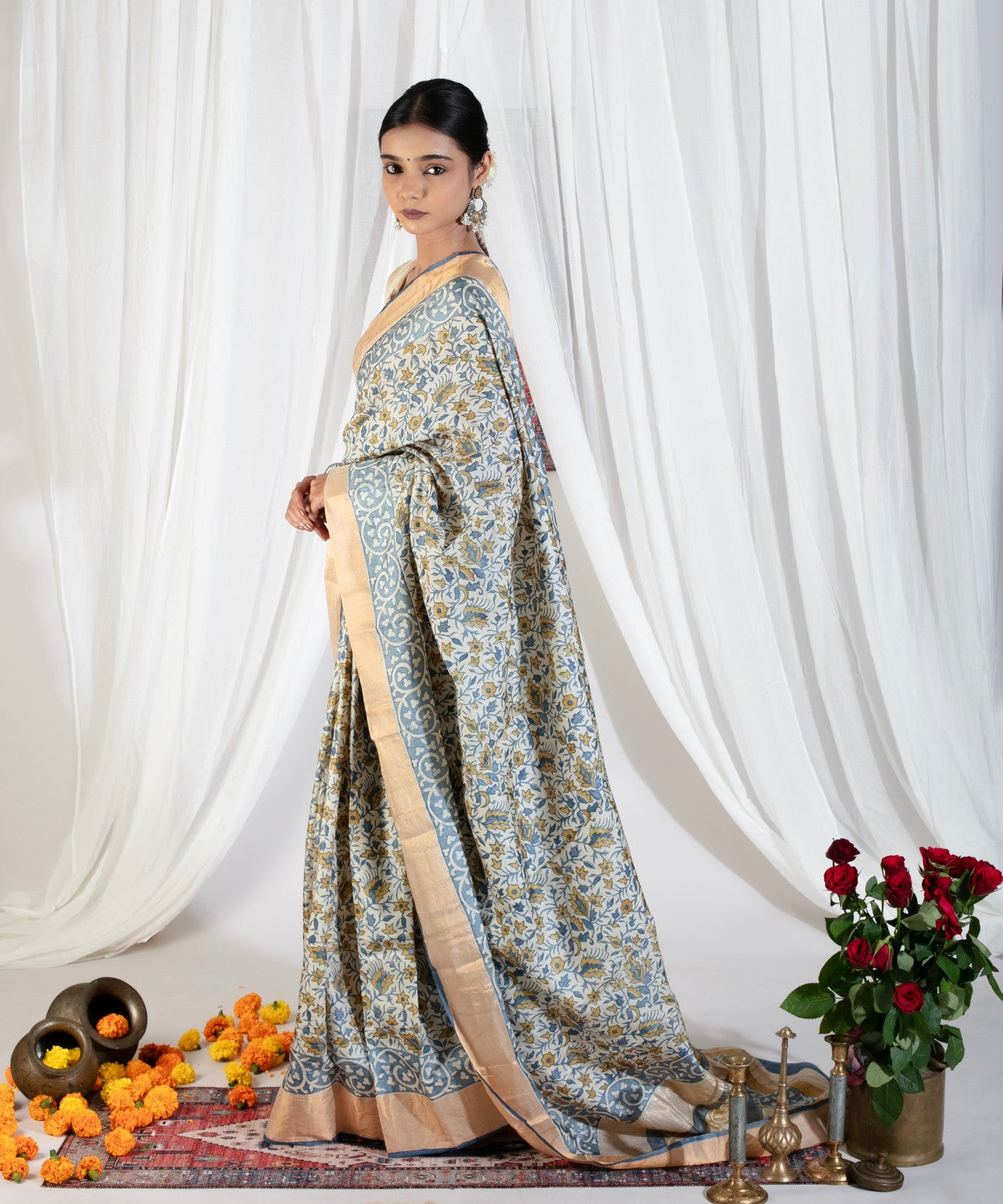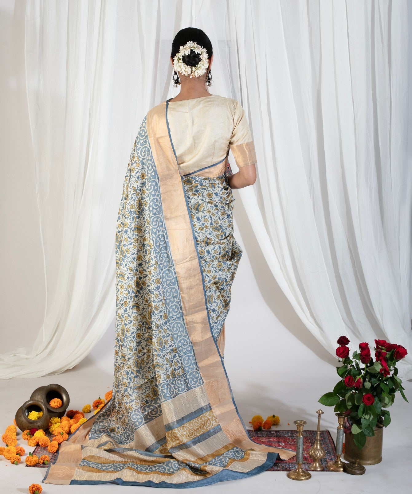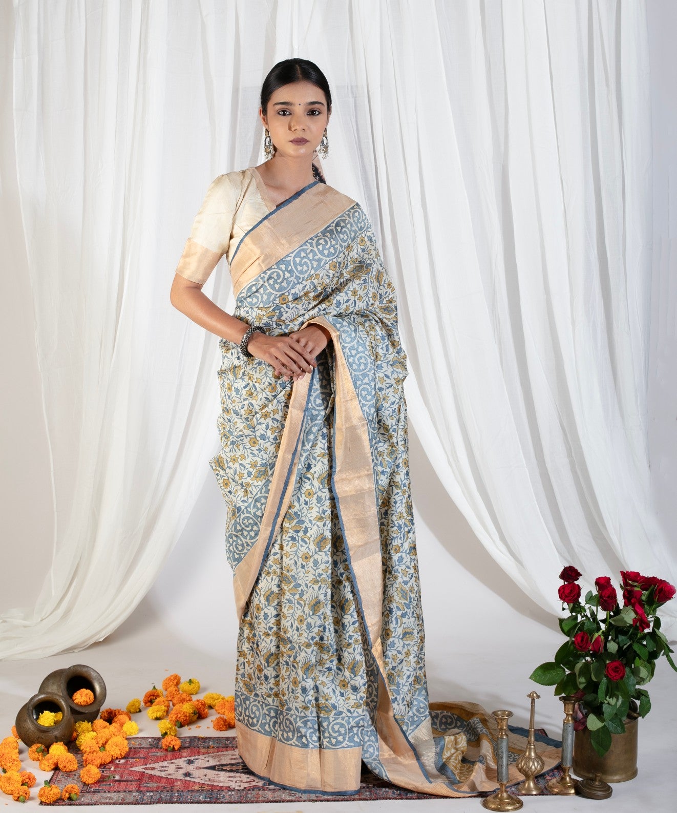 Heather Blue Pure Handloom Jari Tussar Silk Saree with Handblock Print and Zari Border | SILK MARK CERTIFIED