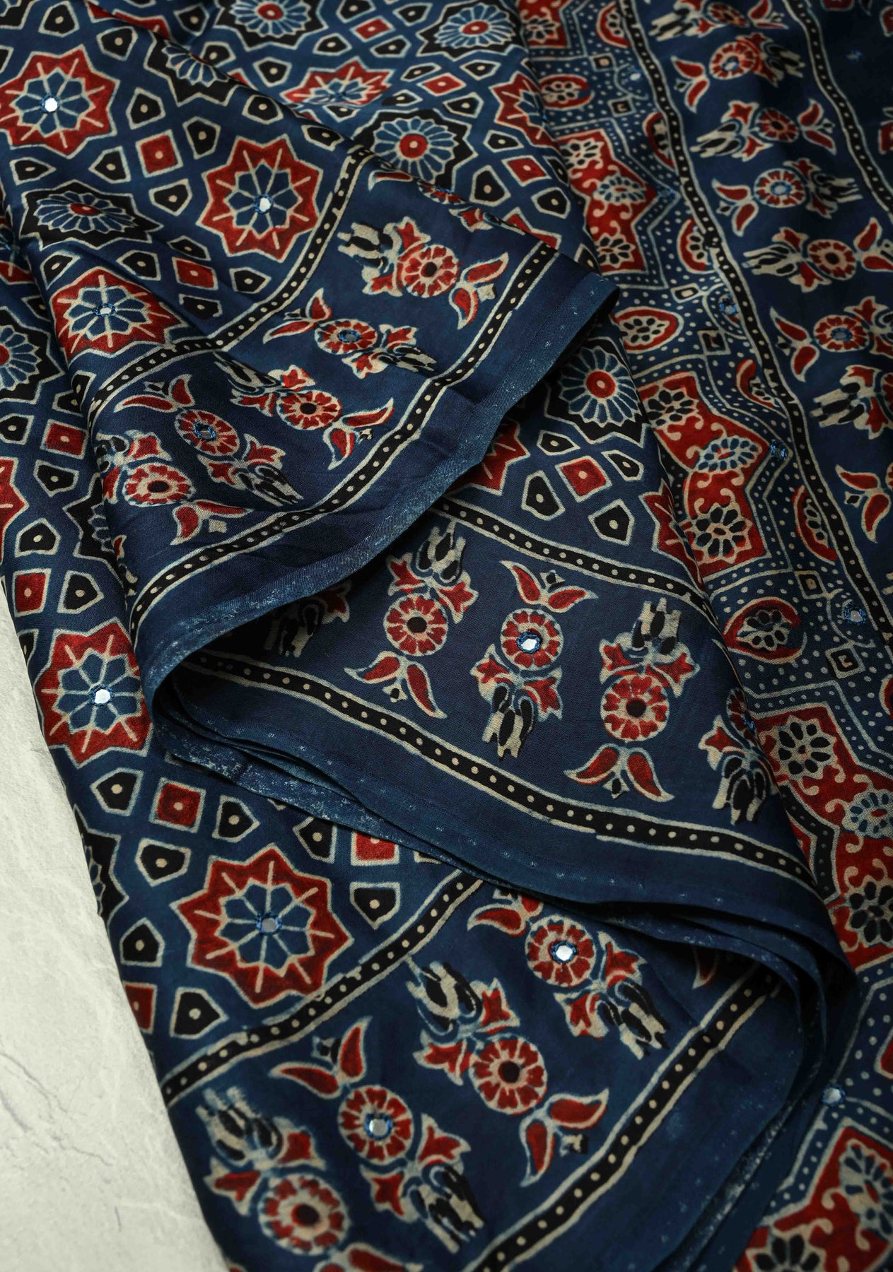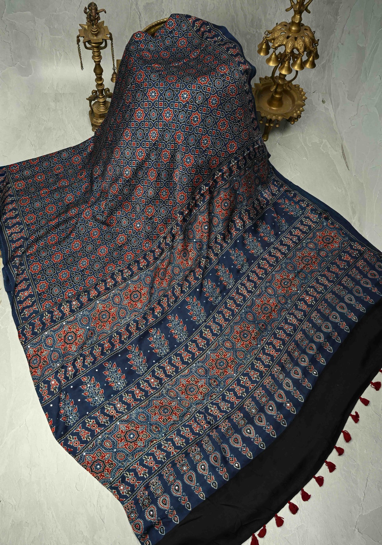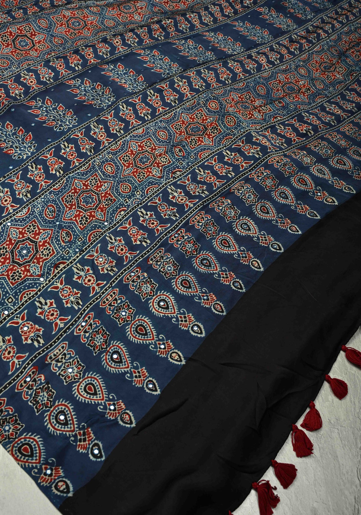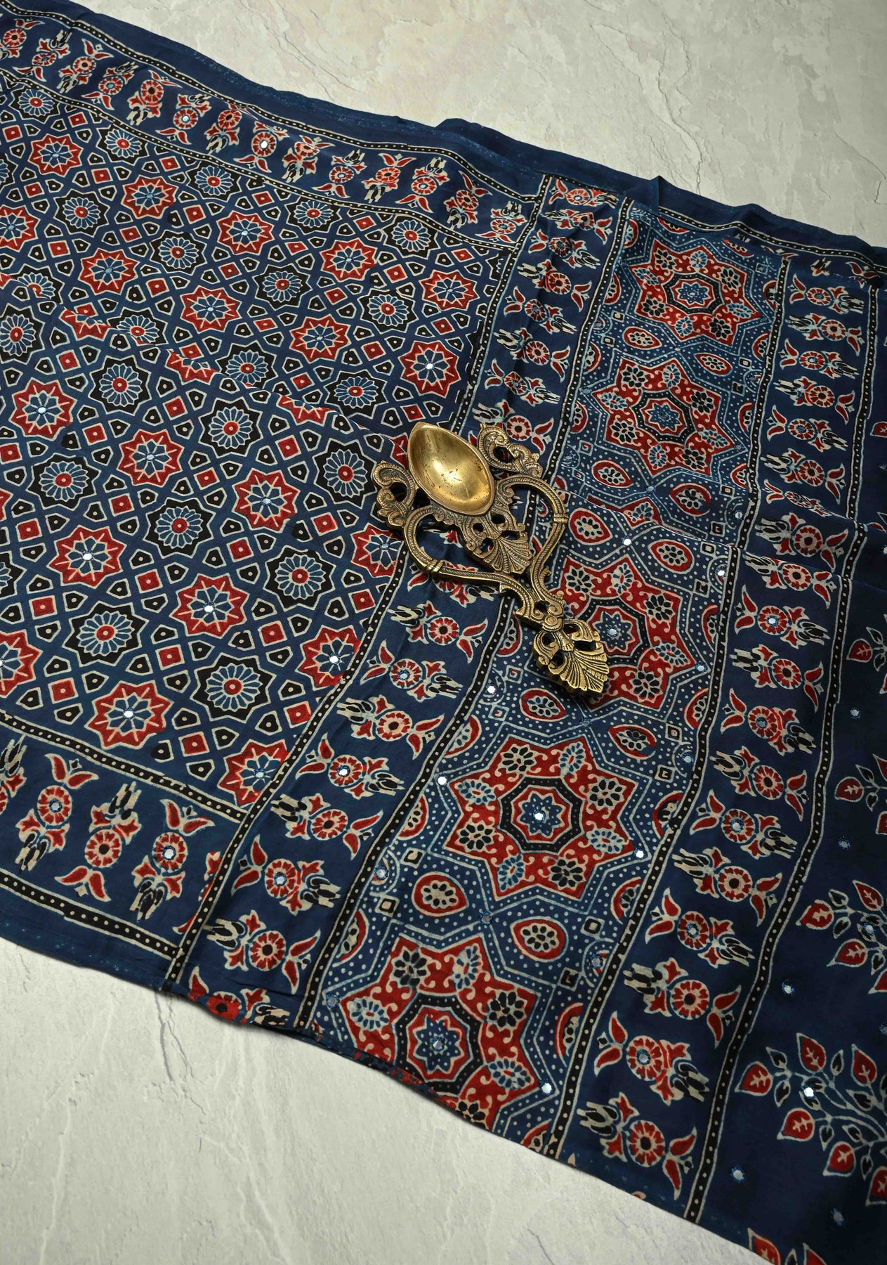 This beautiful Indigo Ajrakh block print saree on soft modal fabric blends traditional craftsmanship with contemporary elegance. The rich indigo base is adorned with Ajrakh block prints, showcasing intricate geometric and floral motifs that highlight the artisanal heritage of this handcraft. Adding a touch of sparkle and charm, delicate mirror work is intricately placed across the saree, enhancing its festive and celebratory appeal. Lightweight, breathable, and gracefully draping, this saree is perfect for casual gatherings, festive occasions, and cultural celebrations, offering a harmonious blend of timeless tradition and modern style.
