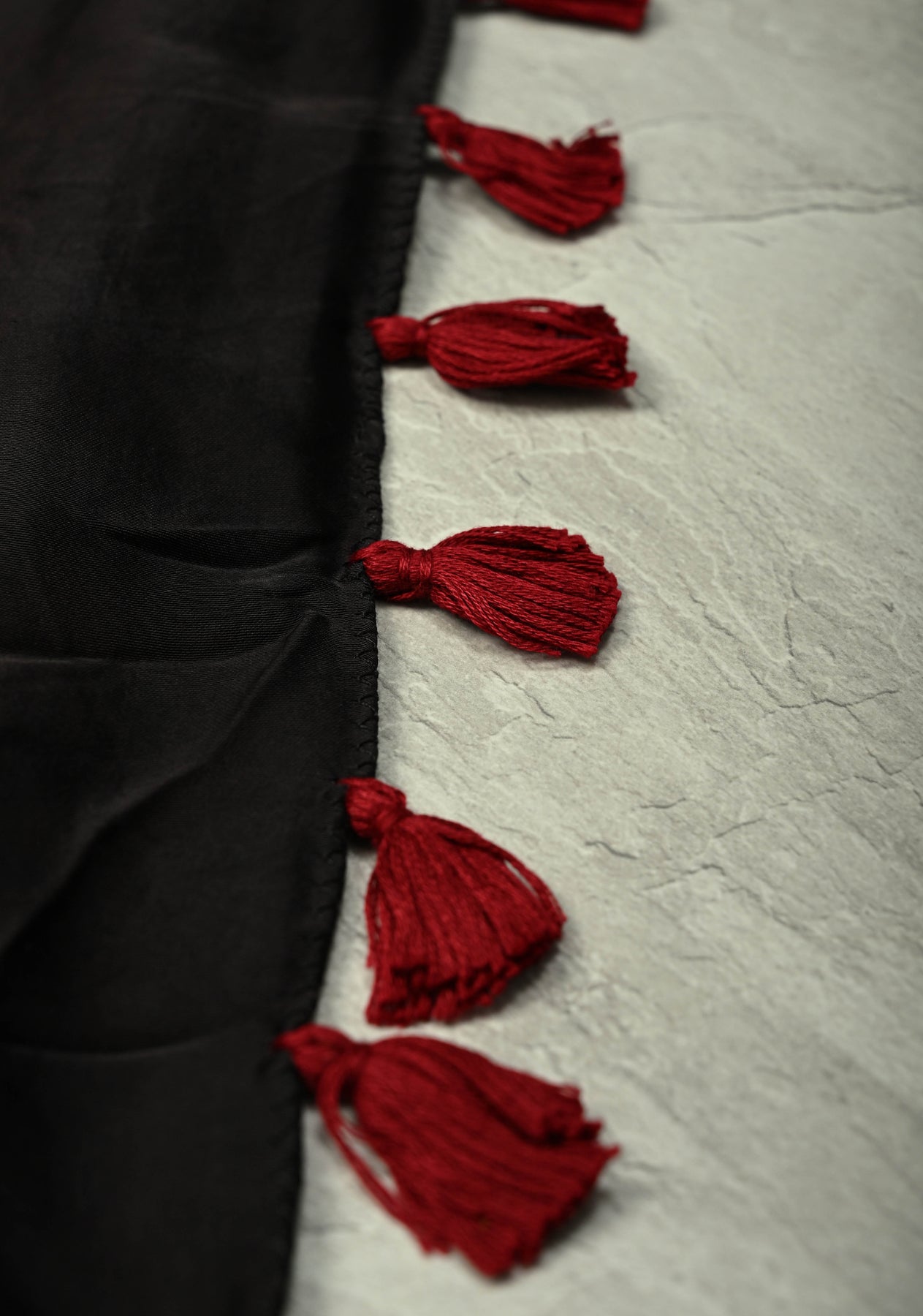 This saree is ready to wear with fall and pico done. An unstitched blouse fabric is included.Hand-made tassels adorn pallu.