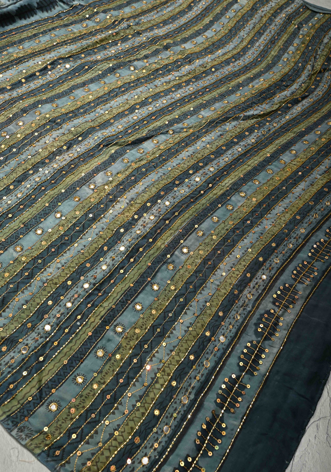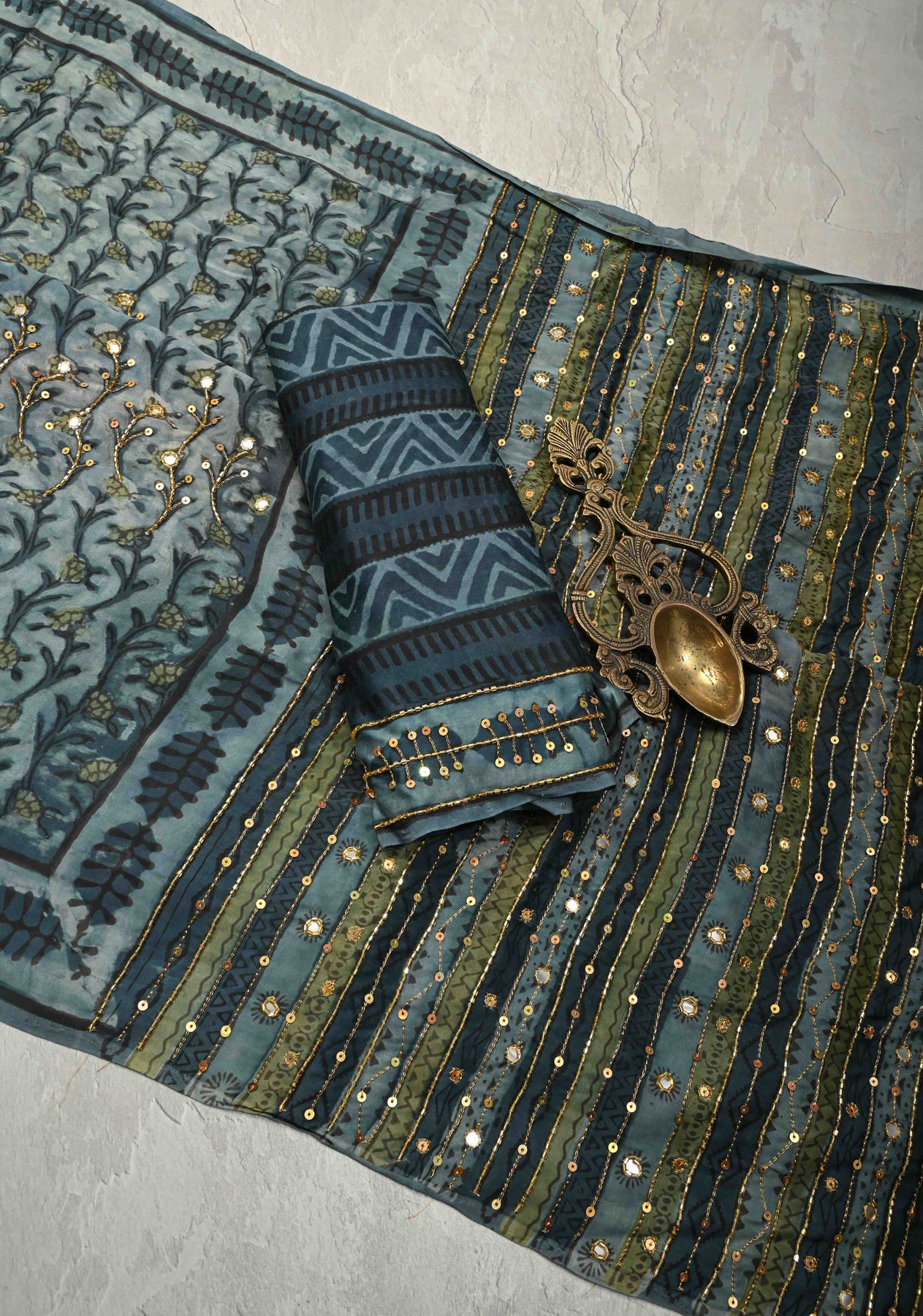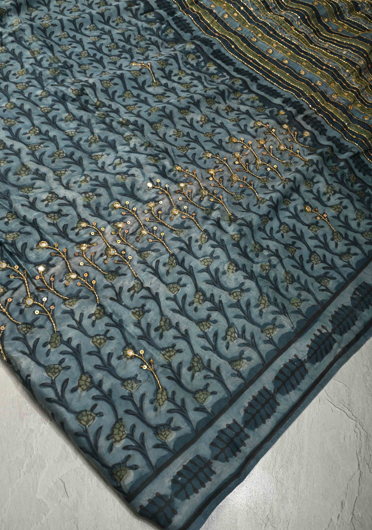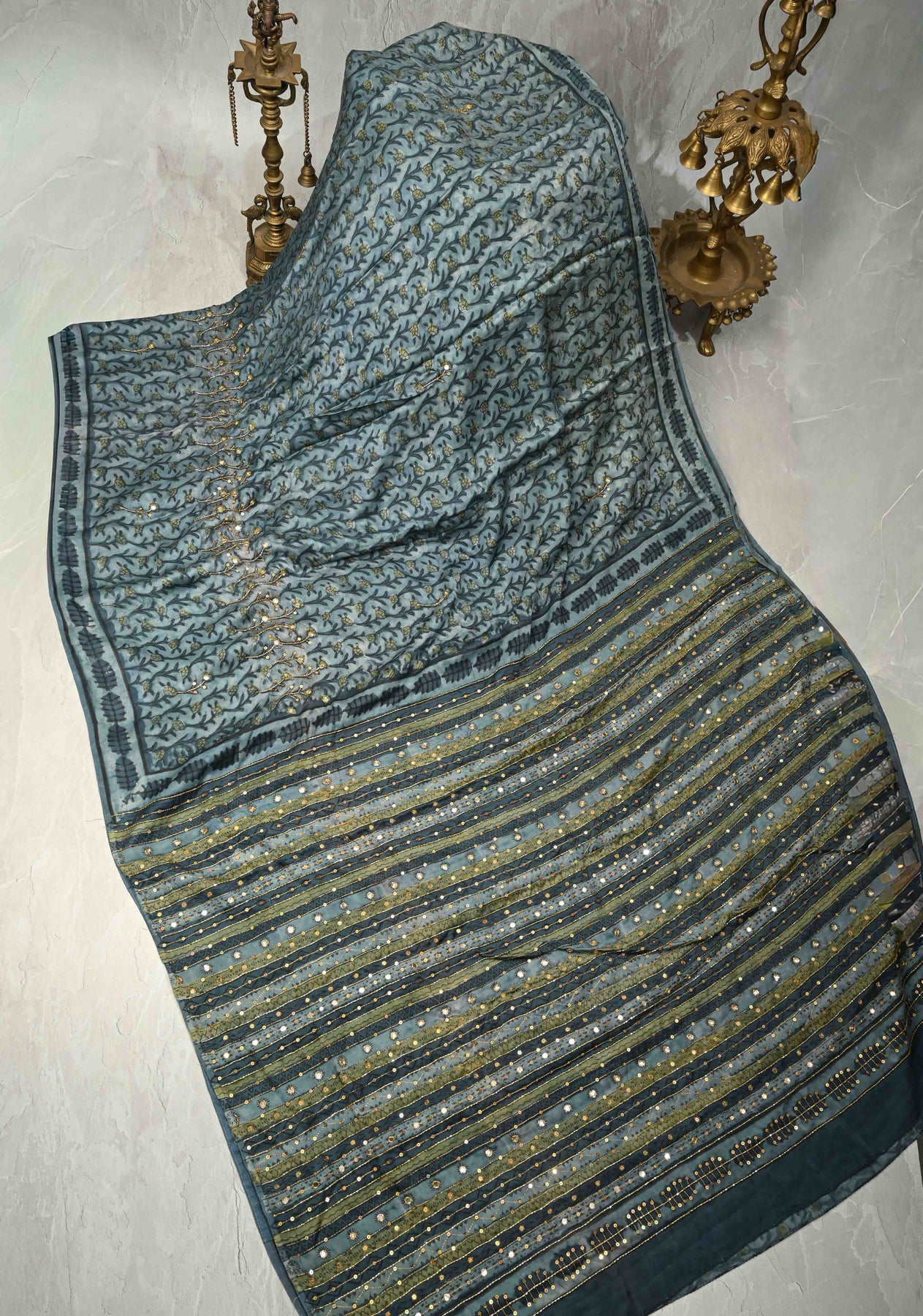 Make a graceful statement with this Indigo Modal Silk Saree featuring Hand Block Print, Sequins, Cutdana, and Hand Embroidery. Crafted from luxurious modal silk, this saree offers a soft, fluid drape with a subtle sheen for all-day comfort and elegance. The indigo base is beautifully enhanced with traditional hand block prints, while delicate sequins, cutdana work, and intricate hand embroidery add a touch of sparkle and artisanal charm. Perfect for festive occasions, evening gatherings, and cultural celebrations, this saree blends heritage craftsmanship with contemporary sophistication.