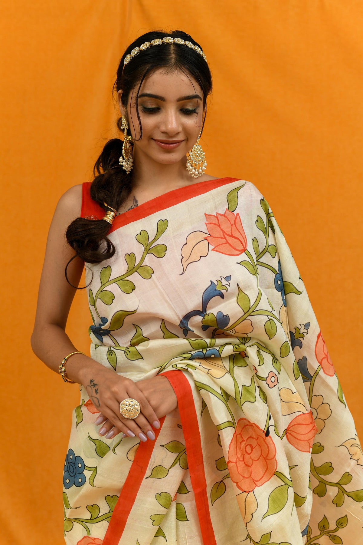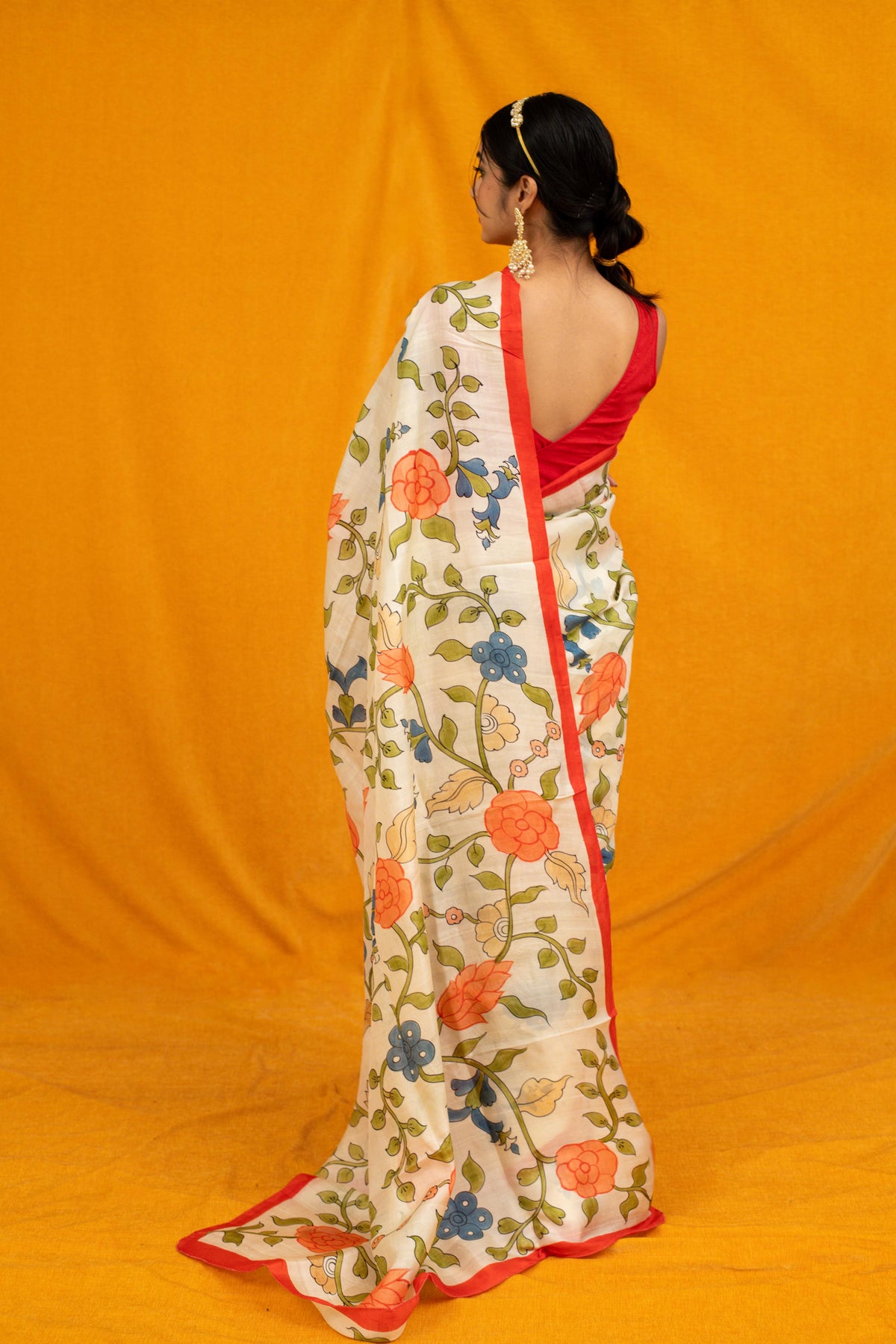 Ethereal and artistic, this Ivory Pure Bishnupuri Silk Saree is a masterpiece that celebrates the timeless beauty of Indian handcraft. Meticulously hand-painted in traditional Kalamkari style, the saree features exquisite floral motifs rendered in rich natural hues that stand out beautifully against the elegant ivory base.