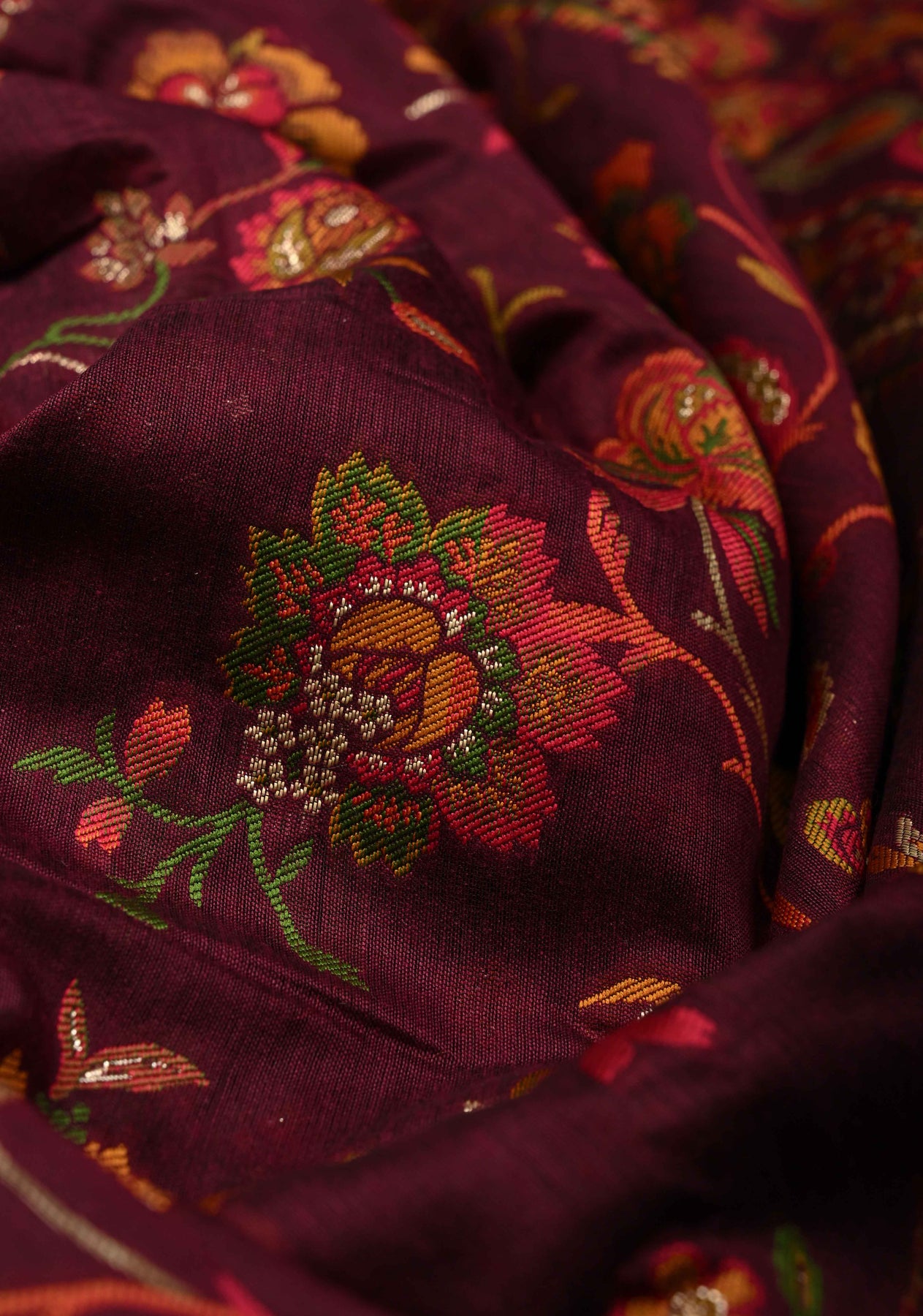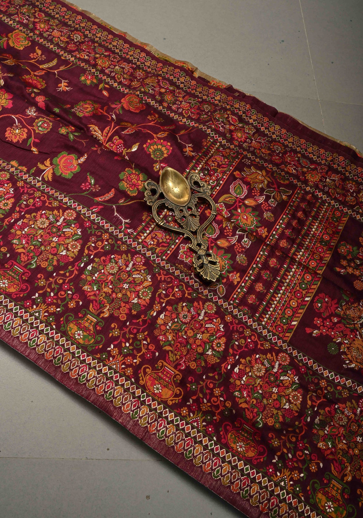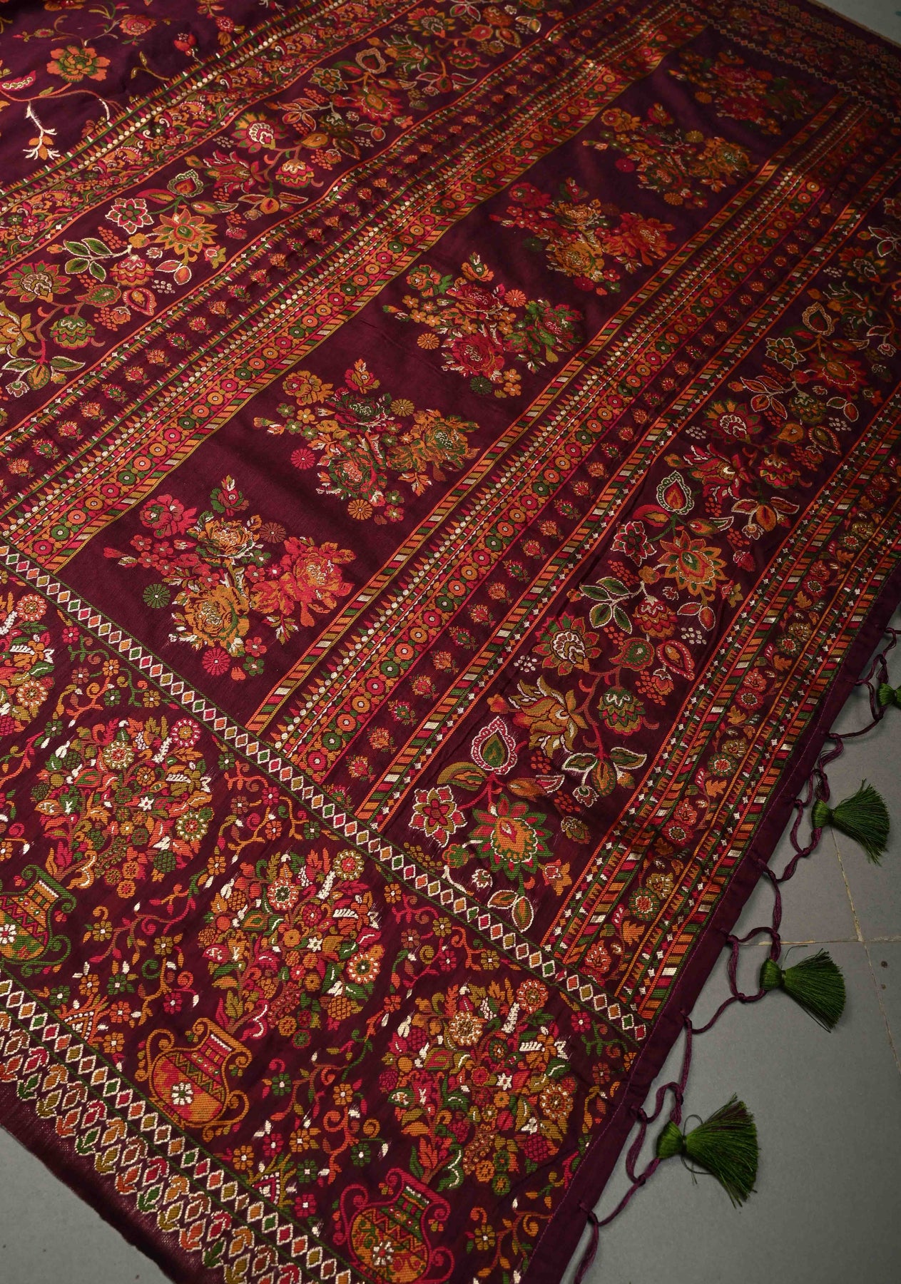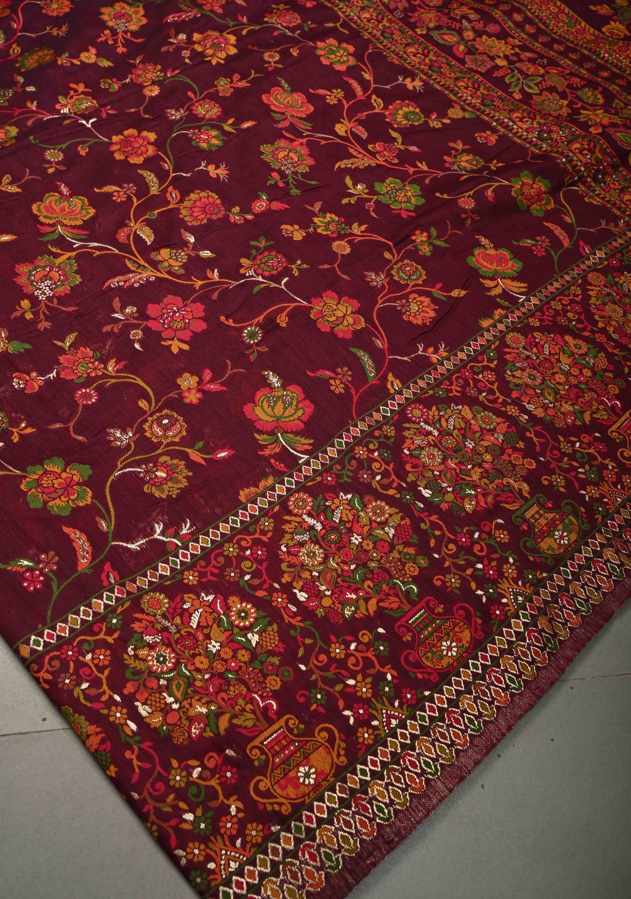 Exude regal sophistication in this Deep Maroon Rayon Saree, featuring an exquisite Kani design with an all-over floral jaal. The rich maroon canvas is meticulously adorned with multi-colored Meenakari-style floral vines and traditional gold zari borders, offering a luxurious look with a soft, comfortable drape. Finished with elegant green tassels, this saree is a perfect blend of heritage artistry and modern grace.