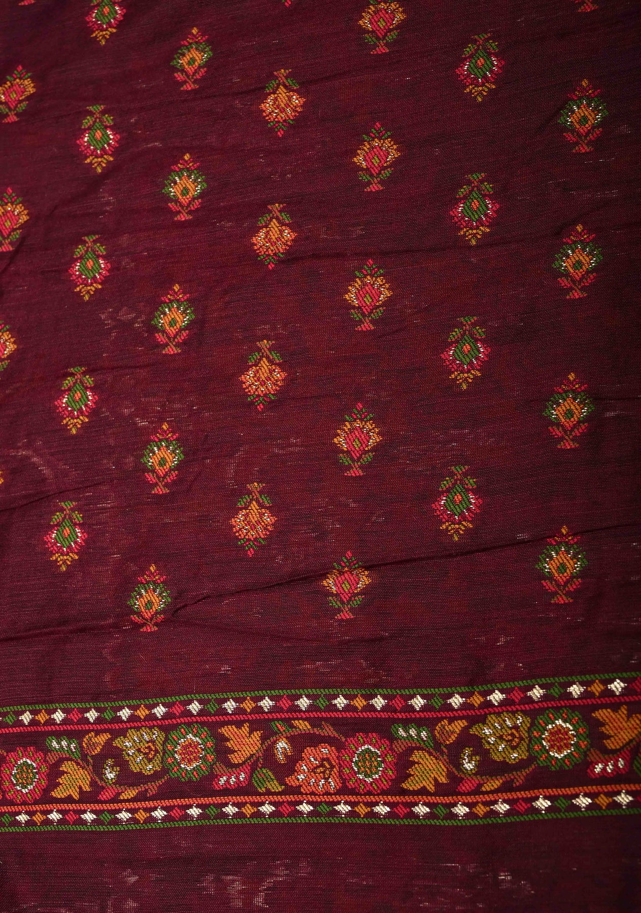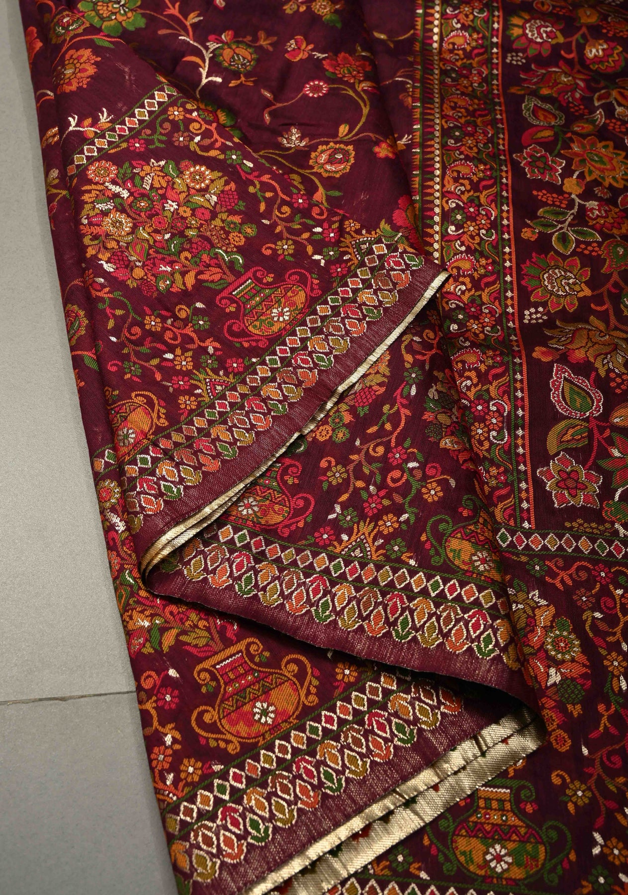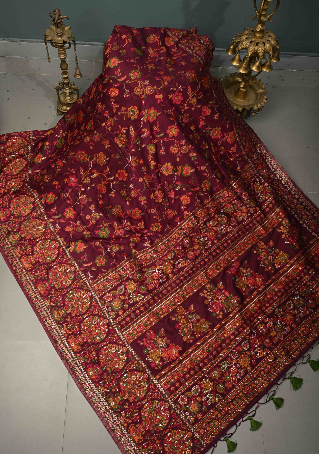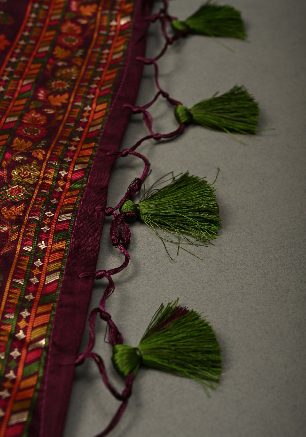 Exude regal sophistication in this Deep Maroon Rayon Saree, featuring an exquisite Kani design with an all-over floral jaal. The rich maroon canvas is meticulously adorned with multi-colored Meenakari-style floral vines and traditional gold zari borders, offering a luxurious look with a soft, comfortable drape. Finished with elegant green tassels, this saree is a perfect blend of heritage artistry and modern grace.