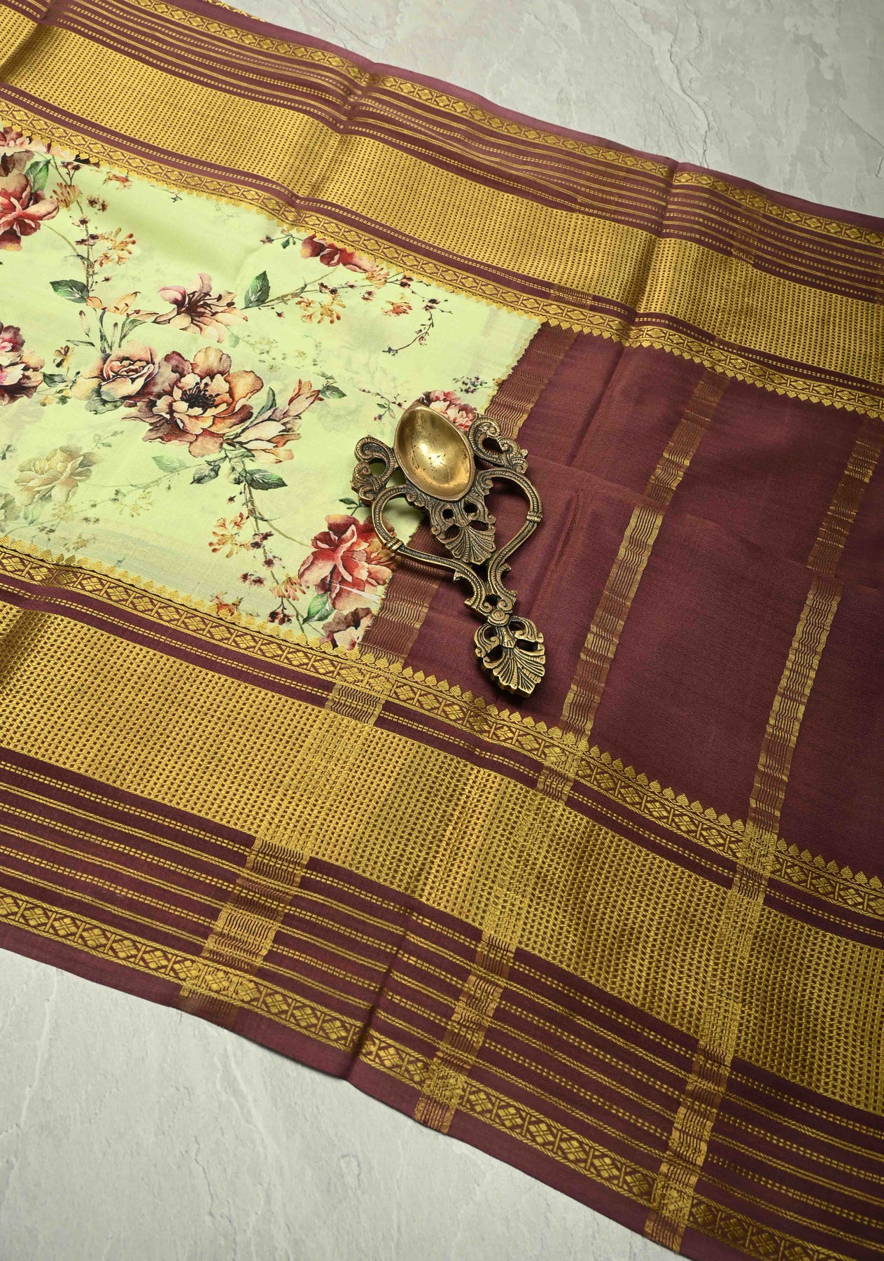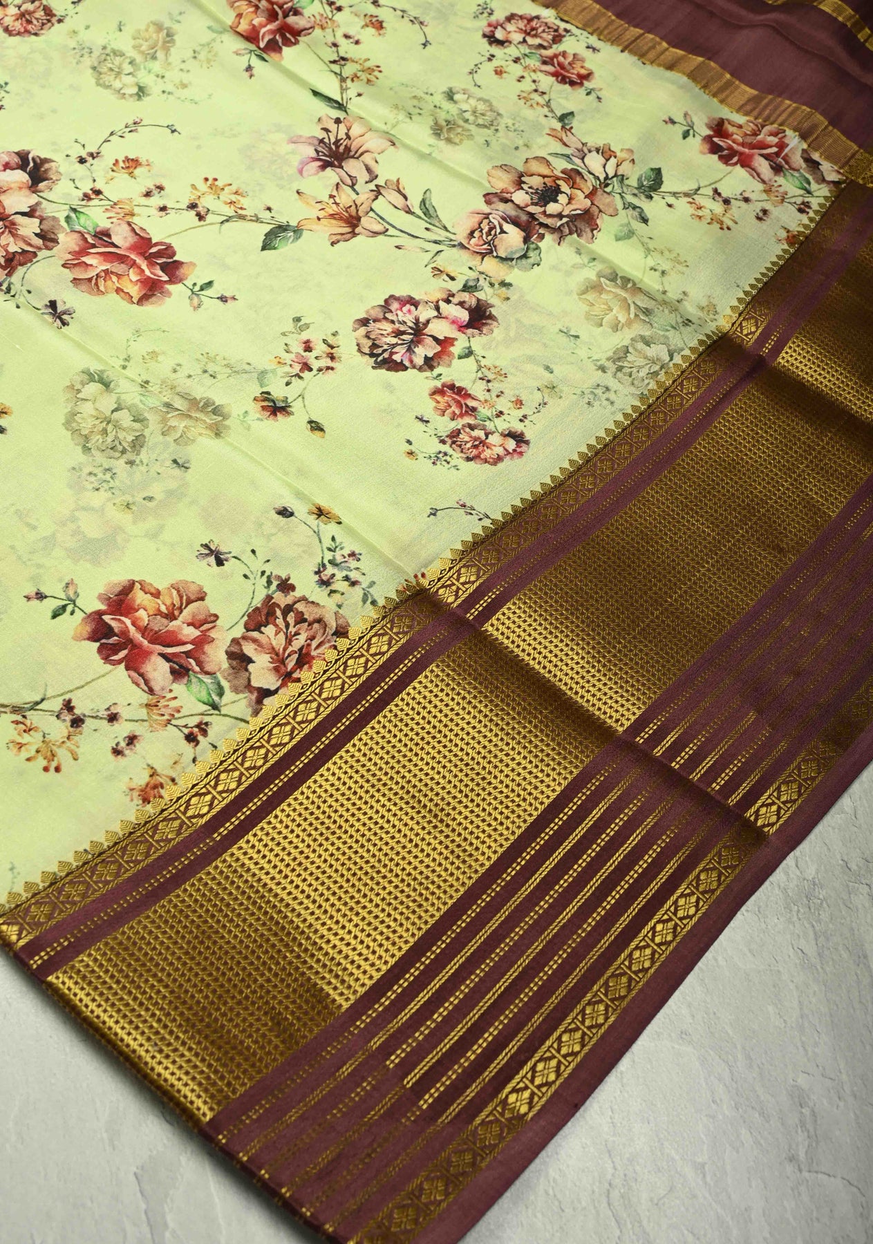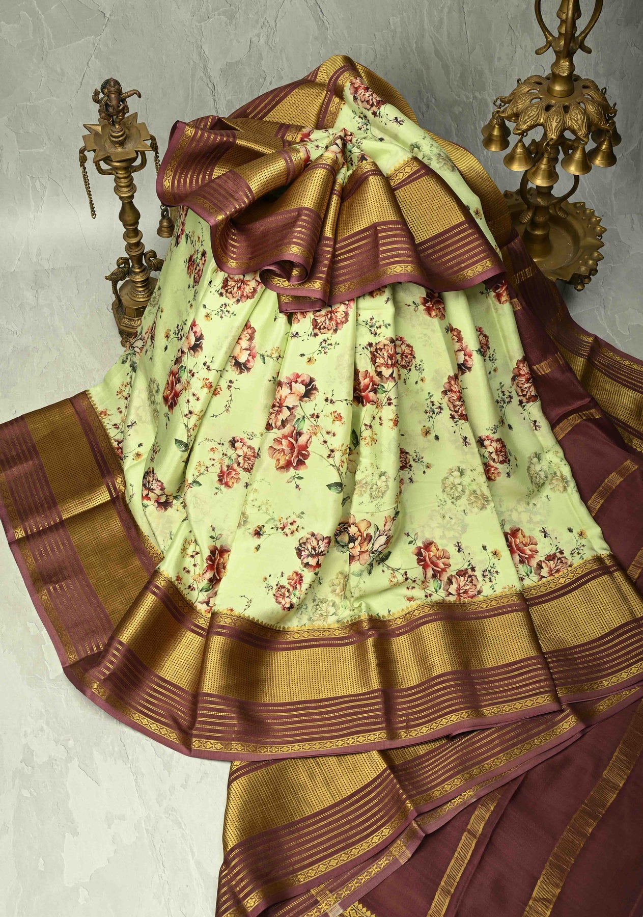 Light Mint Green Mysore Silk Saree with Floral Digital Print and Contrast Zari Border |SILK MARK CERTIFIED