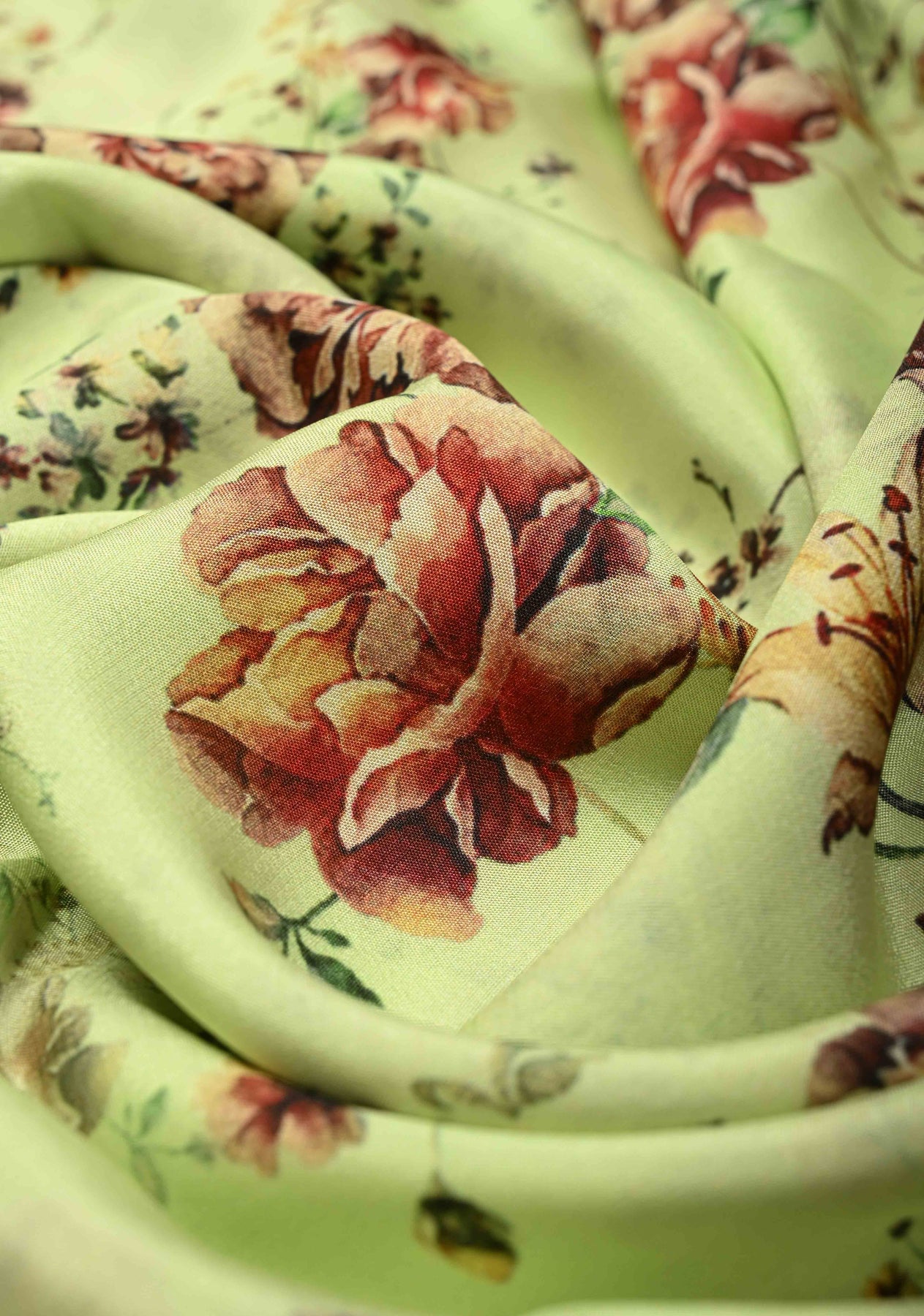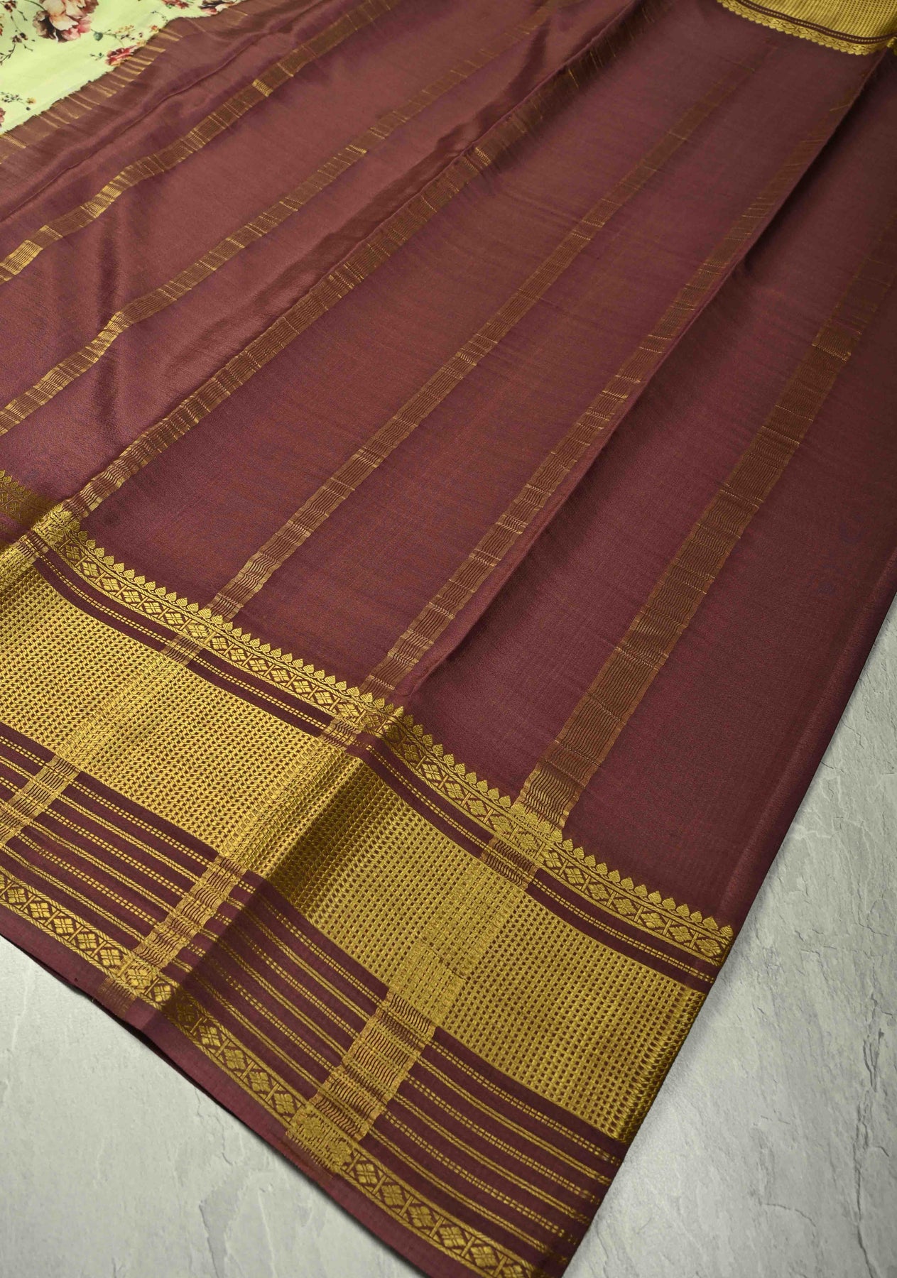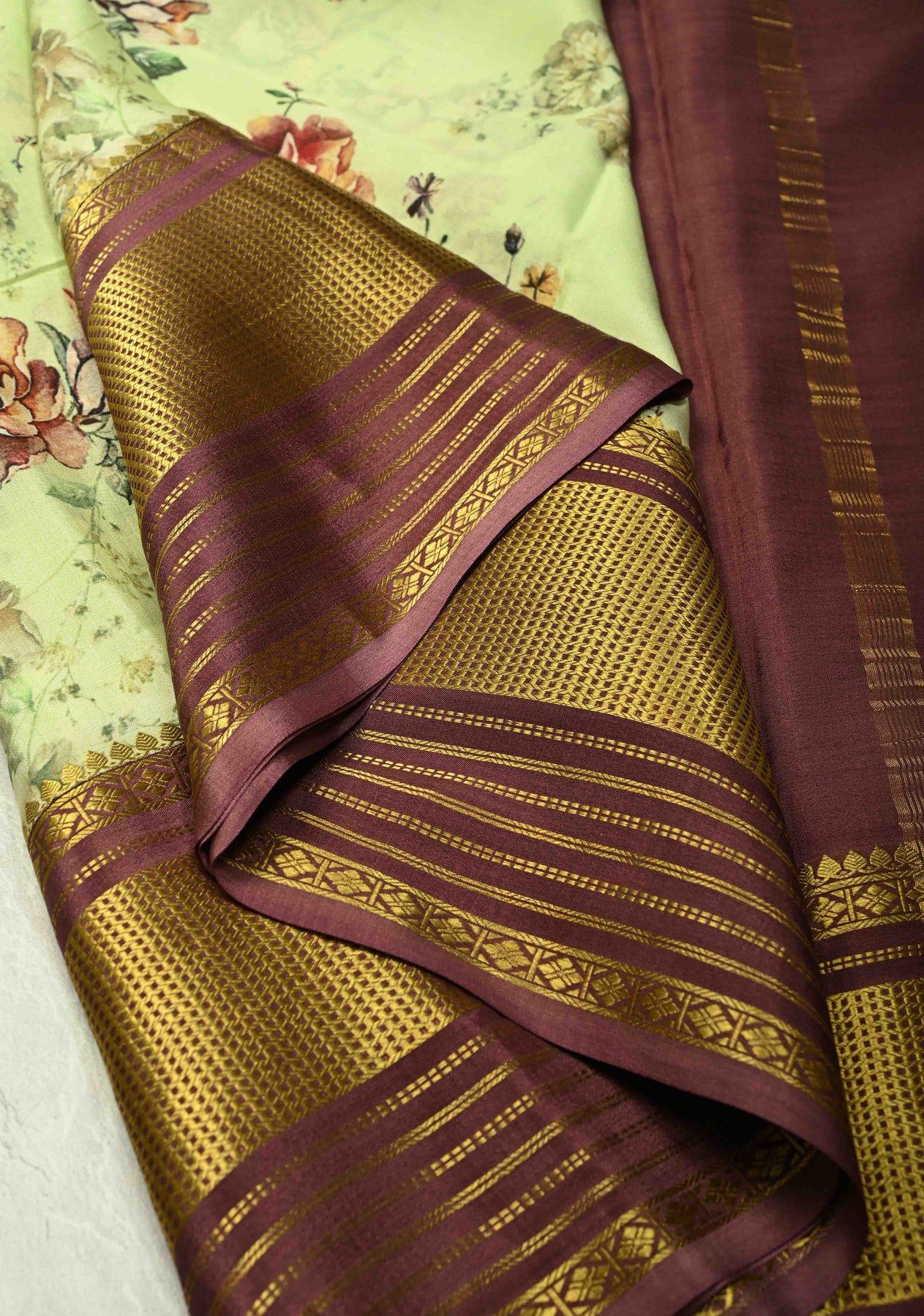 Light Mint Green Mysore Silk Saree with Floral Digital Print and Contrast Zari Border |SILK MARK CERTIFIED
