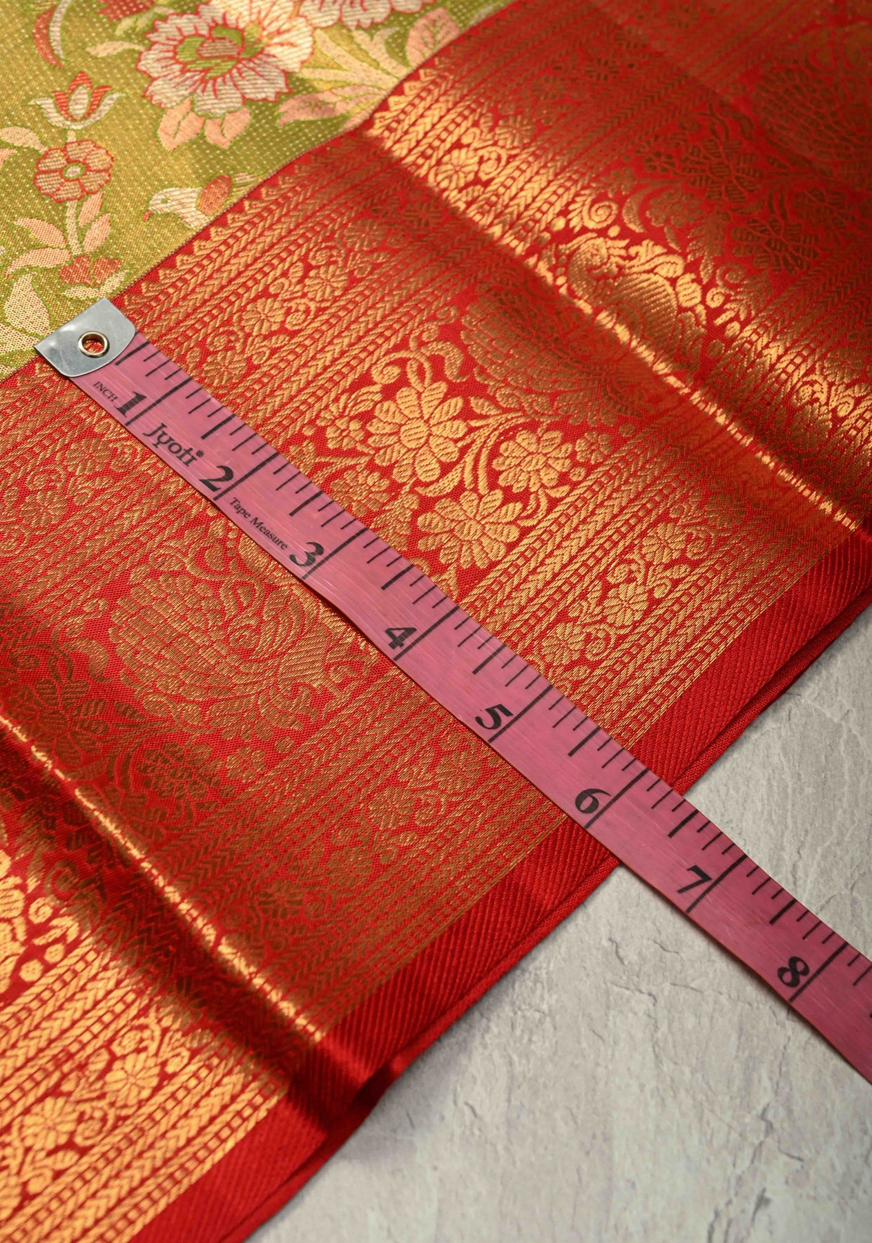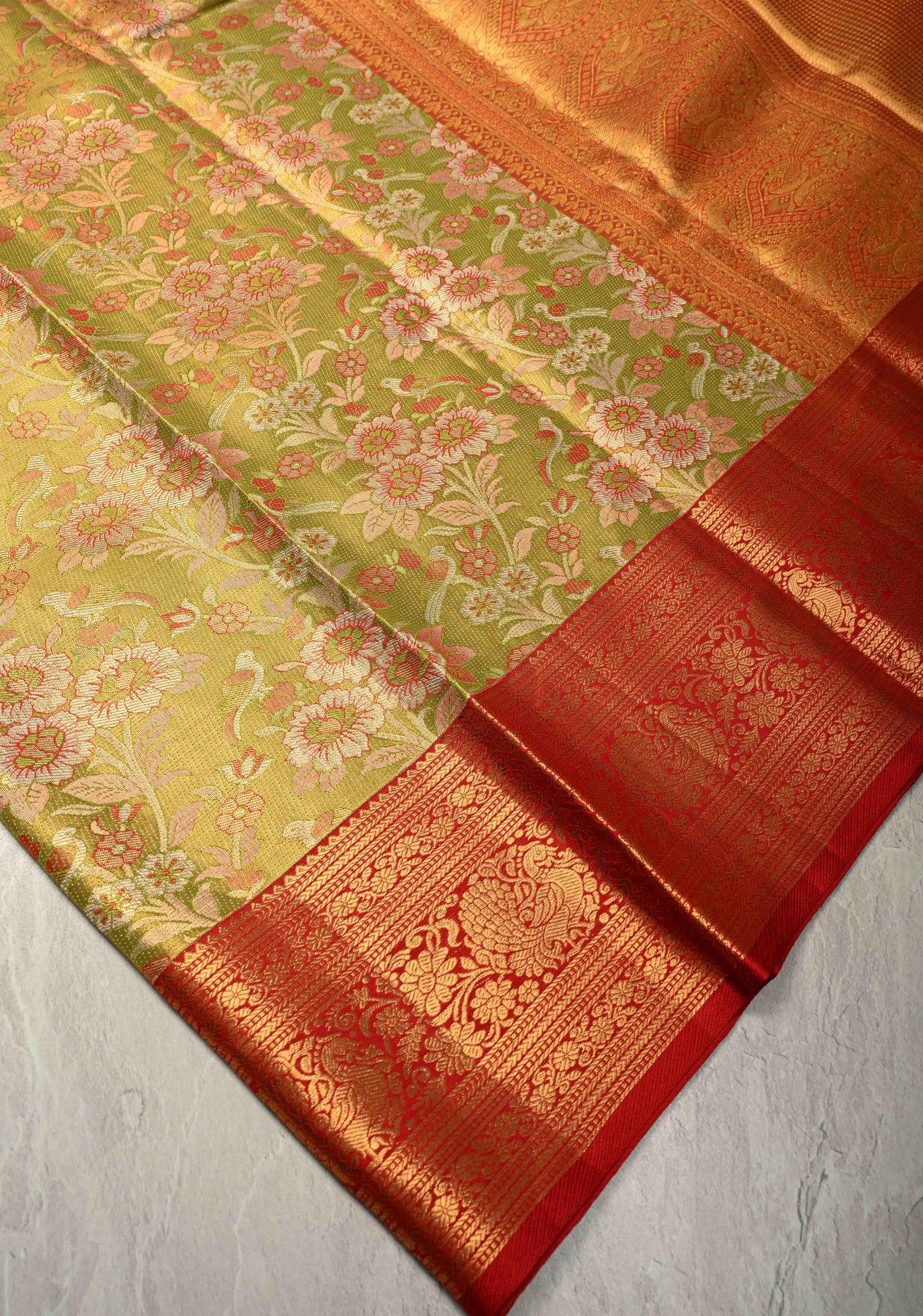 This stunning Lime Green pure Kanjivaram tissue silk saree radiates freshness and regal elegance. The tissue silk body is intricately woven with Meenakari floral and bird jaal motifs, adding vibrant artistry and traditional charm to the saree. The detailed Meenakari work beautifully complements the sheen of the tissue silk, while the rich contrast zari border lends a bold and graceful finish. Accentuated with a classic zari pallu, this saree is an exquisite choice for weddings, festive celebrations, and special occasions where heritage craftsmanship meets contemporary elegance.