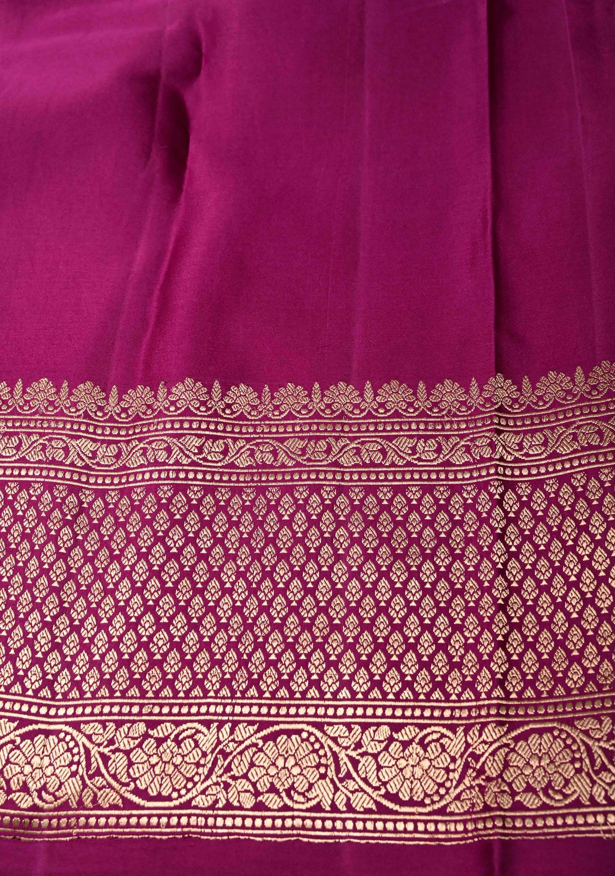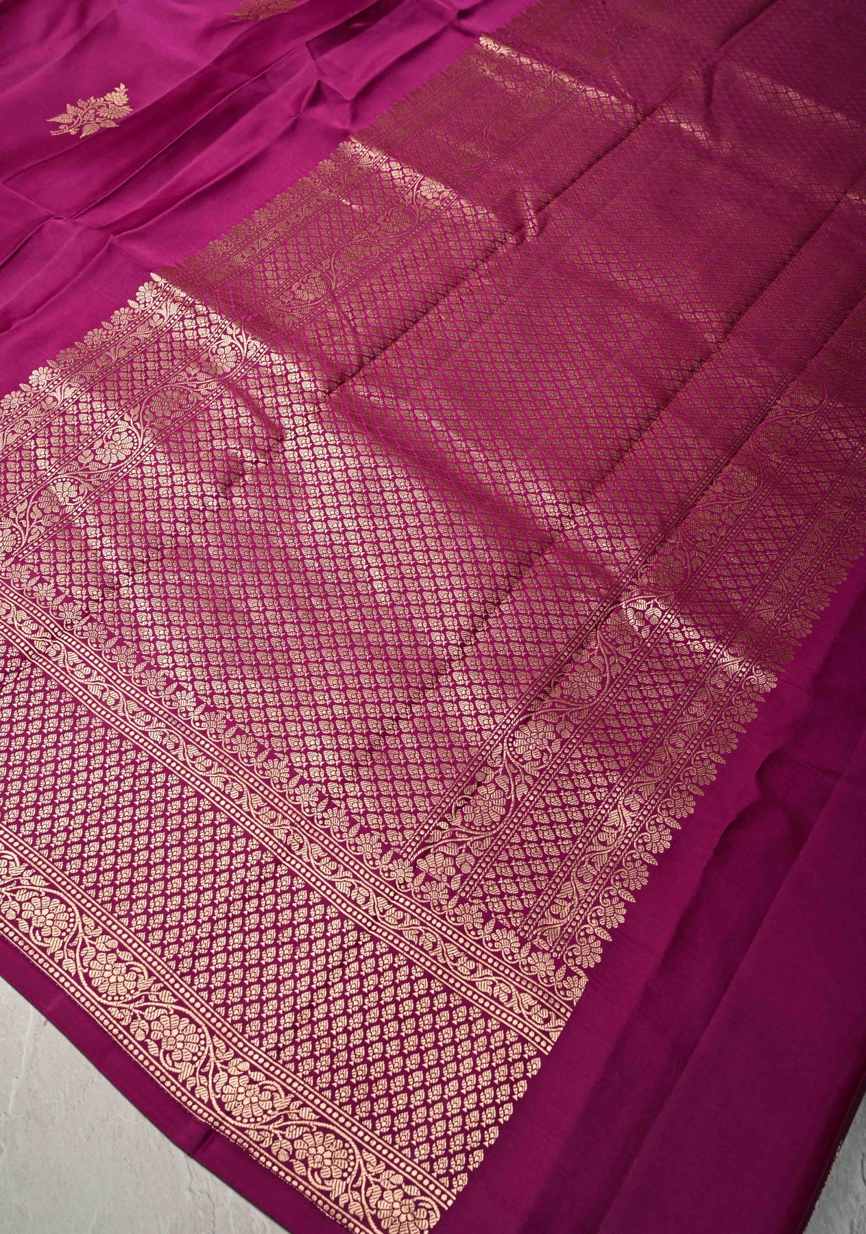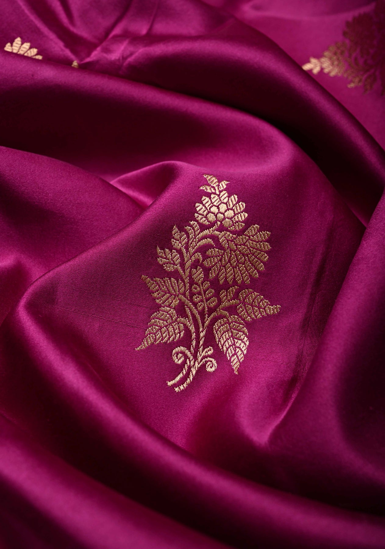 Embrace the richness of tradition with this stunning Magenta Banarasi Mashru Silk Saree, a perfect blend of texture and timeless design. Woven from smooth, lustrous Mashru silk, the saree offers a sleek finish and a comfortable drape, ideal for both festive and formal occasions.