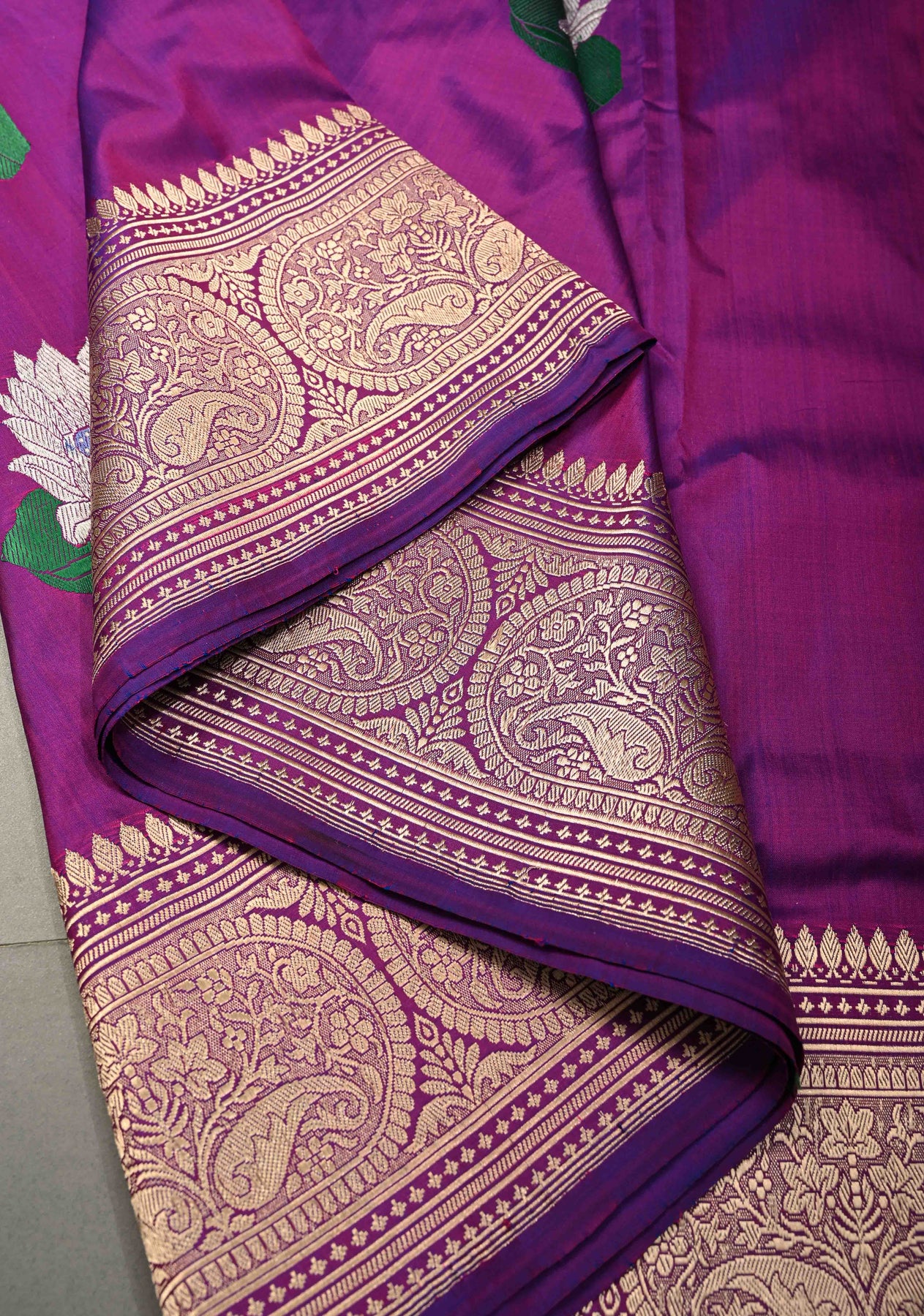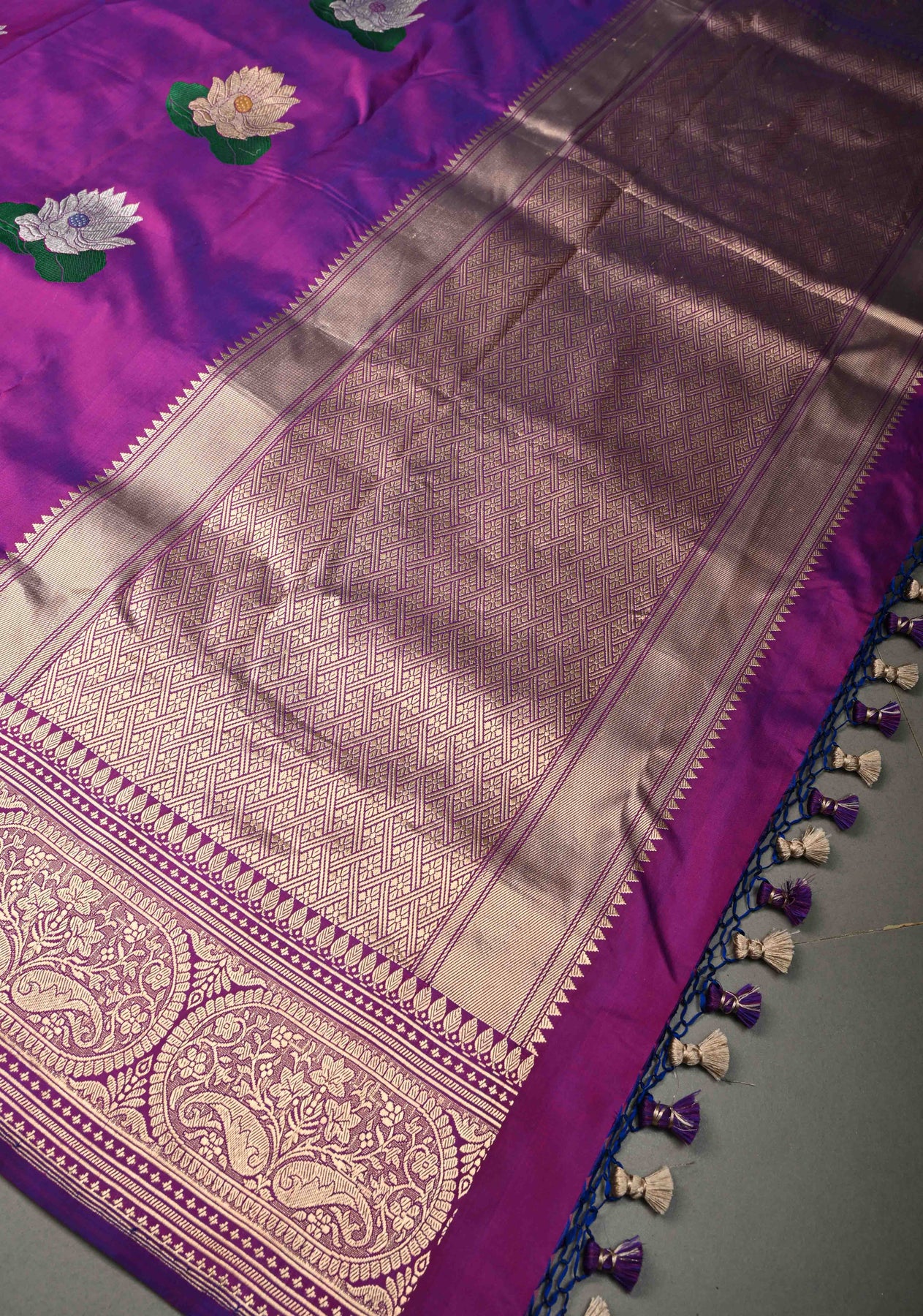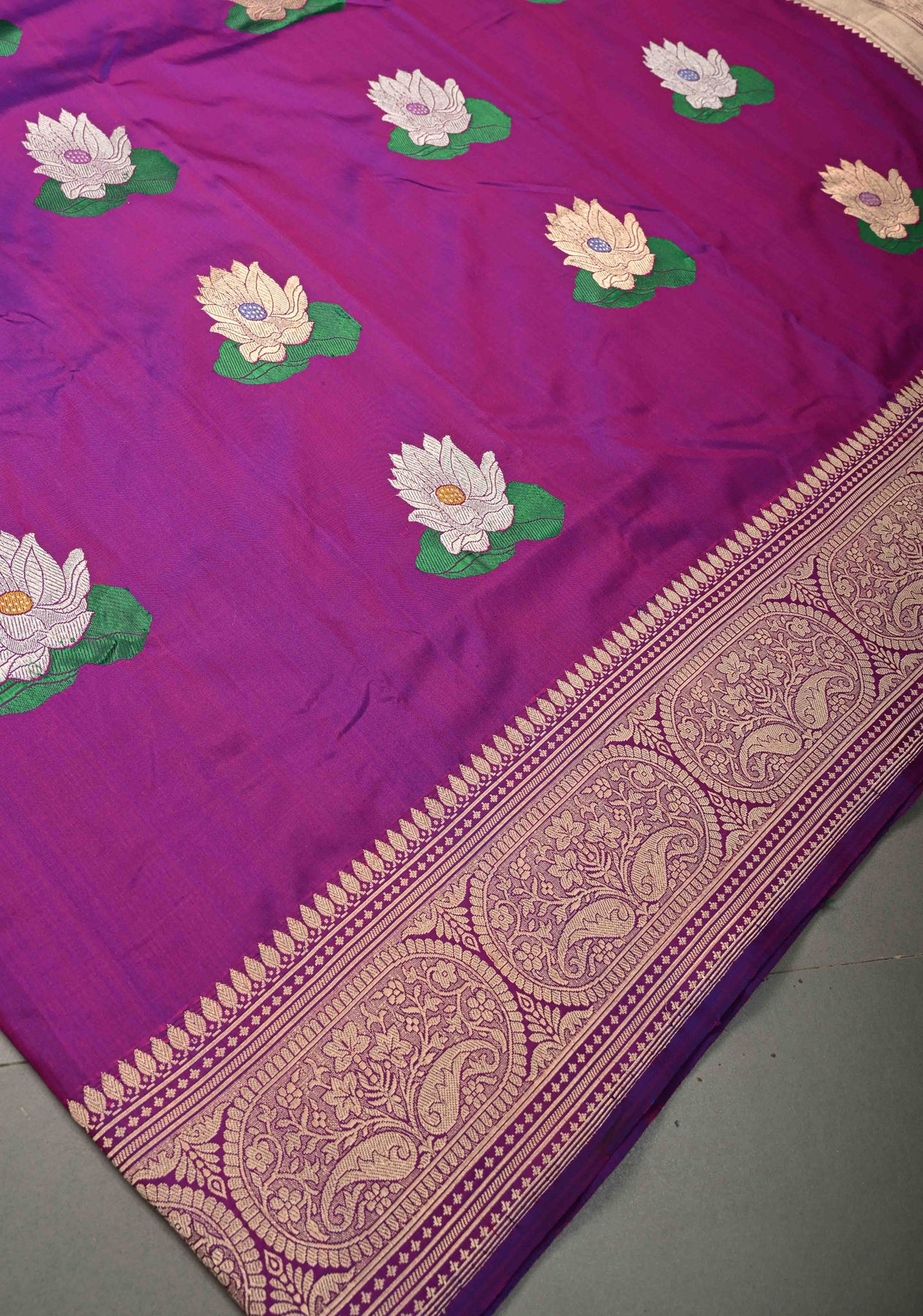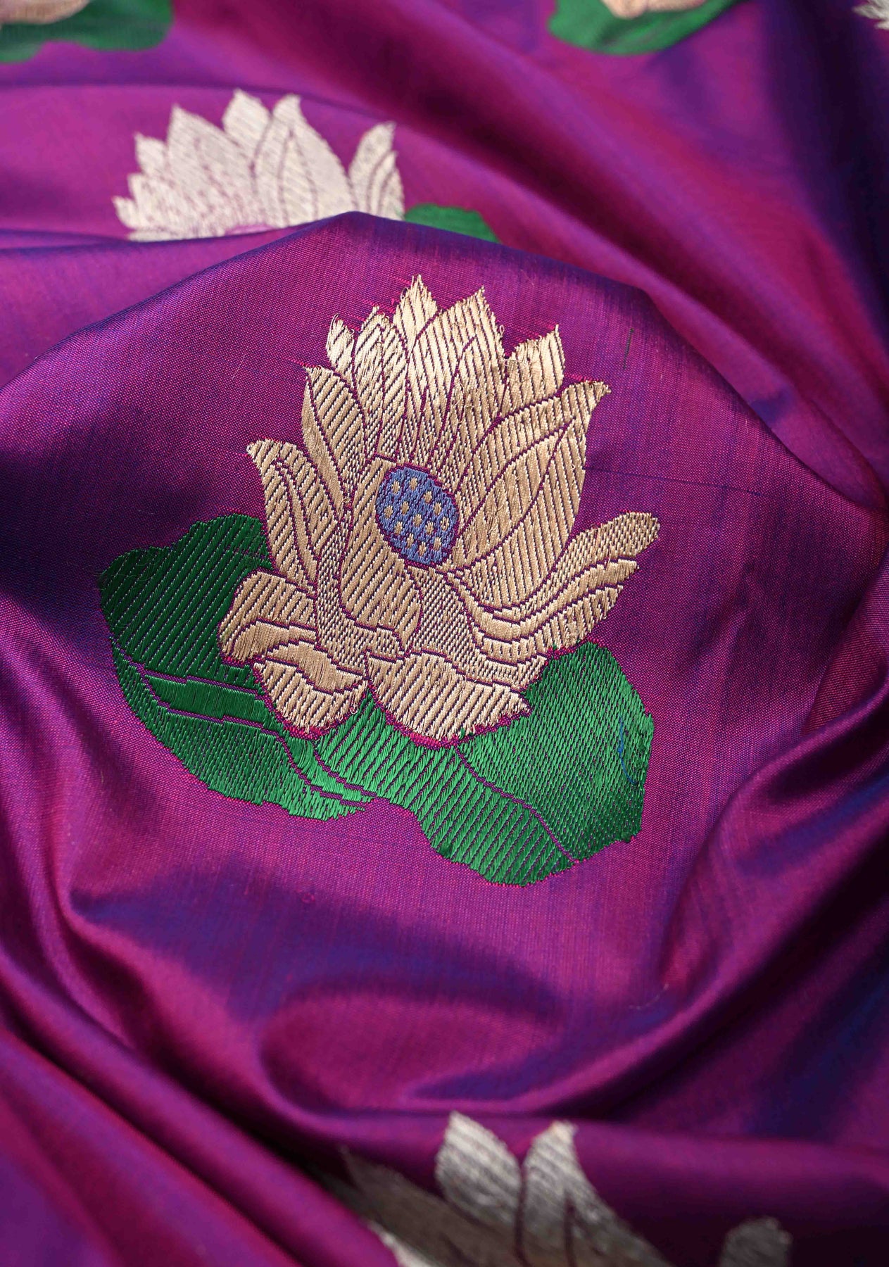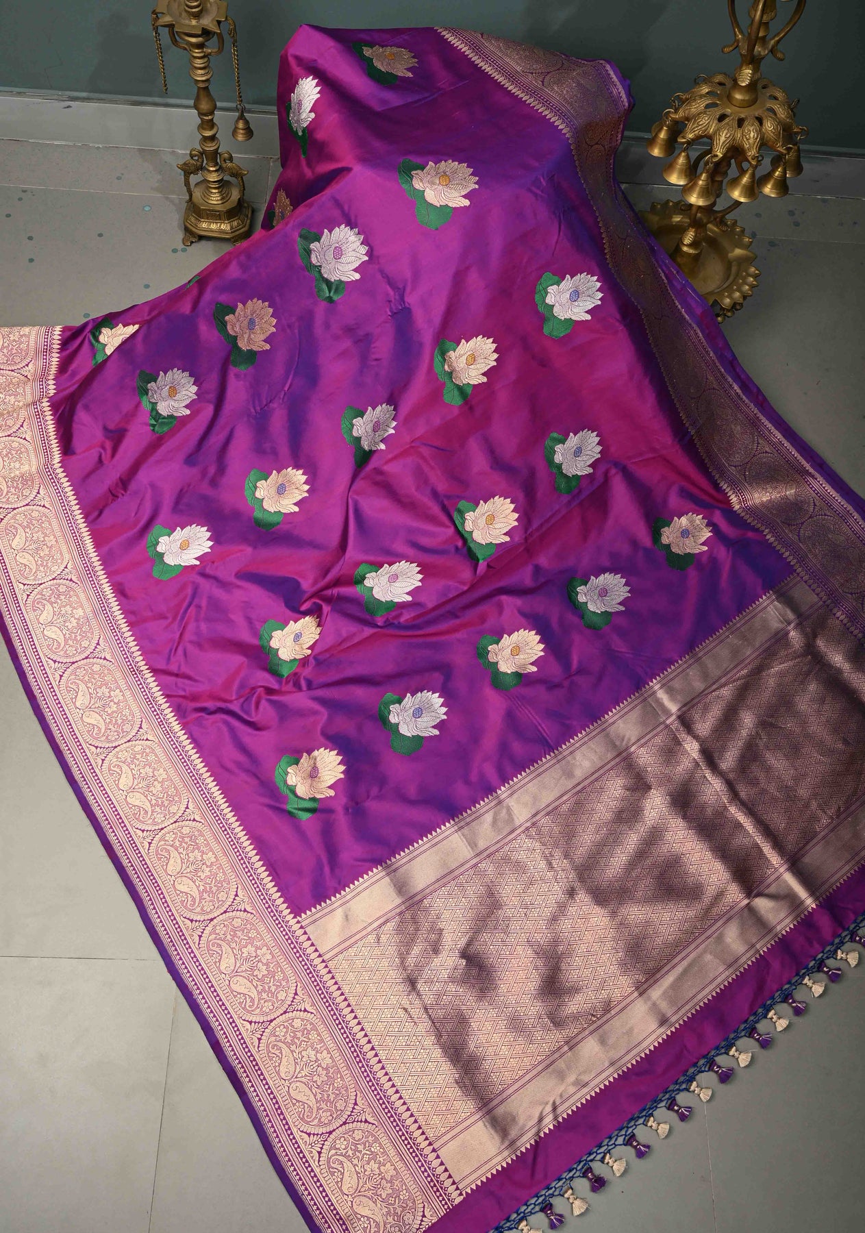 The saree’s dual-tone purple body is adorned with intricate Meenakari damask floral buttas, offering delicate, eye-catching detailing and artisanal charm. A classic zari border frames the saree beautifully, enhancing its appeal, while the Banarasi pallu completes the look with timeless heritage elegance. Perfect for weddings, festive occasions, receptions, and special celebrations, this saree is a statement piece for lovers of refined craftsmanship.
