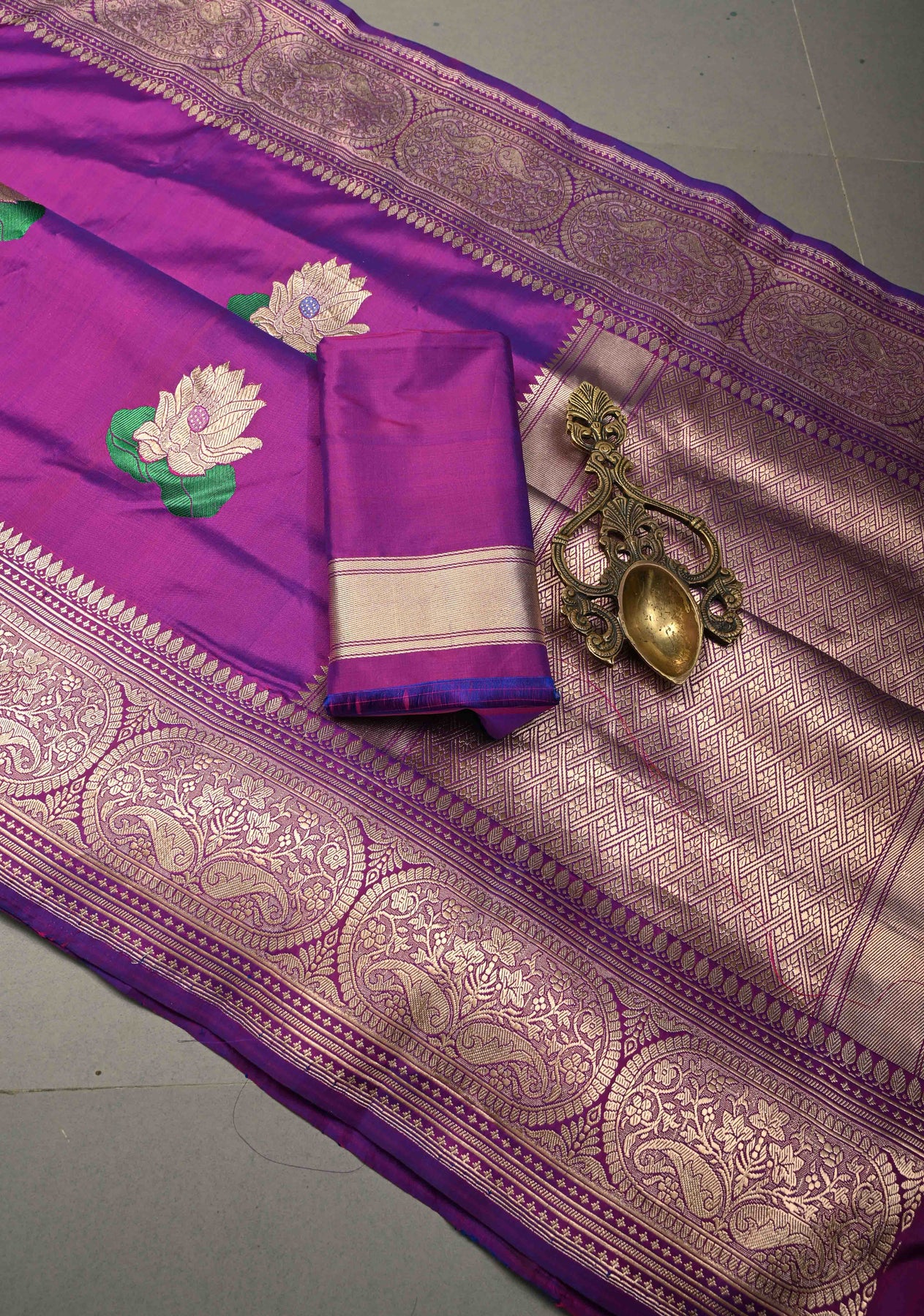 Elevate your festive wardrobe with this Purple Dual Tone Banarasi Katan Silk Saree, a masterful blend of traditional Banarasi weaving and regal elegance. Woven from pure Katan silk, the saree boasts a smooth texture, lustrous finish, and a graceful drape that exudes sophistication.
