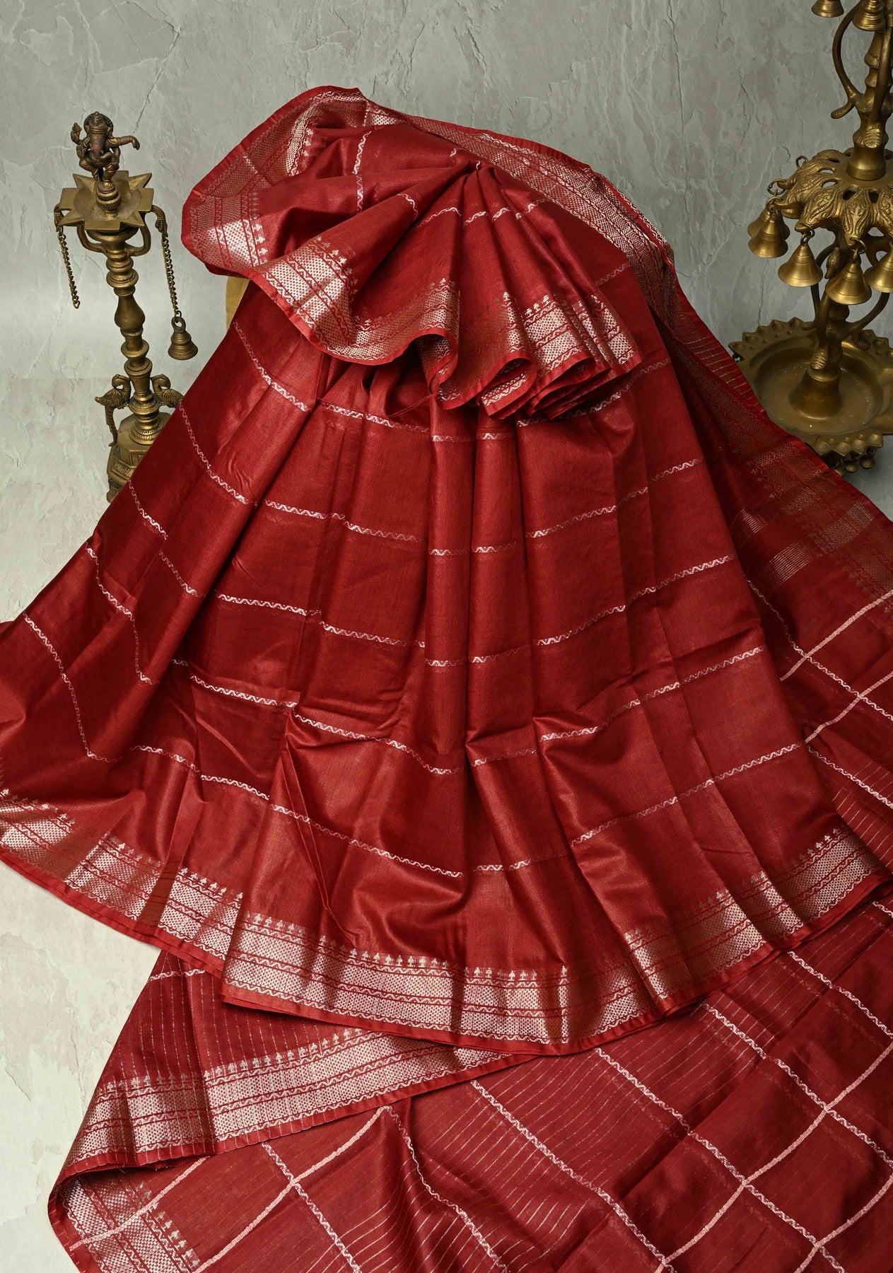 Step into classic elegance with this Maroon Semi Tussar Saree, crafted from soft, breathable semi-tussar fabric that drapes beautifully and feels lightweight. The maroon body is adorned with delicate thread stripes, adding subtle texture and refined charm. A shimmering zari border frames the saree, enhancing its traditional appeal and making it perfect for weddings, festive occasions, and cultural celebrations. Timeless, graceful, and effortlessly stylish, this saree is ideal for any special event.