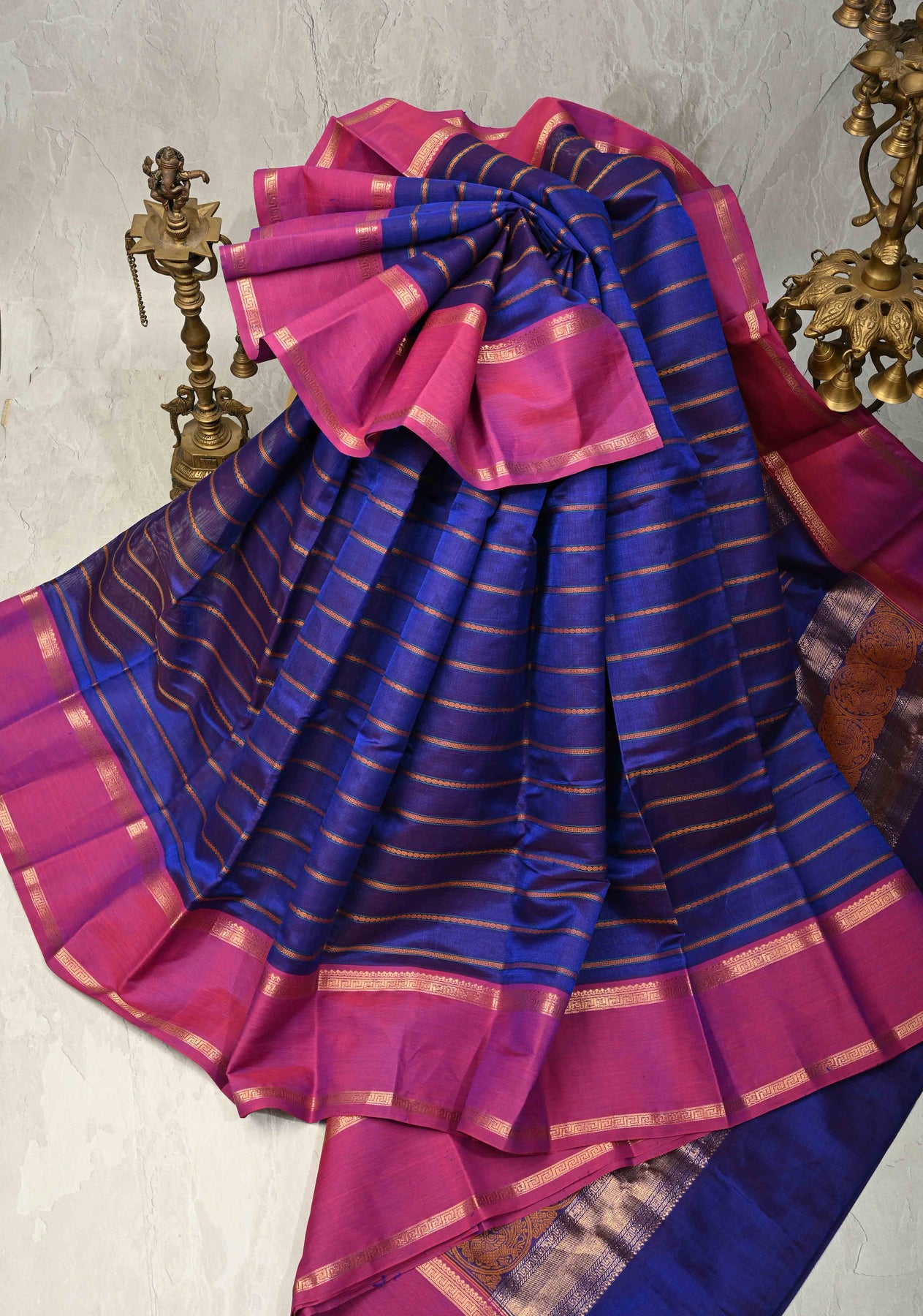 Handwoven by skilled artisans of Kanchipuram, this saree combines the best of silk’s luster and cotton’s lightness, making it soft, breathable, and easy to drape. The timeless blue-and-pink pairing adds just the right touch of tradition and charm — a combination that never fails to enchant.