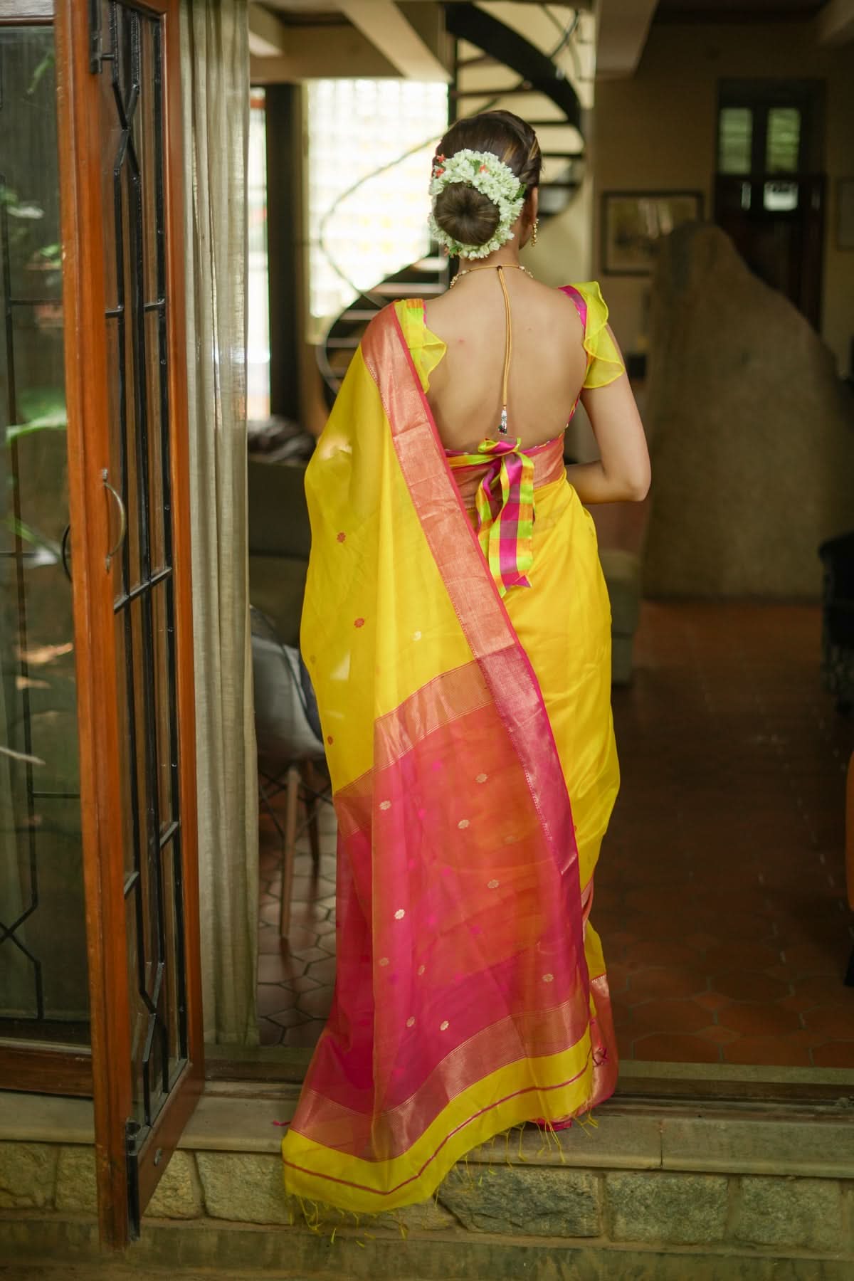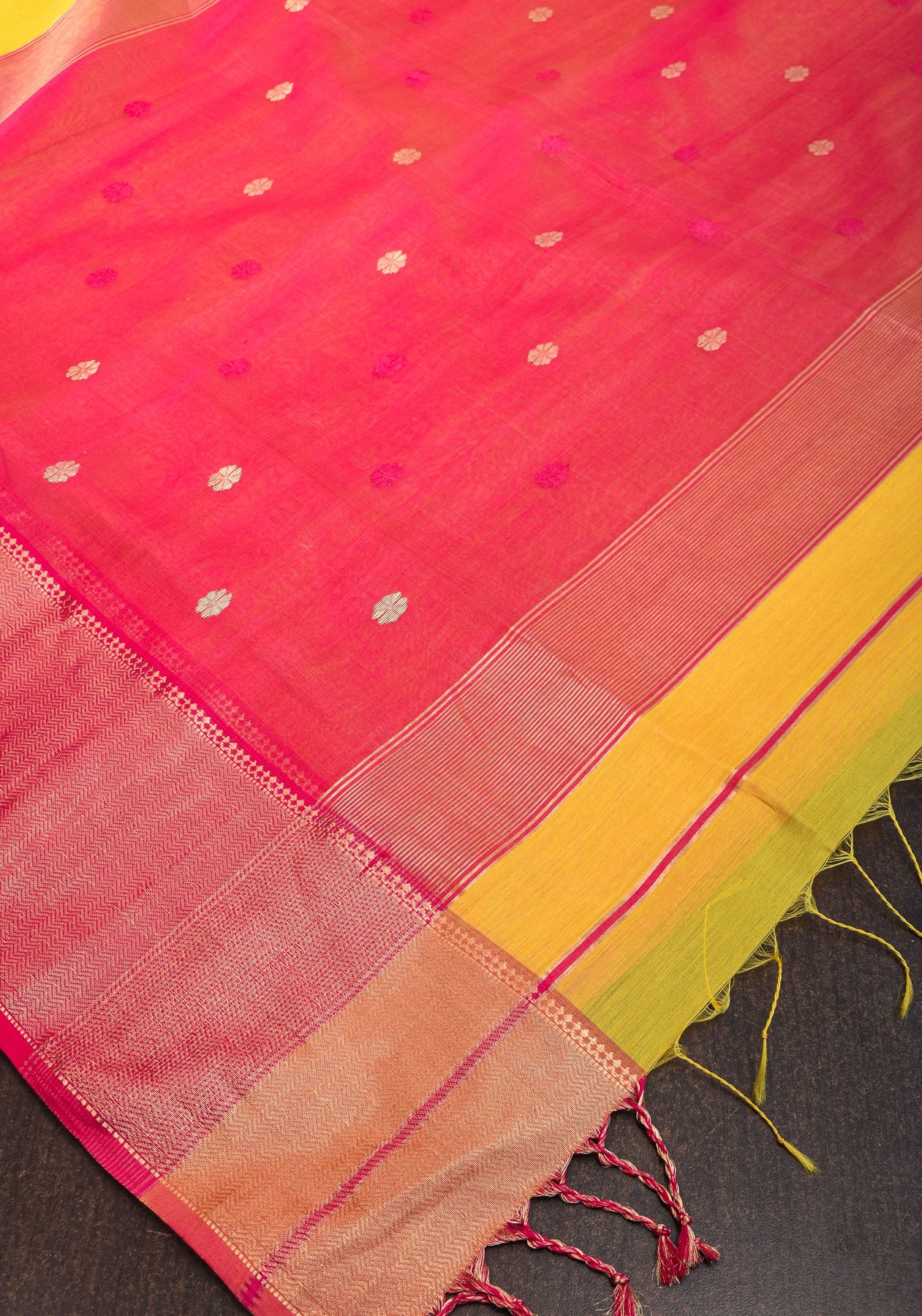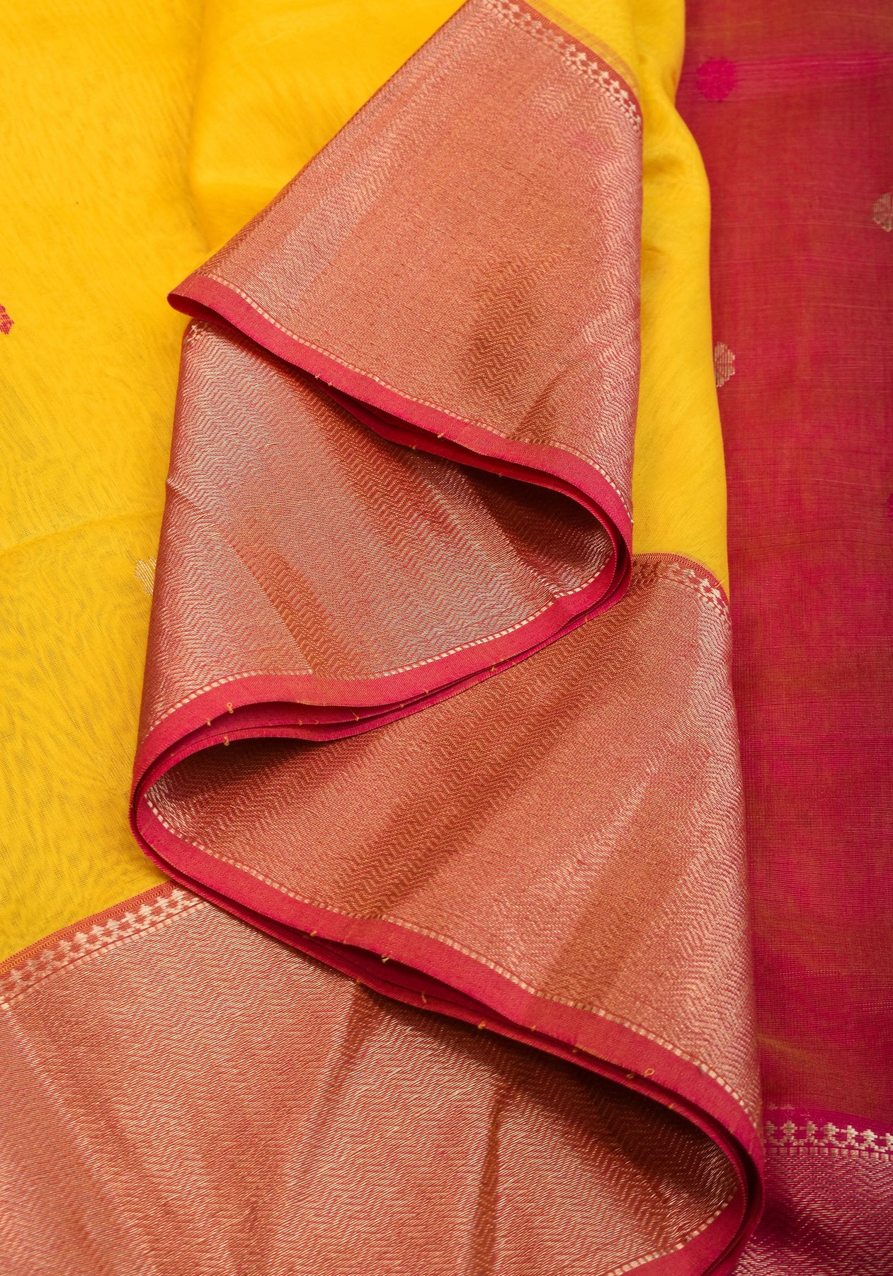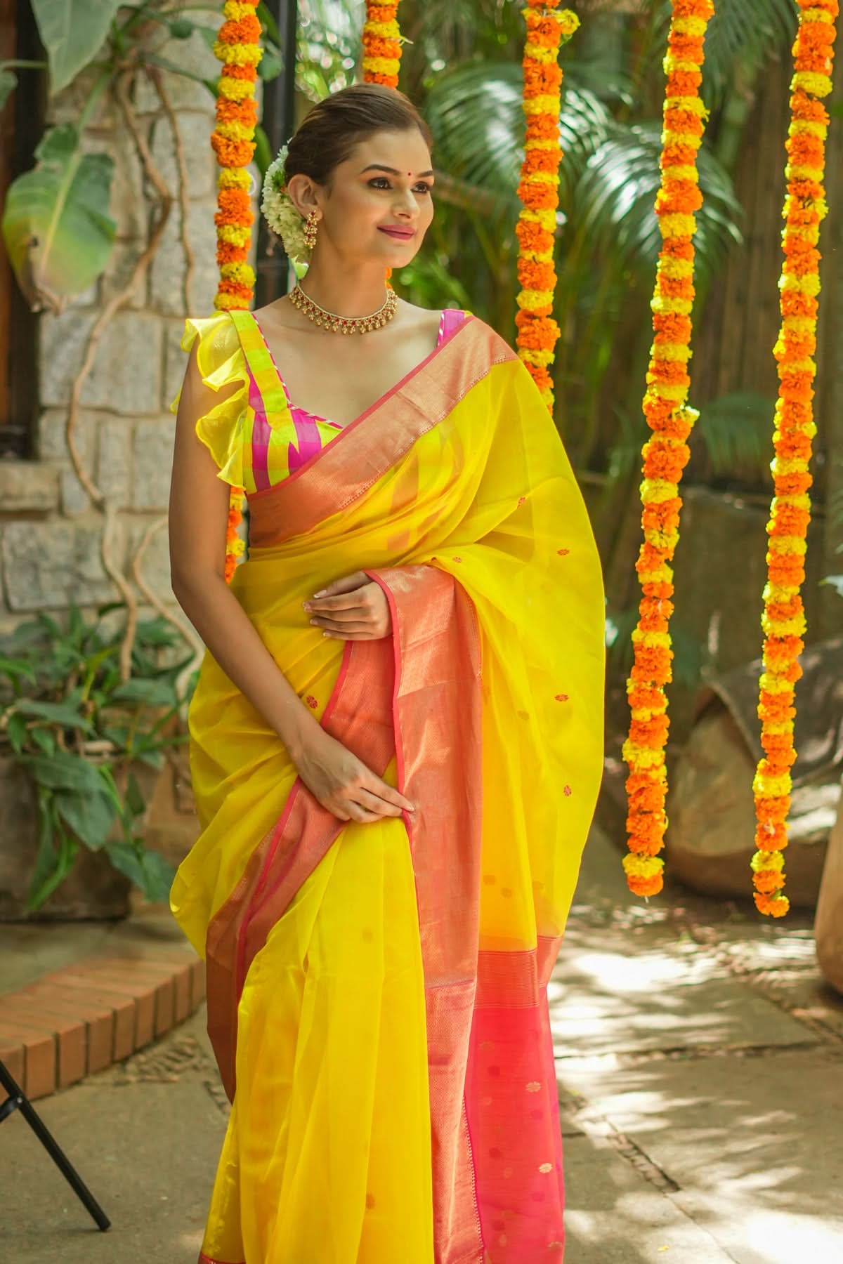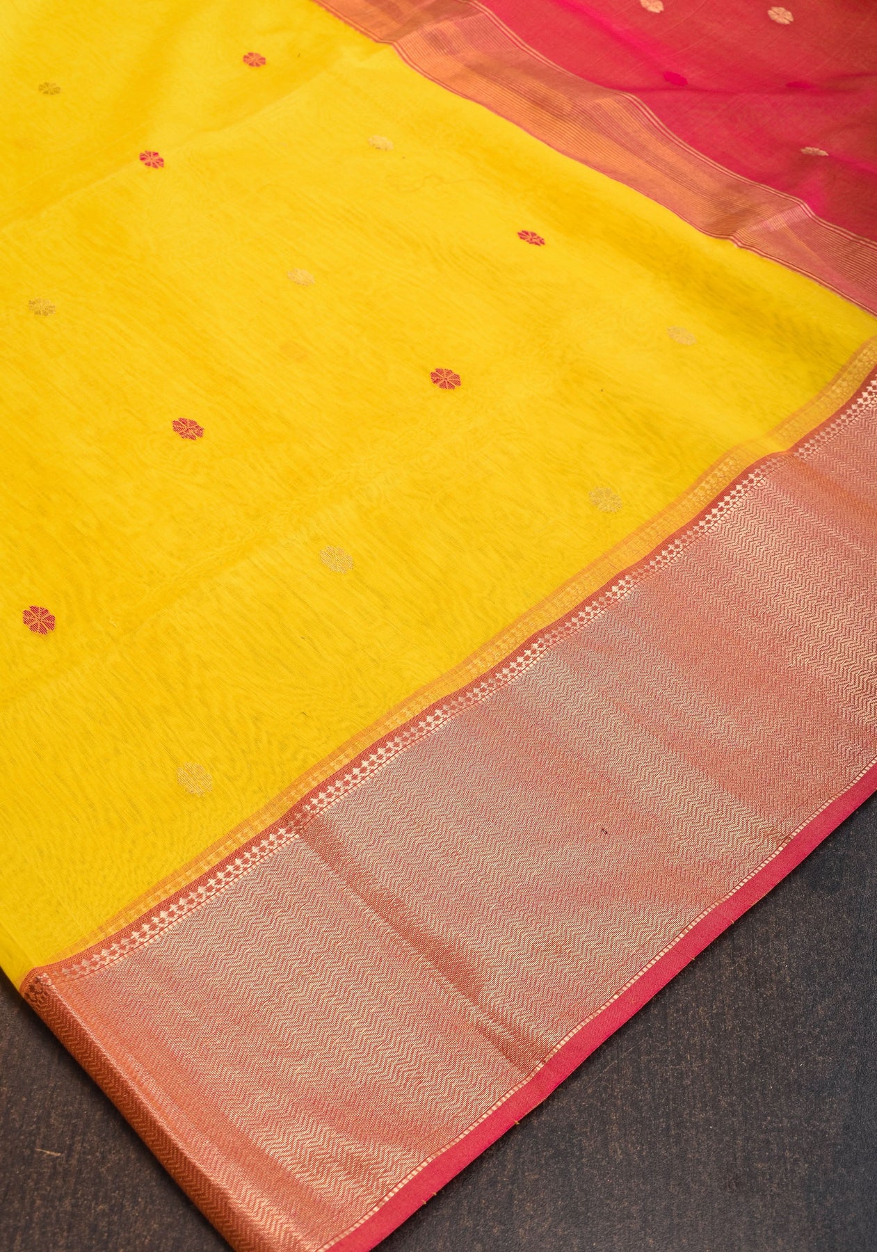 The luster of this fine fabric and minimalistic design elements makes these sarees a hot favorite for any grand occasion. This saree comes in an attractive Yellow shade and Gold & Pink bhuttas adorn the body and pallu of the saree, the zari-toned borders and pallu adds to the regality of this light and airy 6 yards.