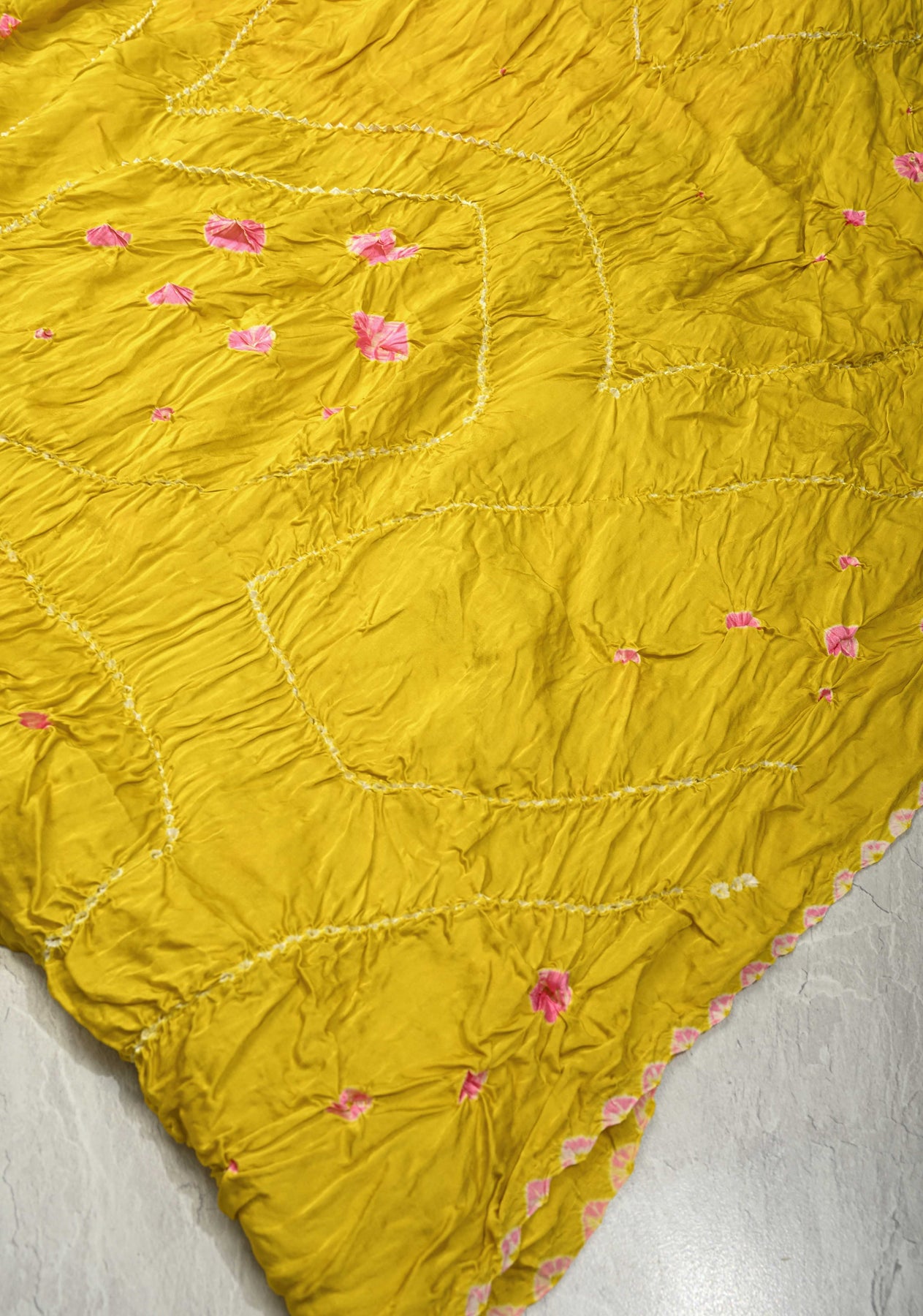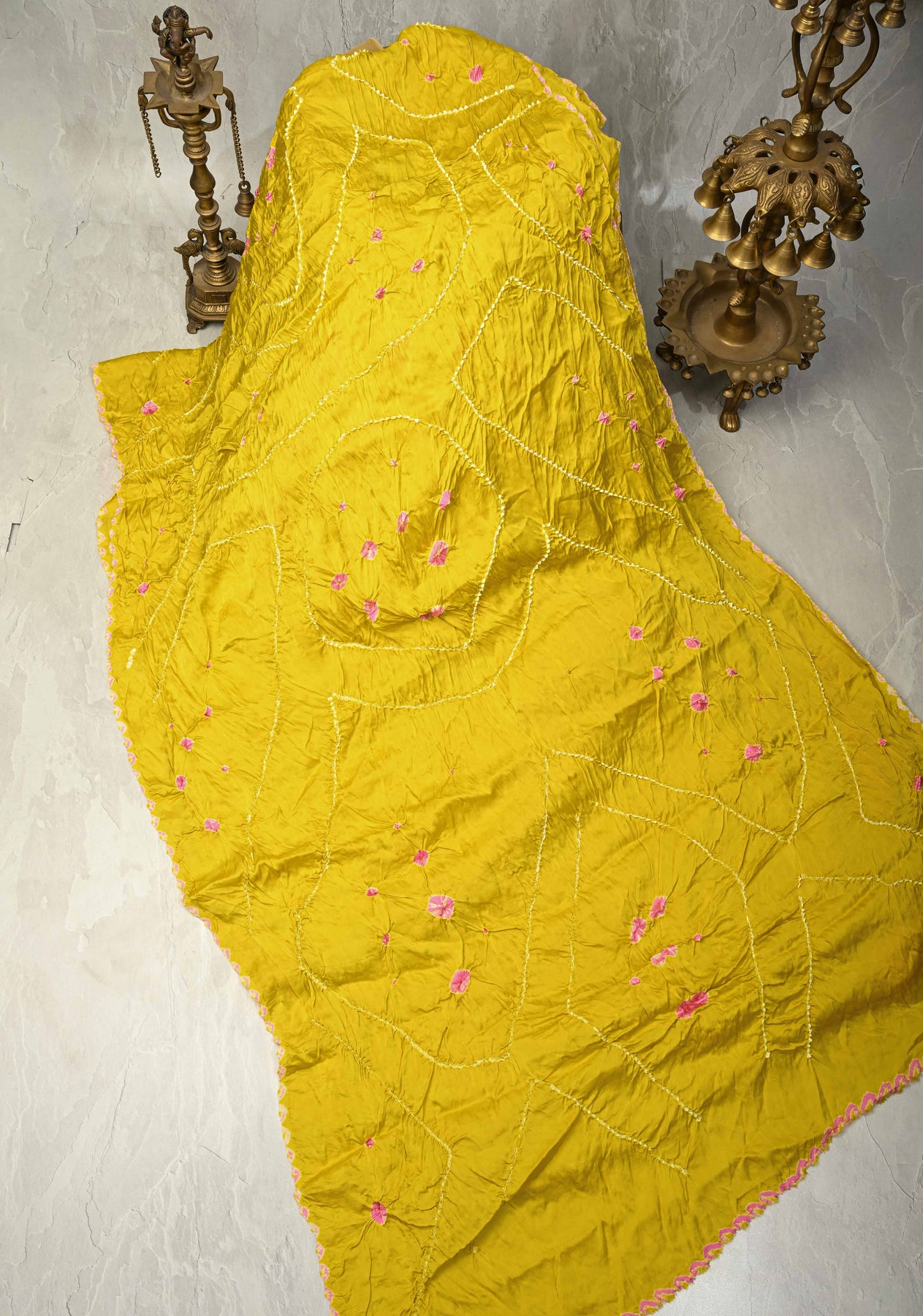 This moss yellow modal silk saree beautifully blends vibrant color with intricate craftsmanship. The saree features exquisite Bandhani tie-dye patterns, adding an artistic, traditional touch to the soft, modal silk fabric. The design is further elevated by the delicate Kungra borders, showcasing fine detailing that reflects timeless craftsmanship. The warm moss yellow hue enhances the overall charm, making it perfect for festive occasions, cultural events, and celebrations. With its graceful drape and rich aesthetic, this saree is a stunning choice for those seeking a fusion of heritage and elegance.