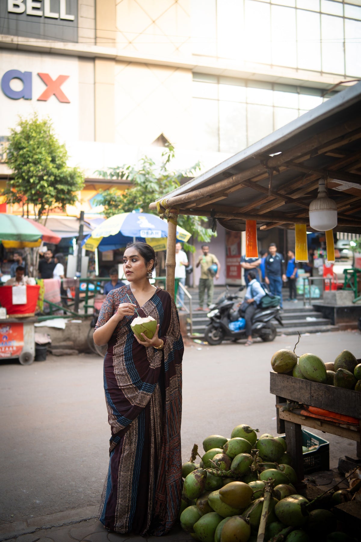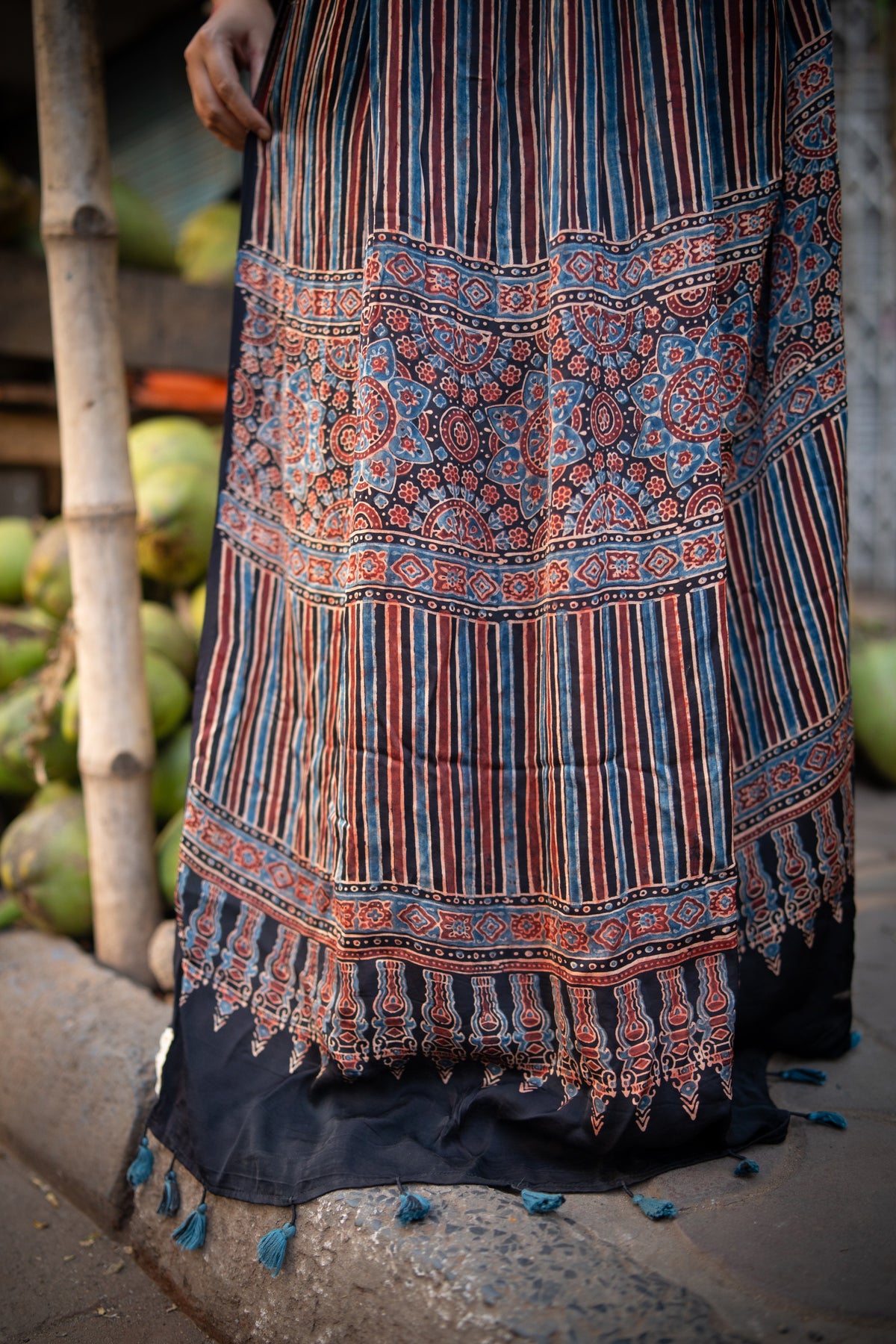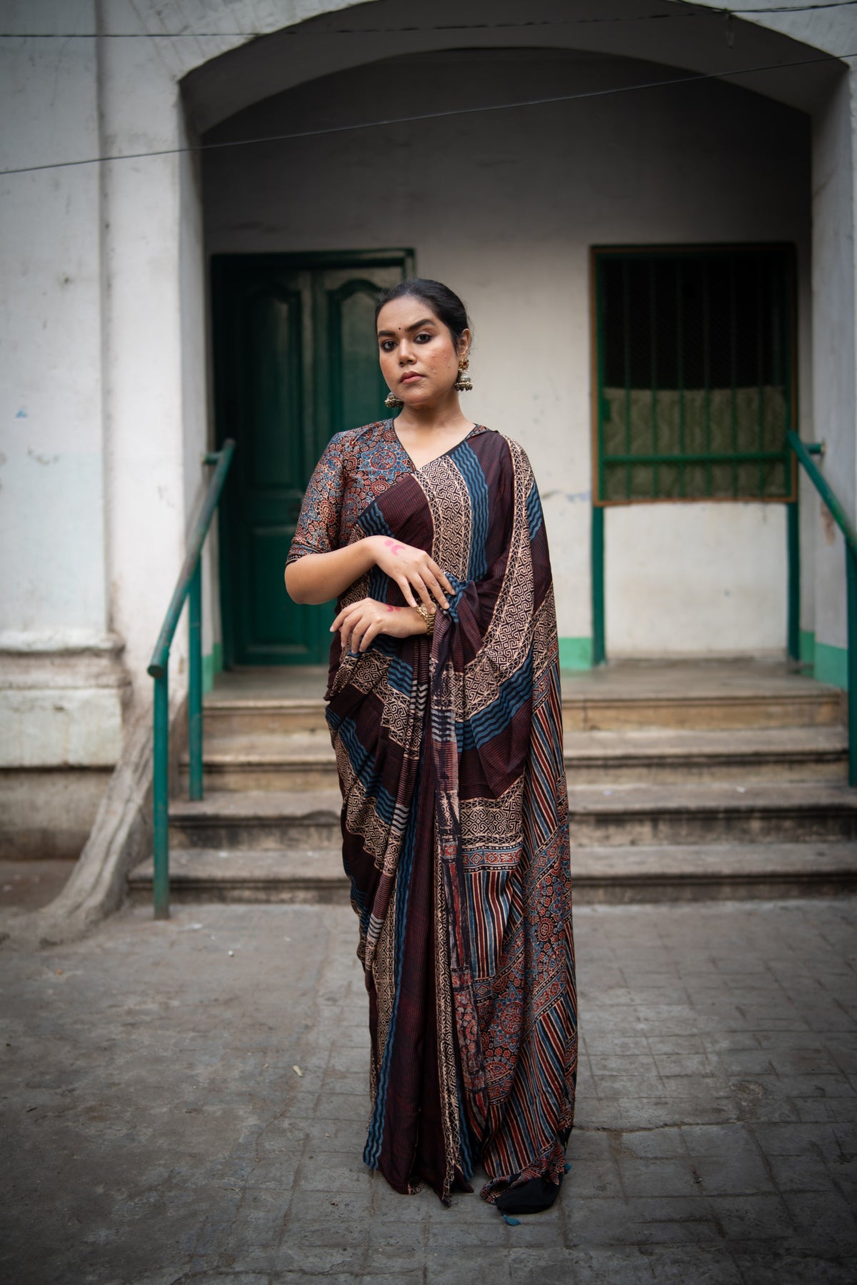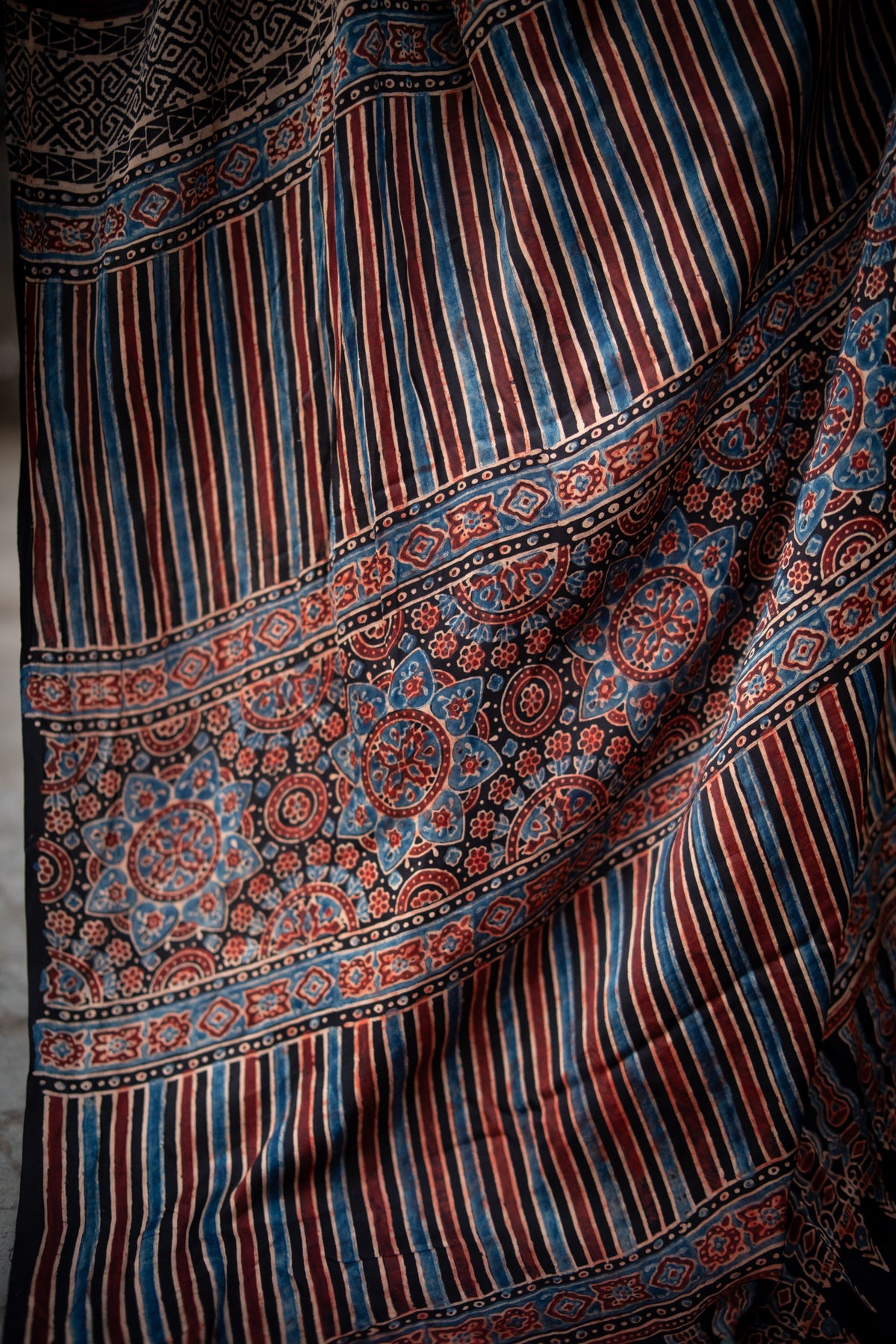 The Multicolor Ajrakh Hand Block Print on Modal Silk Saree with Panel Design is a vibrant expression of traditional craftsmanship and contemporary elegance. Made from soft and fluid modal silk, this saree features Ajrakh hand block prints in a striking multicolor palette, arranged in a unique panel design that adds dimension and visual intrigue. The intricate motifs, crafted using natural dyes, reflect the deep-rooted heritage of Ajrakh art. Lightweight, breathable, and effortlessly stylish, this saree is perfect for artful daywear, cultural events, or elegant casual gatherings.