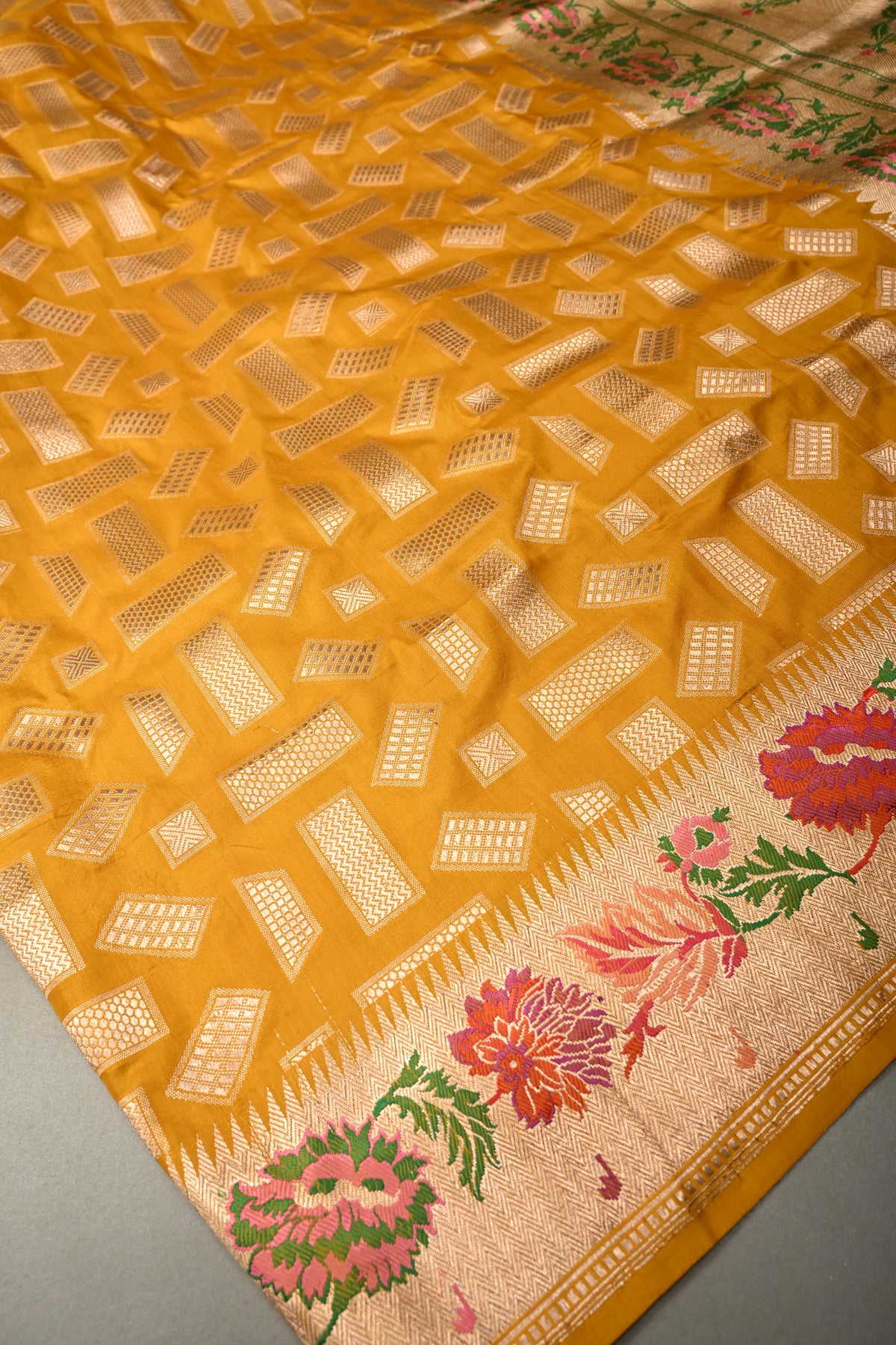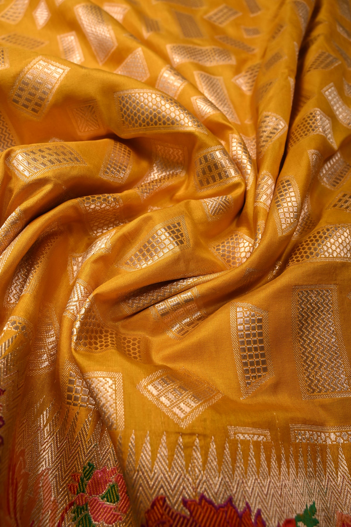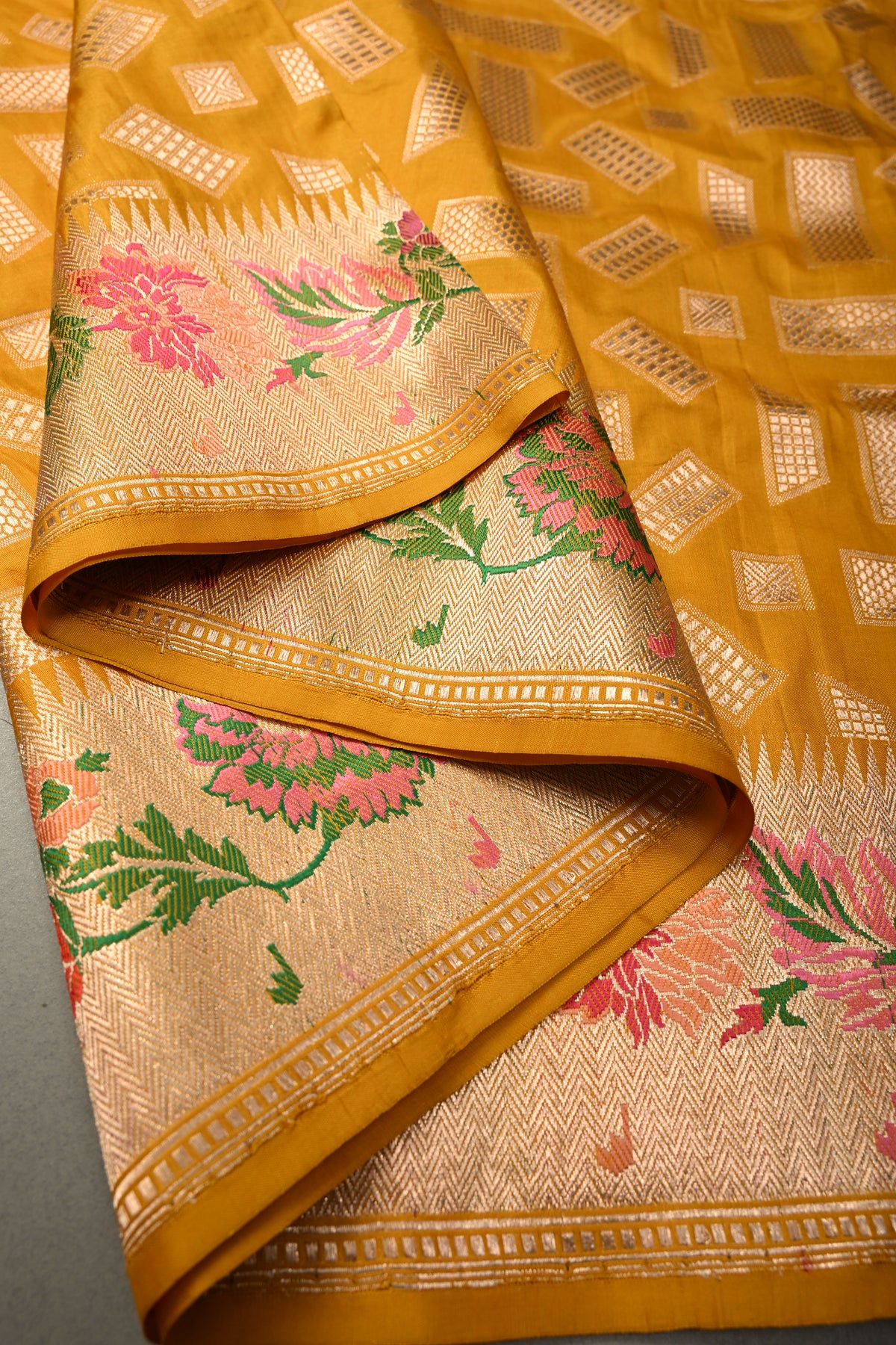 The body features delicate zari brocade work with intricate patterns in shimmering gold, beautifully complementing the warm mustard yellow base. The saree is further enhanced by a Meenakari zari border, incorporating vibrant, traditional meenakari work that adds a refined pop of color and a heritage-inspired finish.