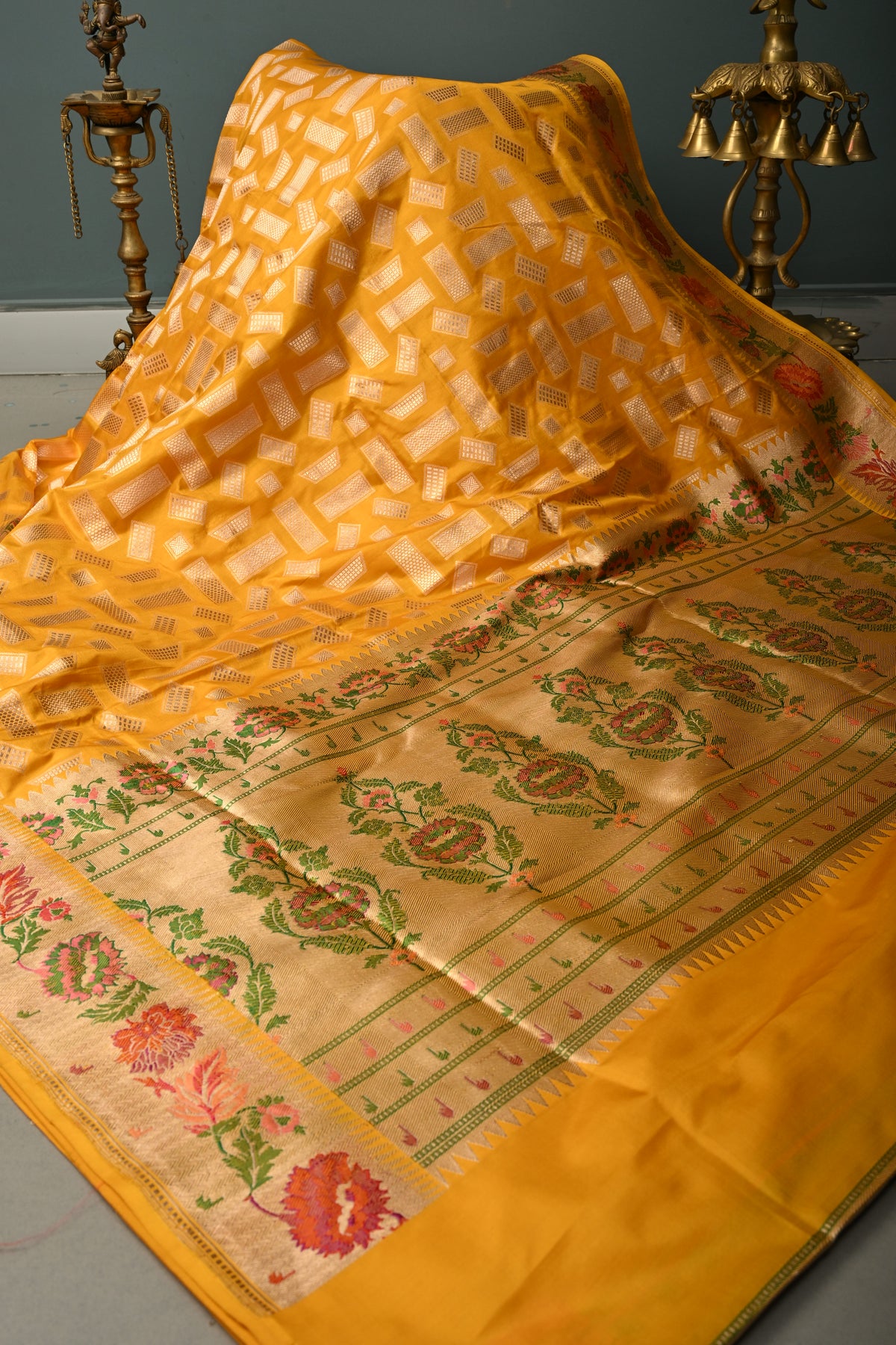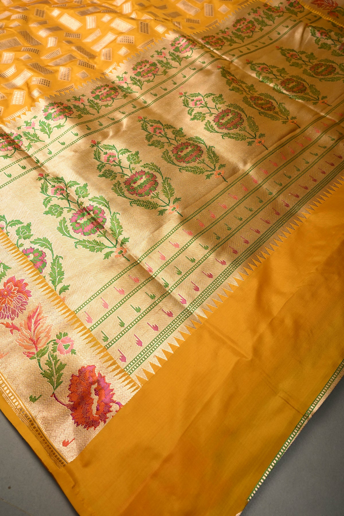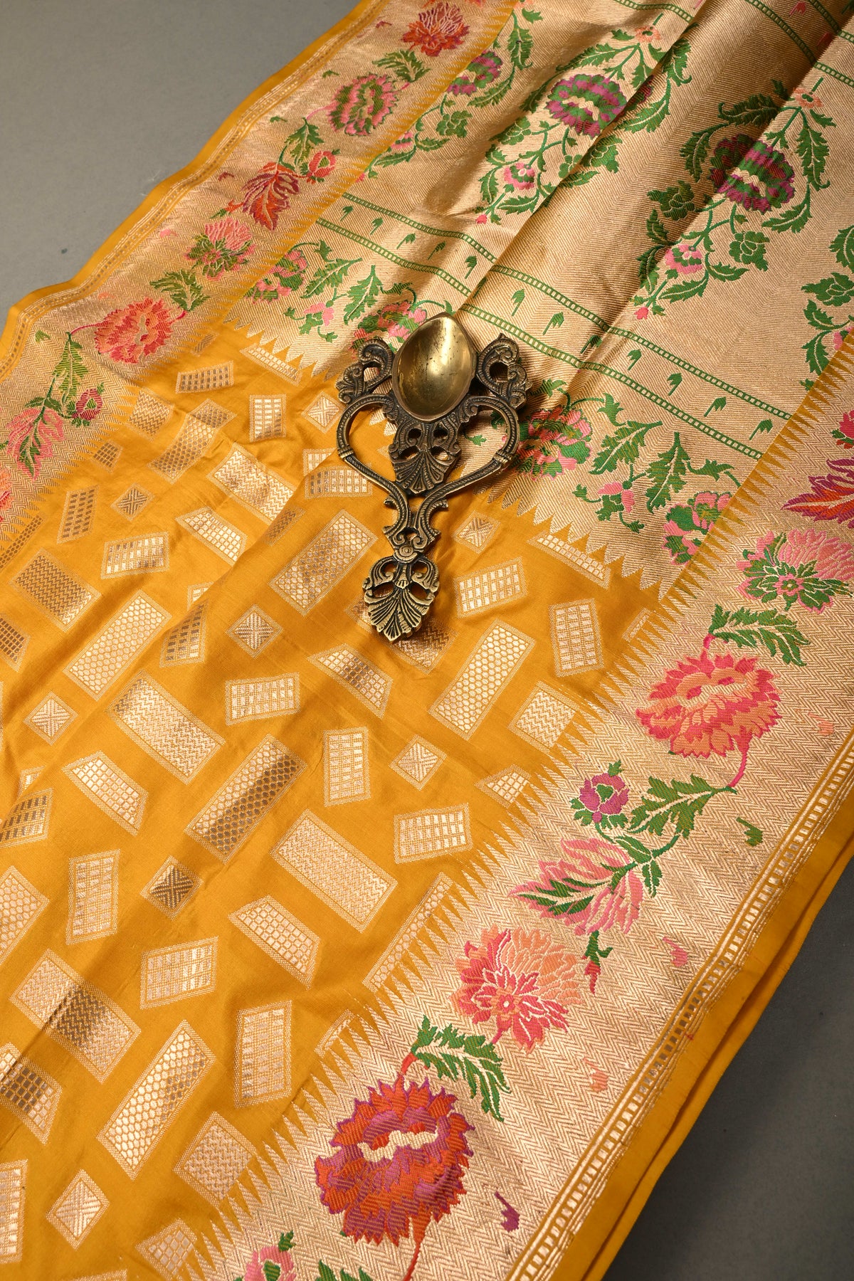 The body features delicate zari brocade work with intricate patterns in shimmering gold, beautifully complementing the warm mustard yellow base. The saree is further enhanced by a Meenakari zari border, incorporating vibrant, traditional meenakari work that adds a refined pop of color and a heritage-inspired finish.