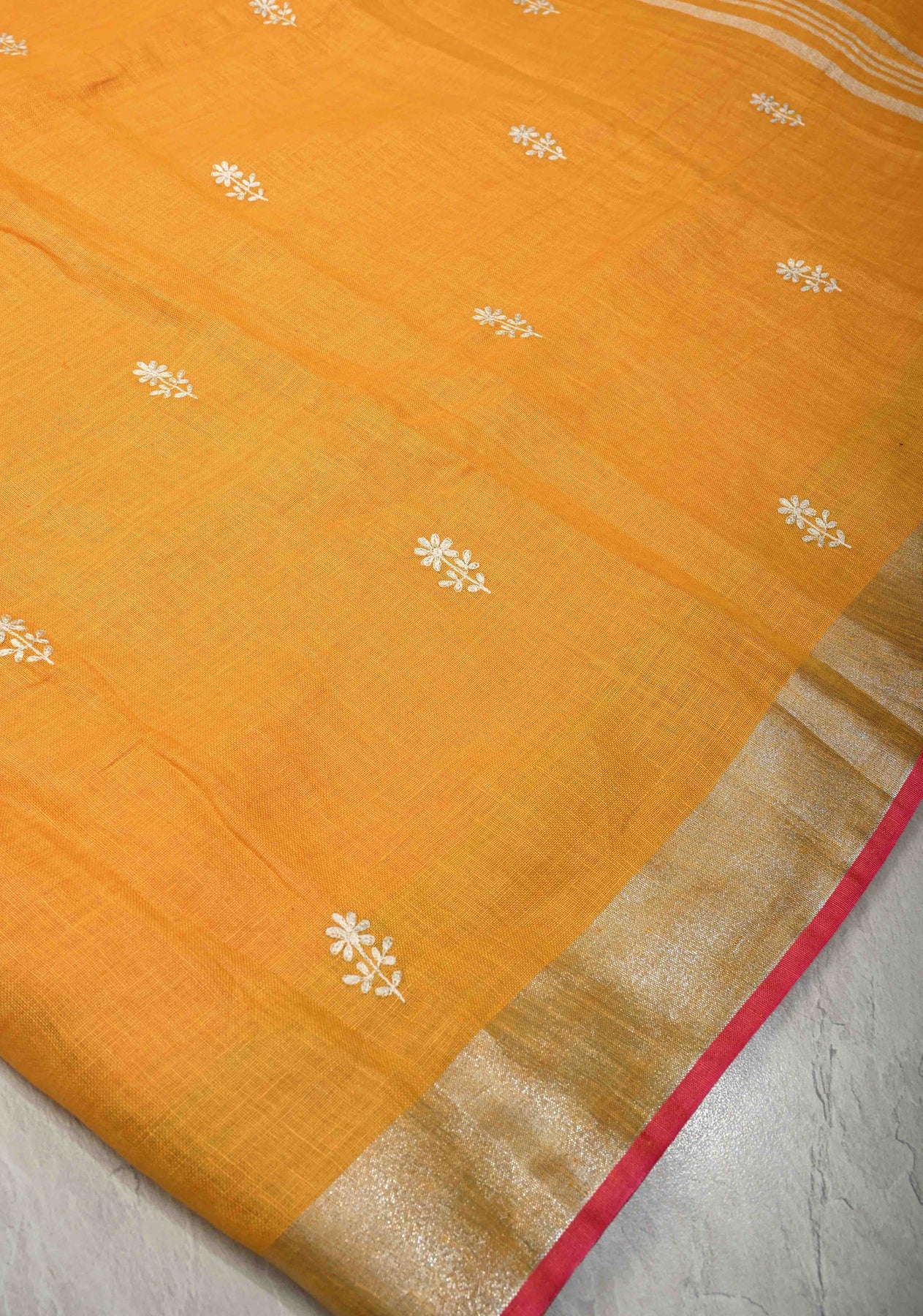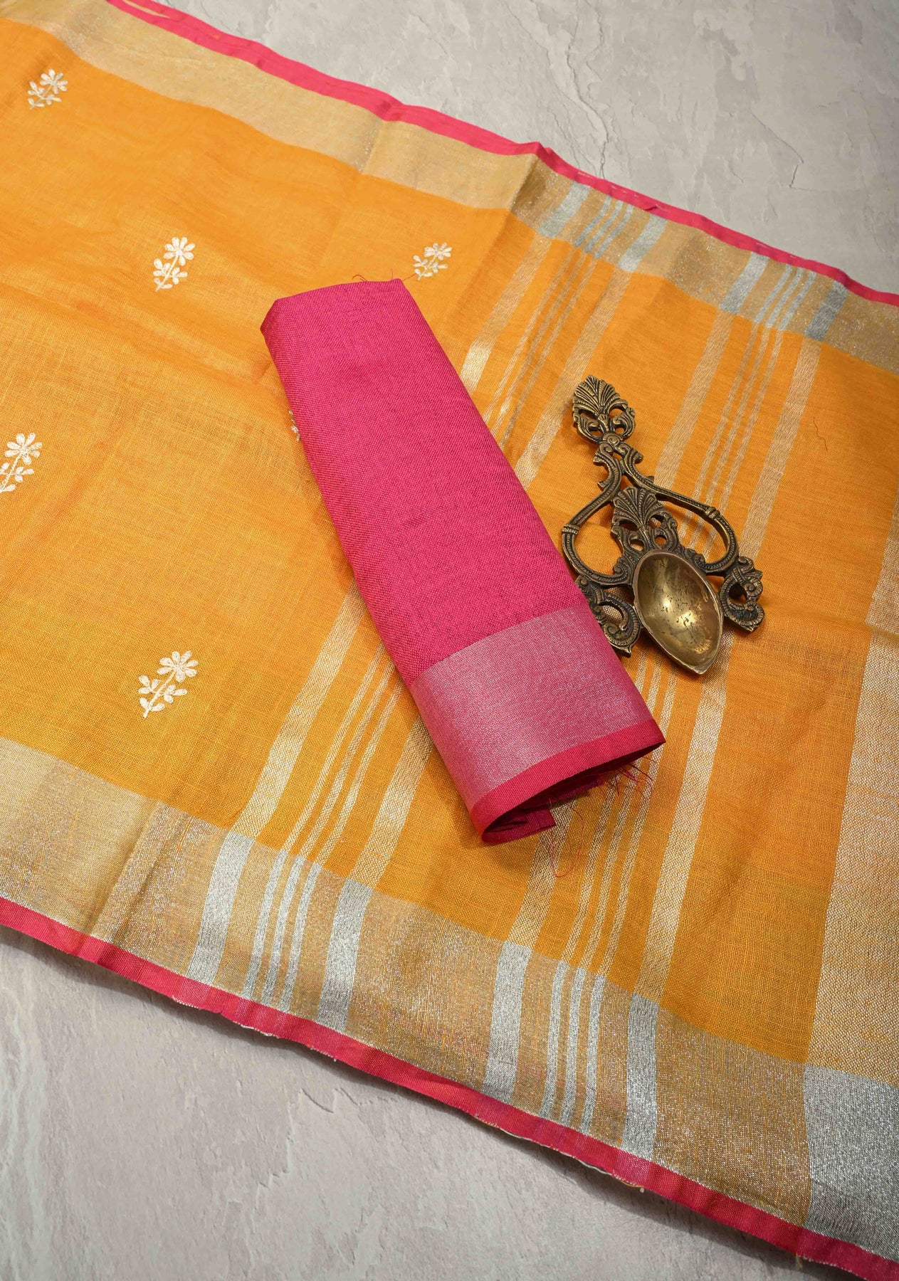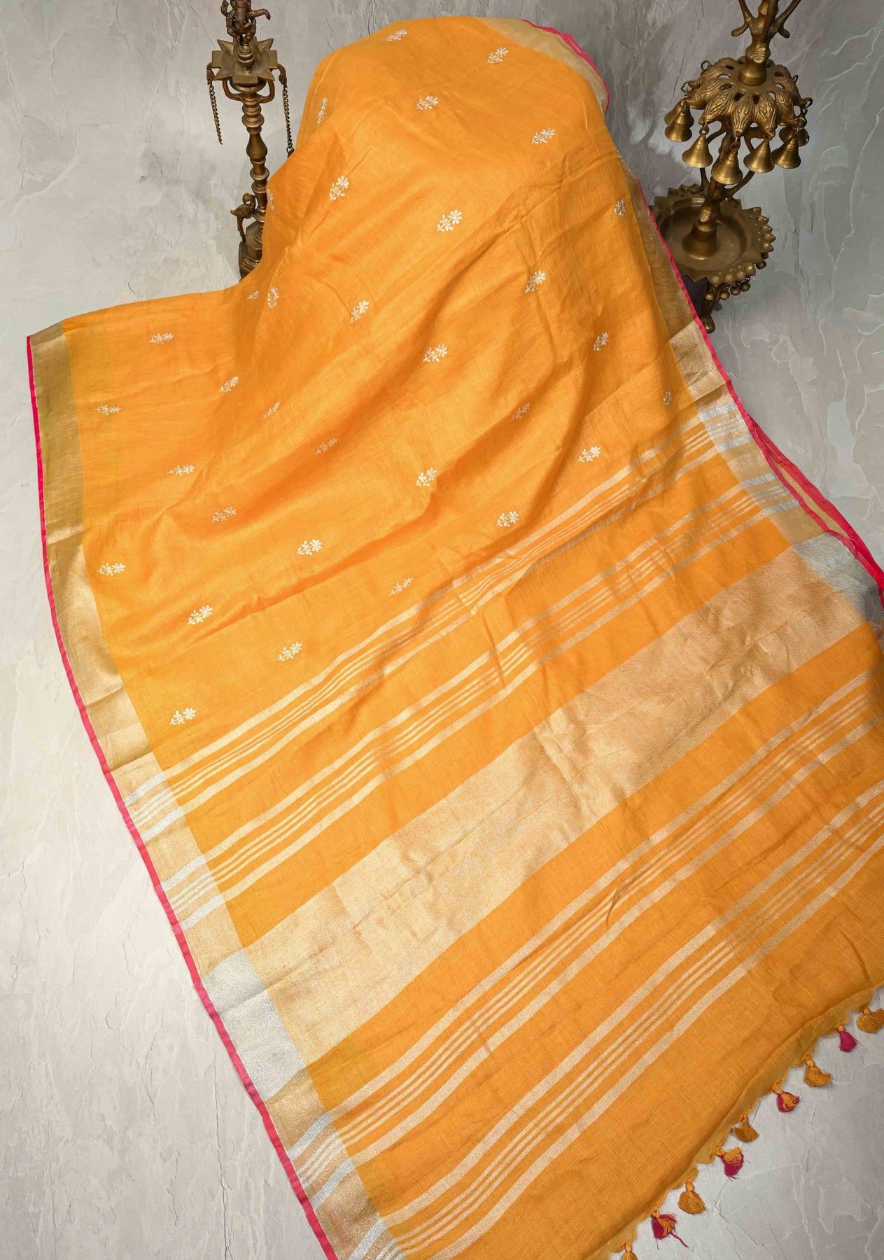 Brighten your ethnic wardrobe with this Mustard Yellow Linen by Linen Saree with Floral Thread Buttas and Zari Border. Crafted from breathable and lightweight linen-by-linen fabric, this saree offers exceptional comfort with an elegant natural texture. Delicately adorned with floral thread buttas, it adds a touch of subtle charm, while the zari border enhances its traditional appeal. The vibrant mustard yellow hue makes it perfect for festive occasions, cultural gatherings, office wear, or daytime celebrations. A beautiful blend of simplicity, craftsmanship, and timeless elegance, this saree is a must-have for refined ethnic styling.
