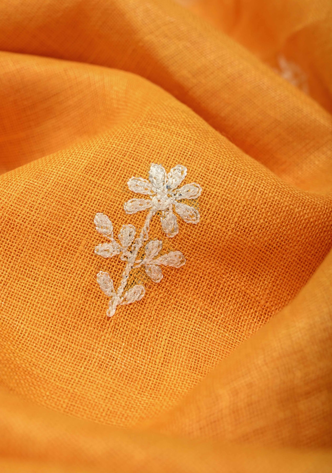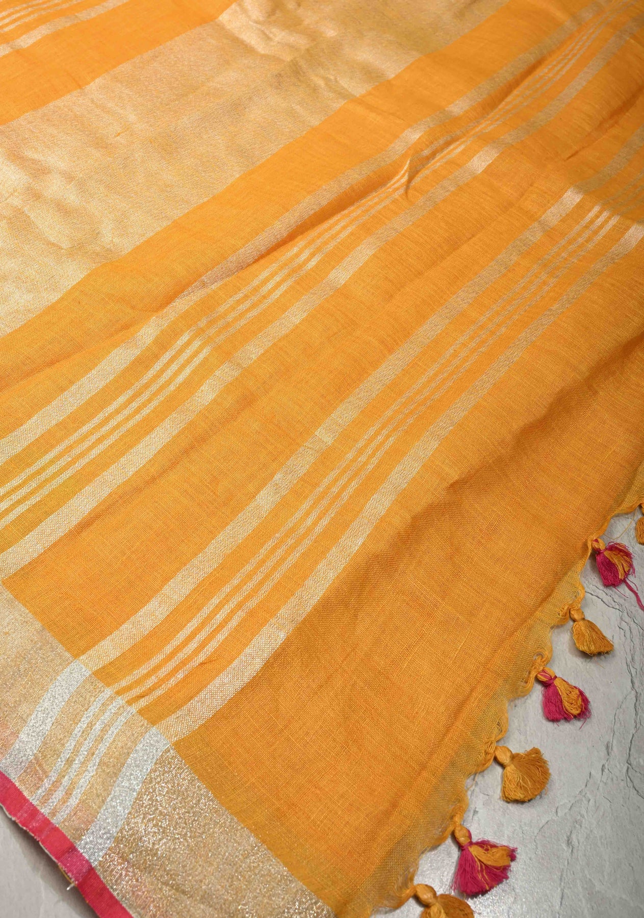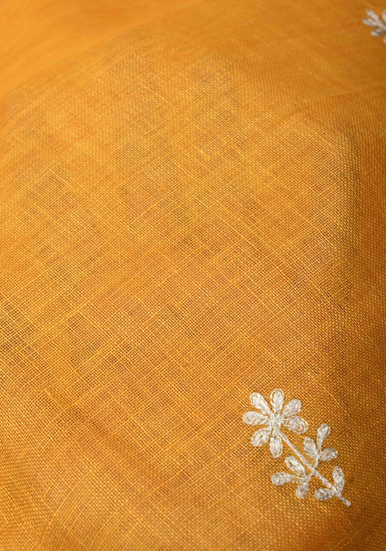 Brighten your ethnic wardrobe with this Mustard Yellow Linen by Linen Saree with Floral Thread Buttas and Zari Border. Crafted from breathable and lightweight linen-by-linen fabric, this saree offers exceptional comfort with an elegant natural texture. Delicately adorned with floral thread buttas, it adds a touch of subtle charm, while the zari border enhances its traditional appeal. The vibrant mustard yellow hue makes it perfect for festive occasions, cultural gatherings, office wear, or daytime celebrations. A beautiful blend of simplicity, craftsmanship, and timeless elegance, this saree is a must-have for refined ethnic styling.