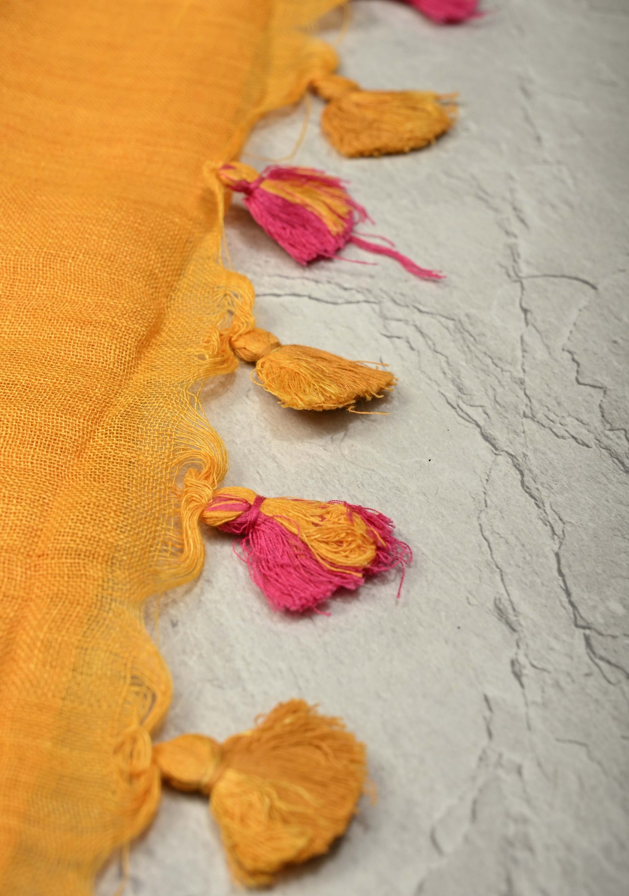 This saree is ready to wear with fall and pico done. Handmade tassels adorn the pallu and add more grace to it. An unstitched blouse fabric is included.