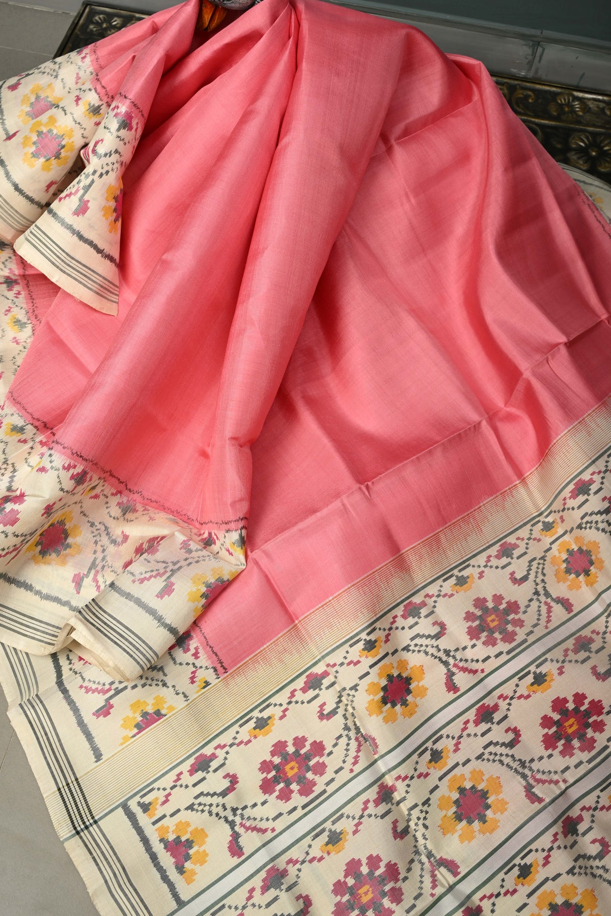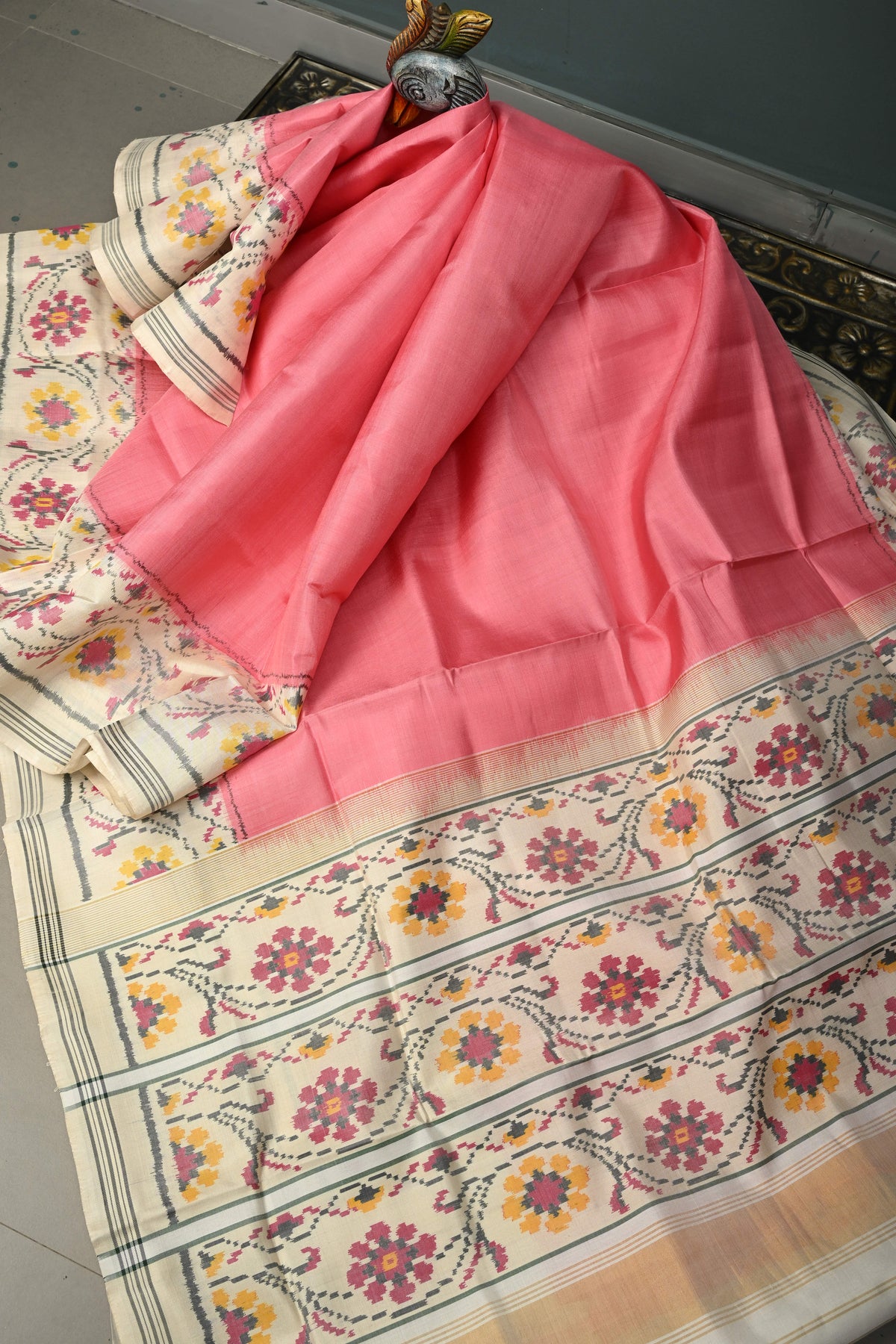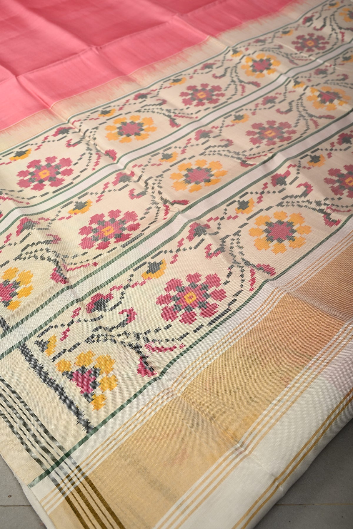 The Peach Authentic Patan Patola Single Ikkat Pure Silk Saree is a refined celebration of Gujarat’s iconic weaving tradition. Expertly handcrafted using the intricate single ikkat technique, this saree features a serene peach base adorned with elegant floral motifs that highlight its artistic precision. The contrast off-white border and pallu are accentuated with minimal zari detailing, offering a subtle shimmer that enhances its graceful appeal without overpowering the design. Woven in pure silk, this Patan Patola saree ensures a rich drape and timeless sophistication, making it an ideal choice for weddings, festive gatherings, and cherished cultural occasions.