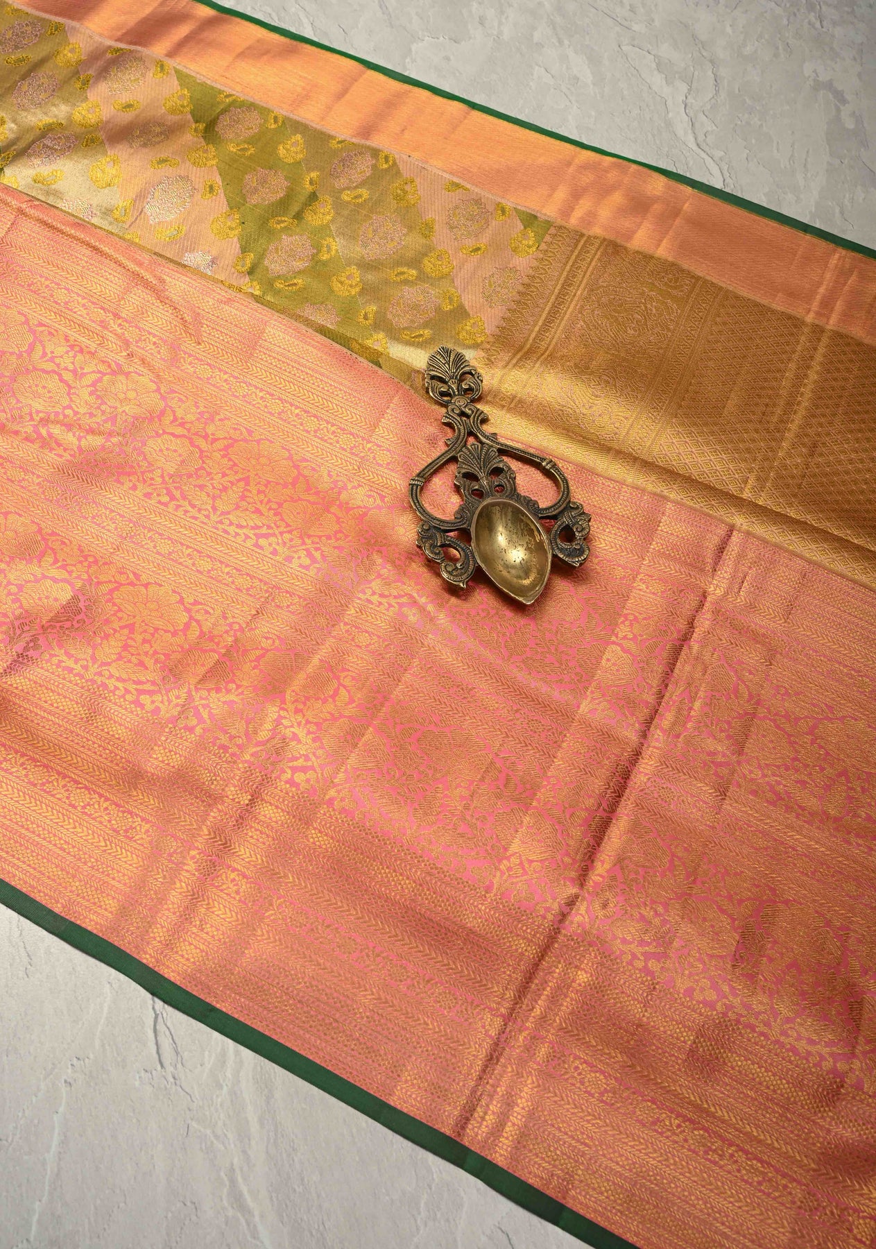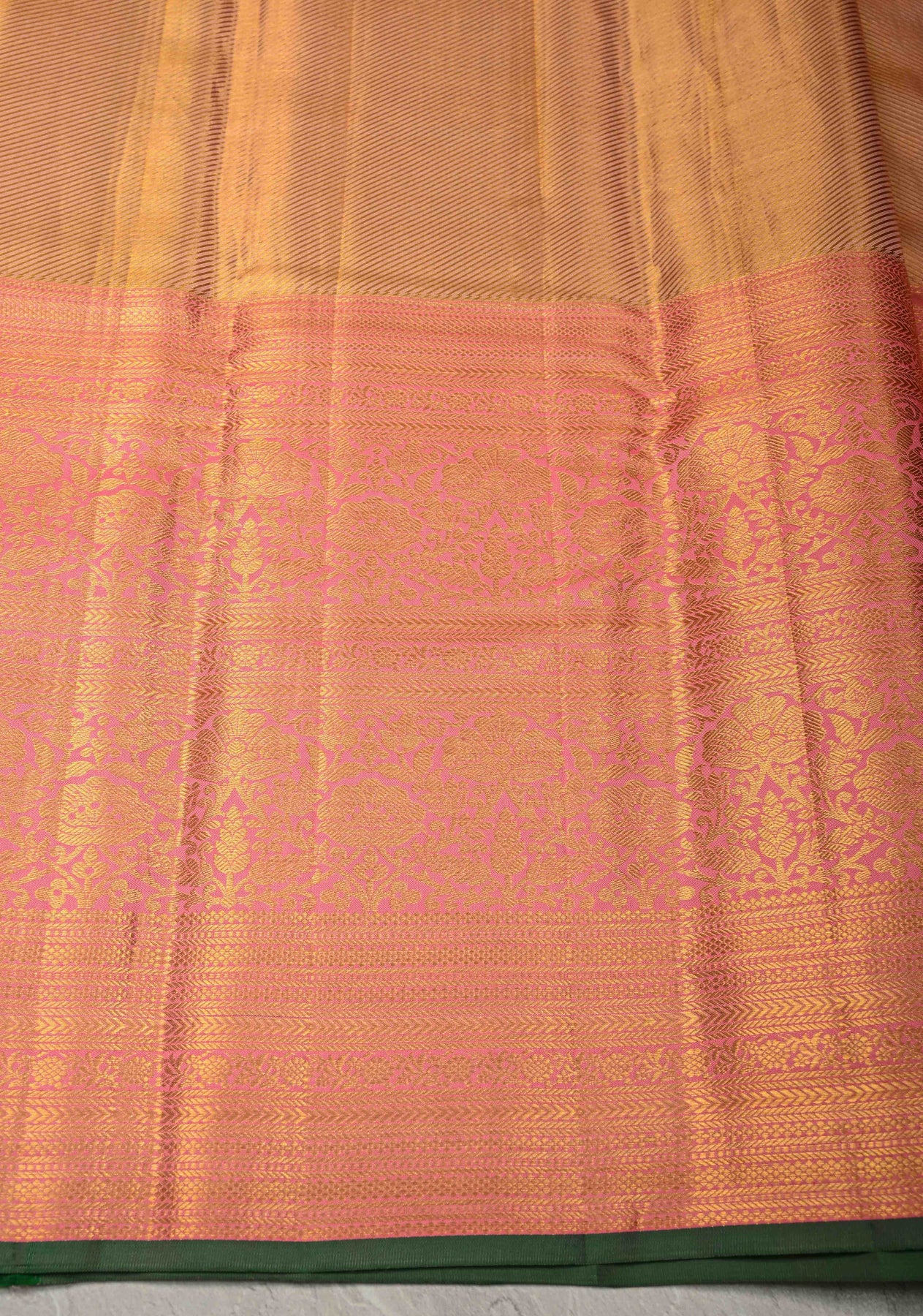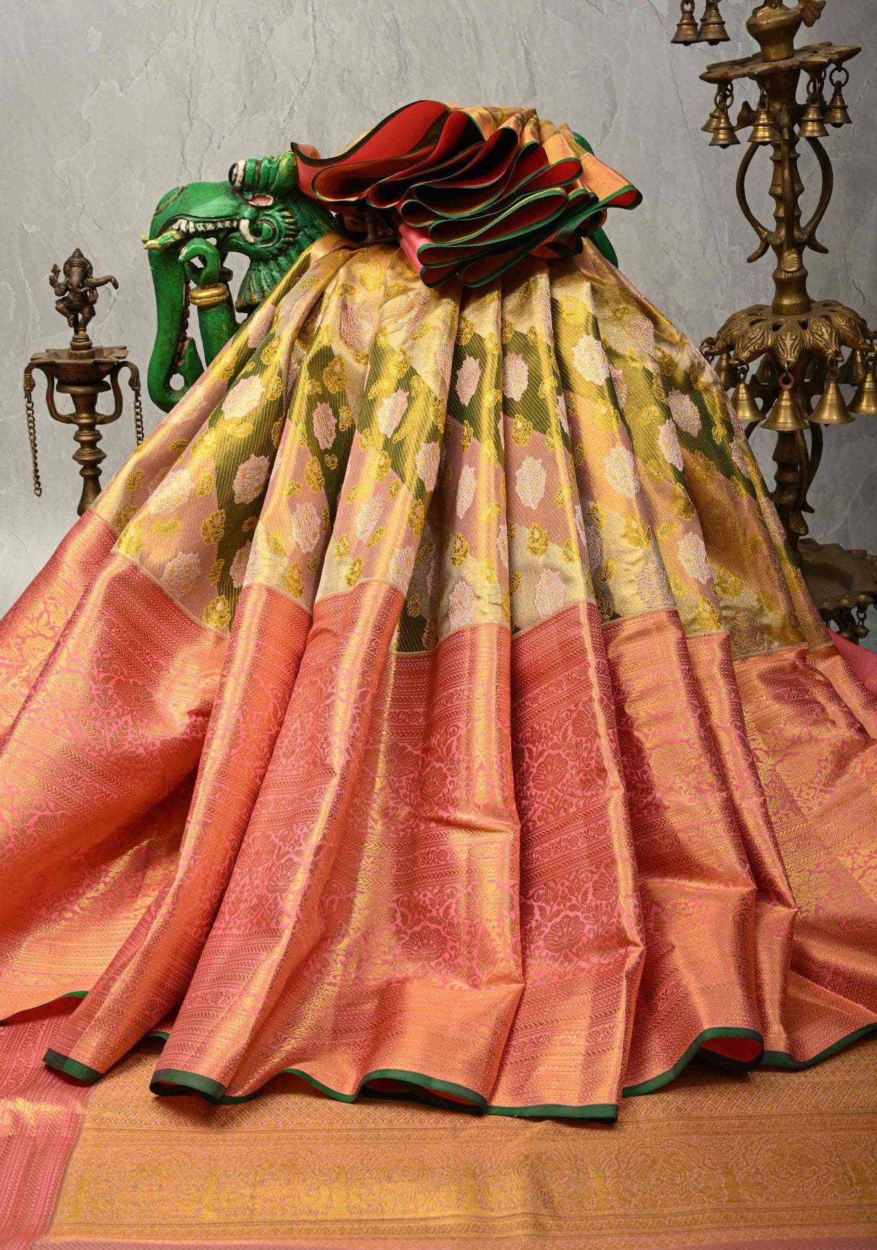 Embody sheer opulence with this Pink-Green-Gold Rangkaat Style Kanjivaram Tissue Silk Saree. Meticulously handwoven from pure tissue silk, it features a breathtaking fusion of colors accented by a luminous metallic sheen. The intricate diagonal pattern flows seamlessly across the body, culminating in a magnificent wide zari border that exudes royal grandeur. Perfect for brides and festive celebrations, this saree is a masterpiece of traditional.