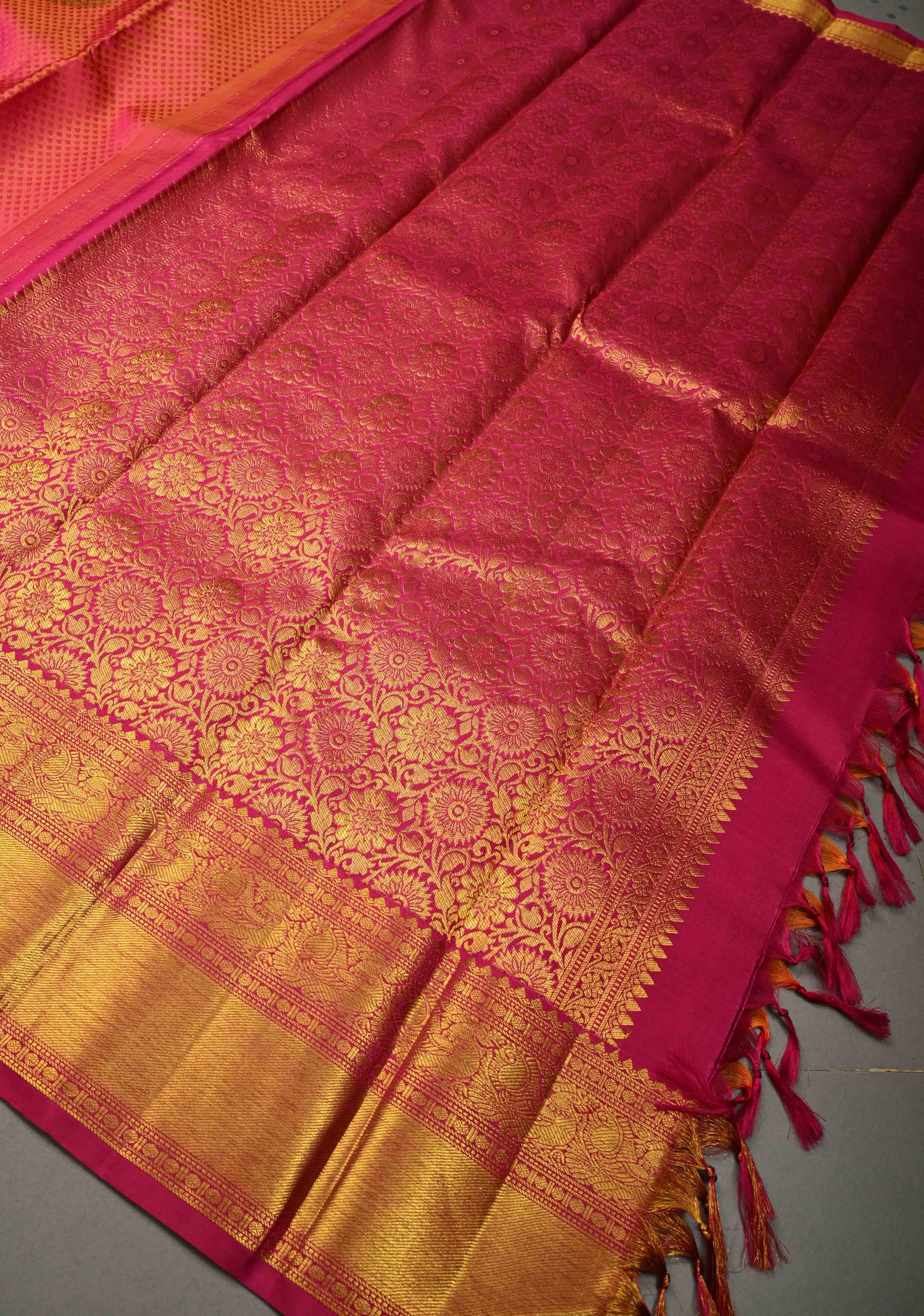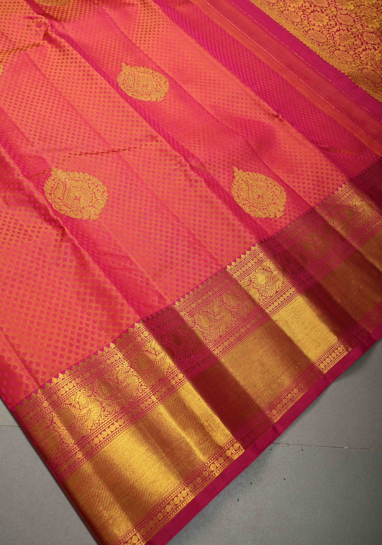 This pink–orange dual-tone Kanjivaram pure silk saree is a radiant blend of traditional artistry and vibrant elegance. The self brocade weave creates a rich textured base, beautifully enhanced with intricately woven zari buttas across the body. Crafted from Kanjivaram silk, the saree offers a luxurious sheen and a graceful, structured drape. The classic zari border adds a touch of timeless grandeur, perfectly complementing the dual-tone palette. An exquisite choice for weddings, festive occasions, and traditional celebrations, this saree reflects heritage craftsmanship at its finest.