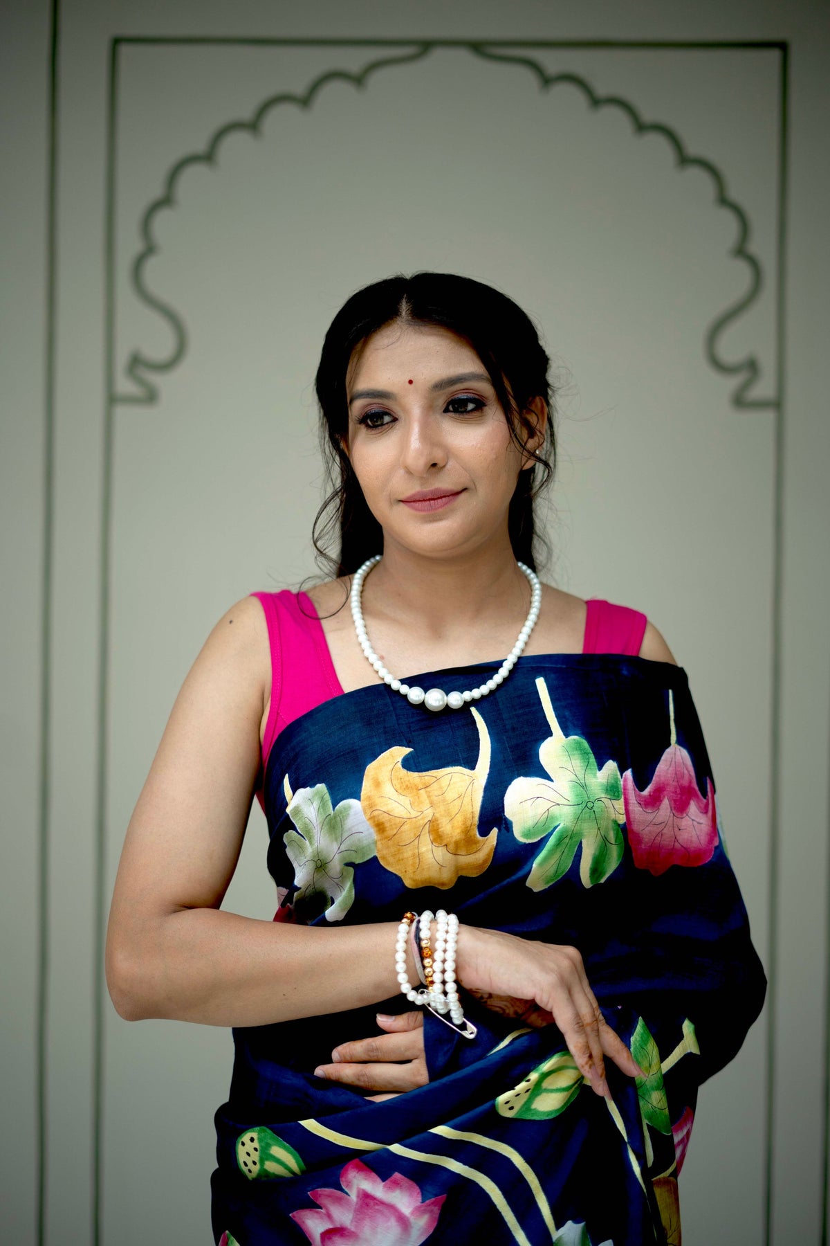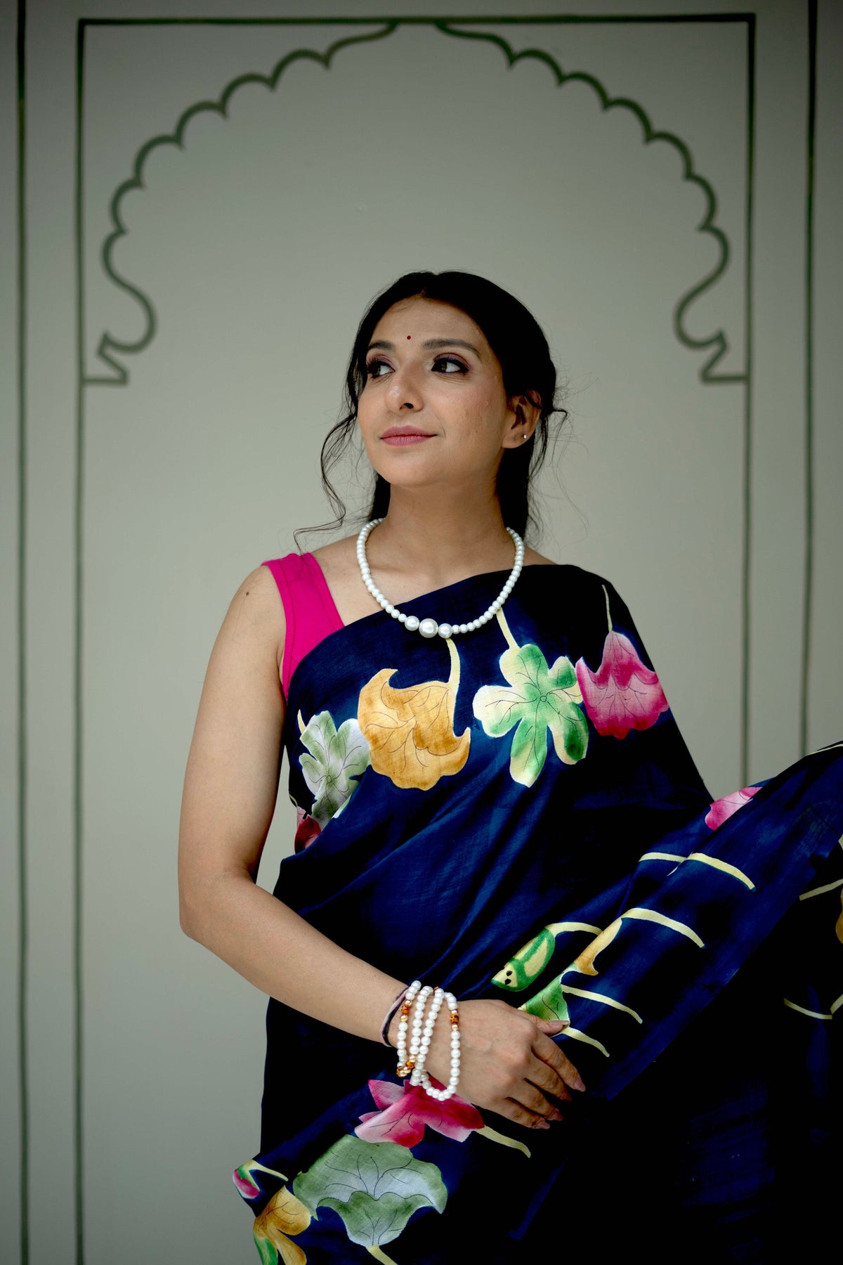 The Prussian Blue Pure Handloom Tussar Silk Saree with Kalamkari Pichwai Handpainting is a stunning tribute to traditional Indian art and handloom excellence. Crafted from pure handloom tussar silk, this saree features a deep and elegant Prussian blue base that provides the perfect canvas for intricate Kalamkari Pichwai handpainted motifs, inspired by temple art and devotional themes. Each brushstroke tells a story, showcasing the skill and dedication of the artisans. The natural texture of tussar silk adds a rustic charm, while the artistic detailing makes it a statement piece for festive occasions, cultural events, and artful gatherings.