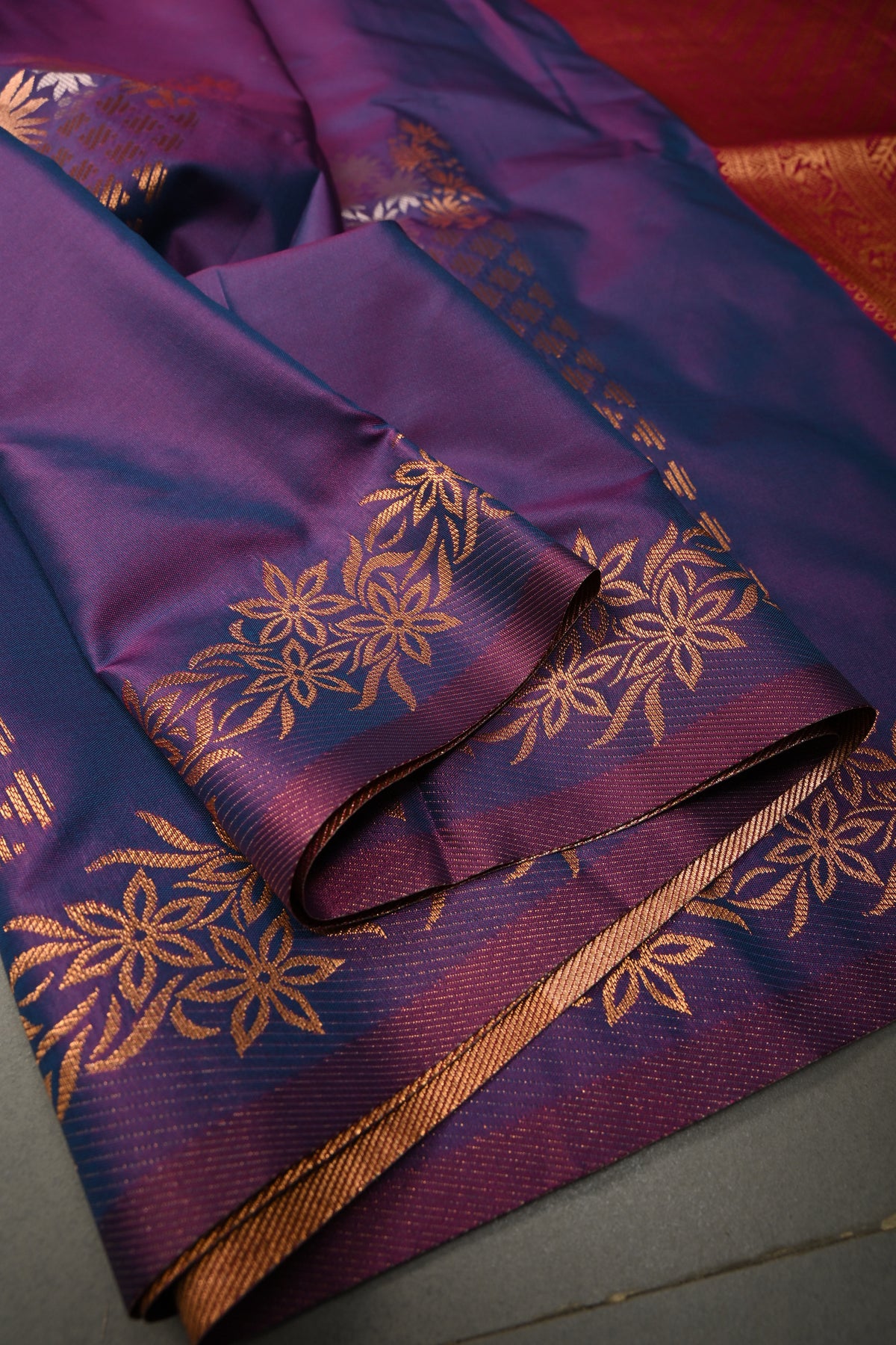 Celebrate timeless elegance with this beautiful Purple–Pink Dual Tone Kanchi Semi Silk Saree, crafted to reflect the richness of traditional weaving. The vibrant blend of purple and pink creates a stunning dual-tone effect that subtly shimmers with movement. The saree body is adorned with intricate floral antique zari buttas, adding a touch of vintage charm and delicate golden brilliance. Made from semi silk, it offers the luxurious look of silk while remaining lightweight and comfortable to drape. The saree is enhanced with a striking border featuring elegant gold and silver motifs, intricately woven to highlight its regal appeal. Perfect for weddings, festive occasions, and traditional celebrations, this saree beautifully combines classic Kanchipuram-inspired craftsmanship with graceful style.