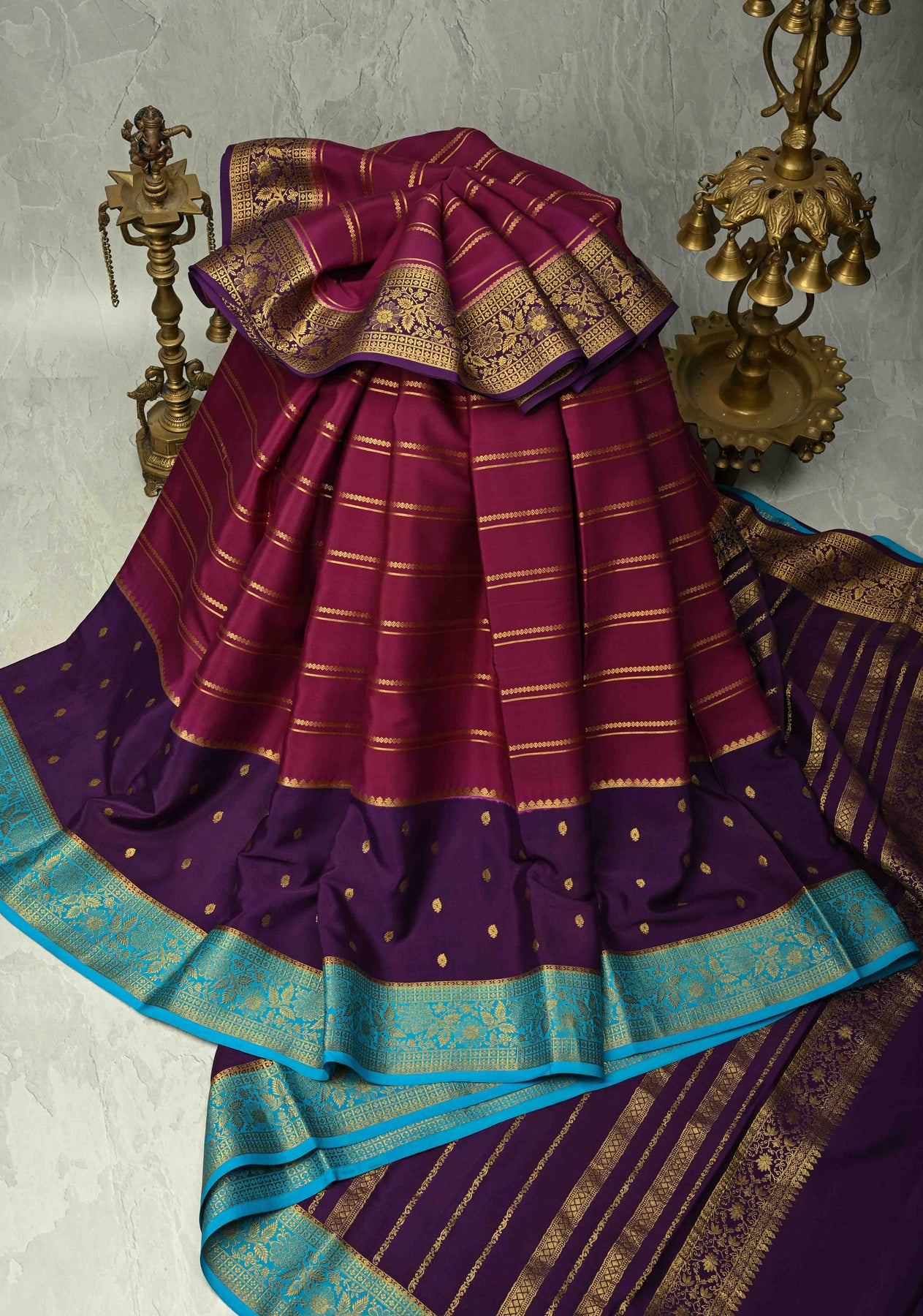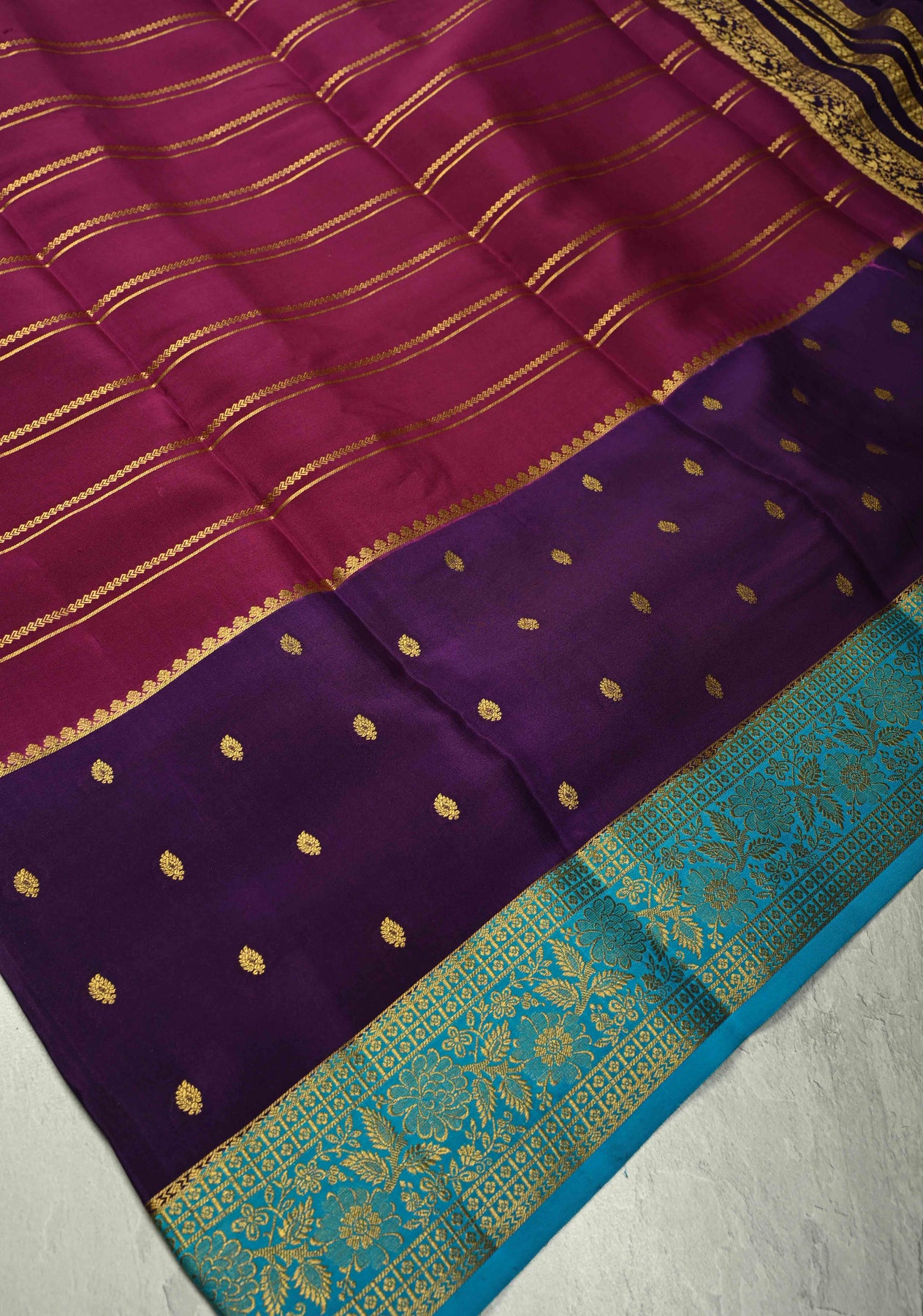 This stunning purple Mysore silk saree is a celebration of traditional elegance and intricate craftsmanship. The rich purple base is adorned with zari stripes, creating a subtle shimmer that enhances the luxurious silk fabric. Featuring a panel design with buttis, the saree showcases delicate motifs woven throughout, adding depth and artistic detail. The Ganga Jamuna border frames the saree beautifully, blending contrasting colors for a regal and sophisticated finish. Lightweight yet opulent, this saree is perfect for weddings, festive celebrations, and special occasions, offering a harmonious balance of classic tradition and contemporary design.