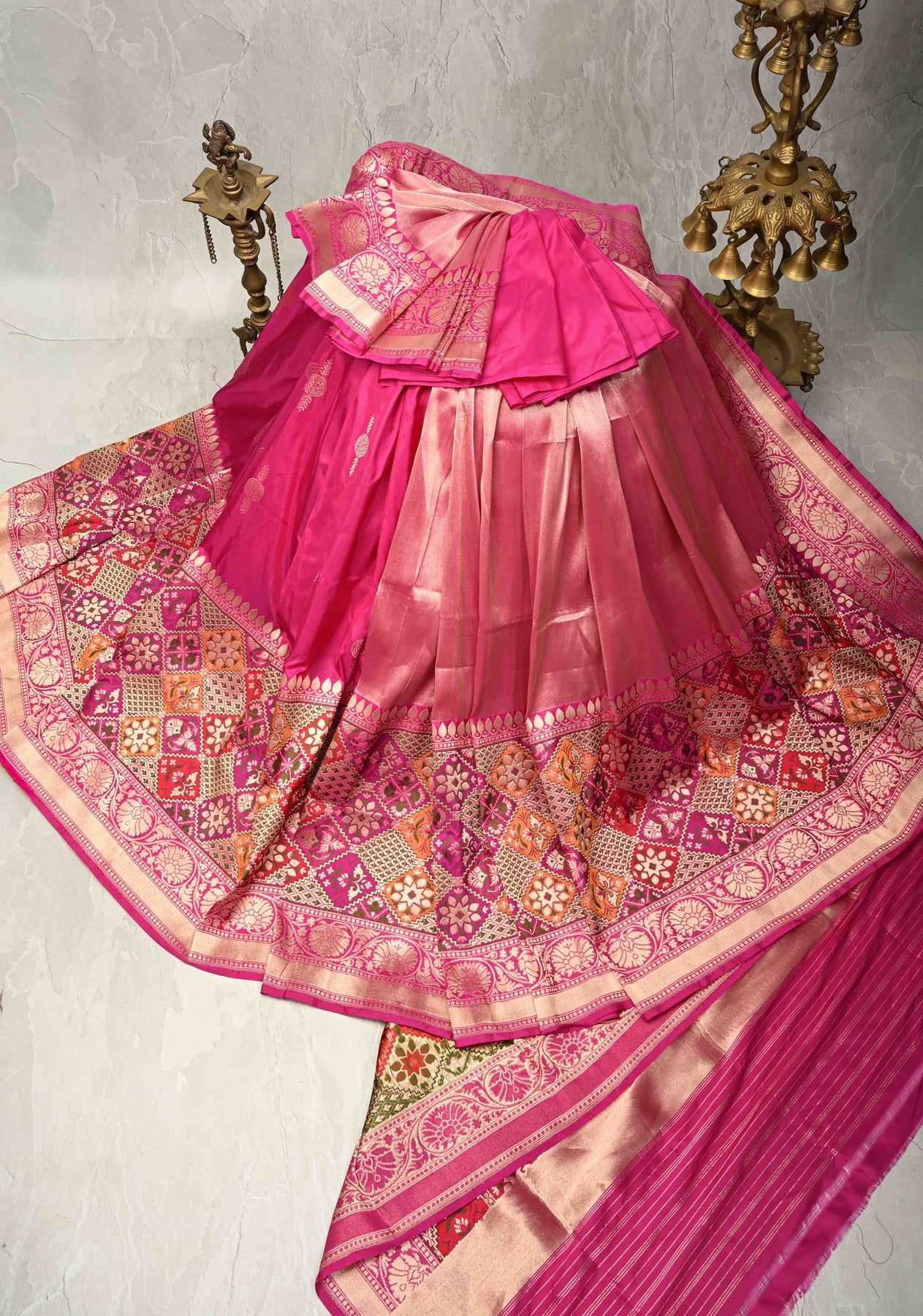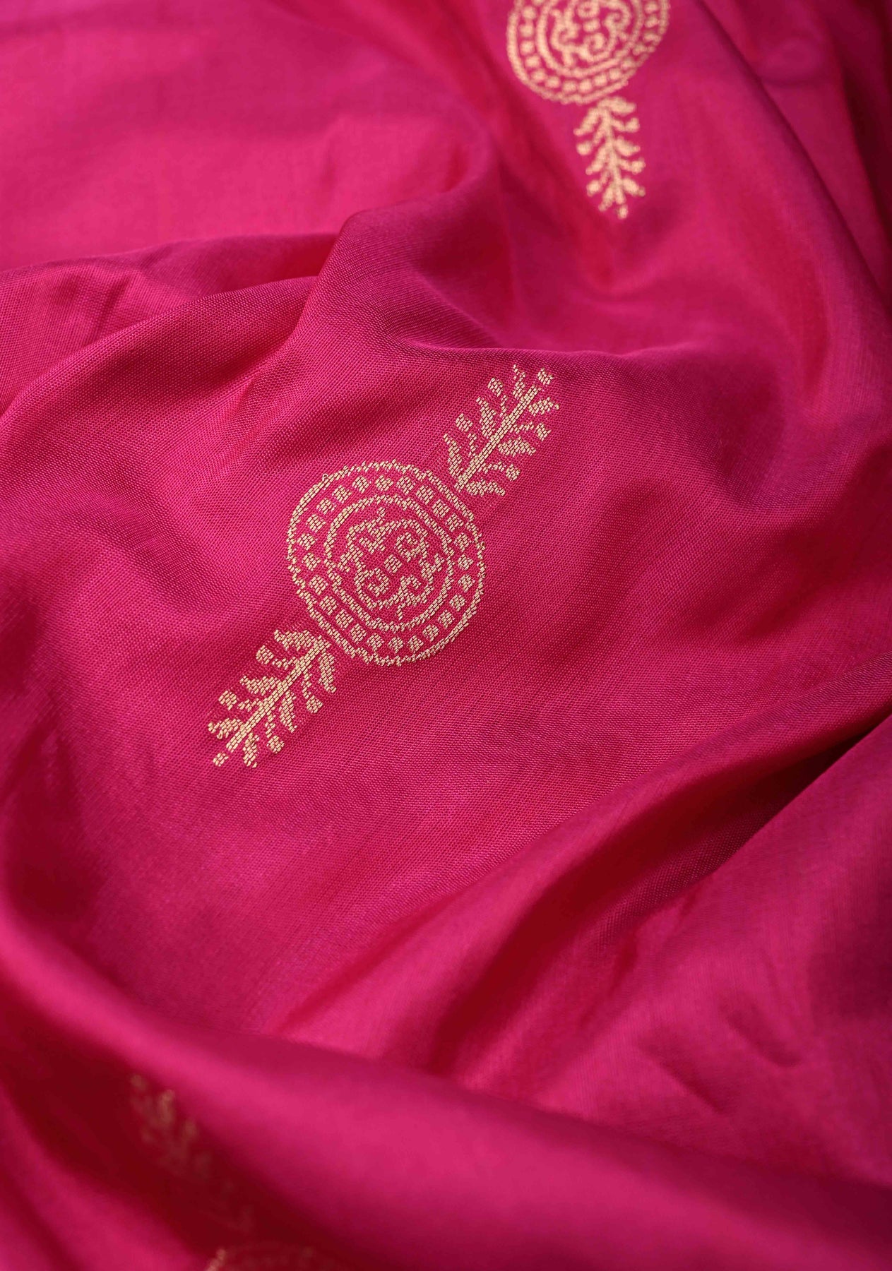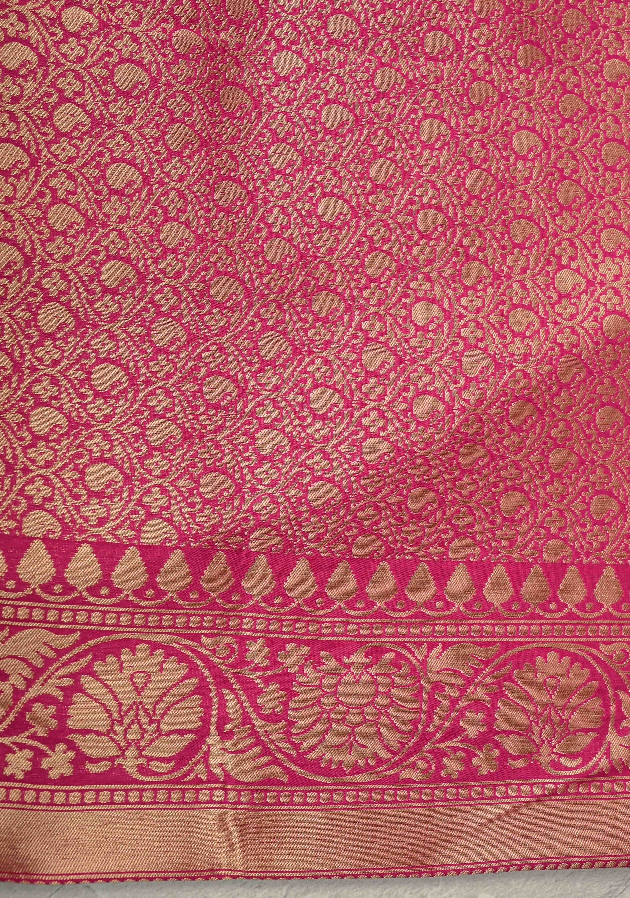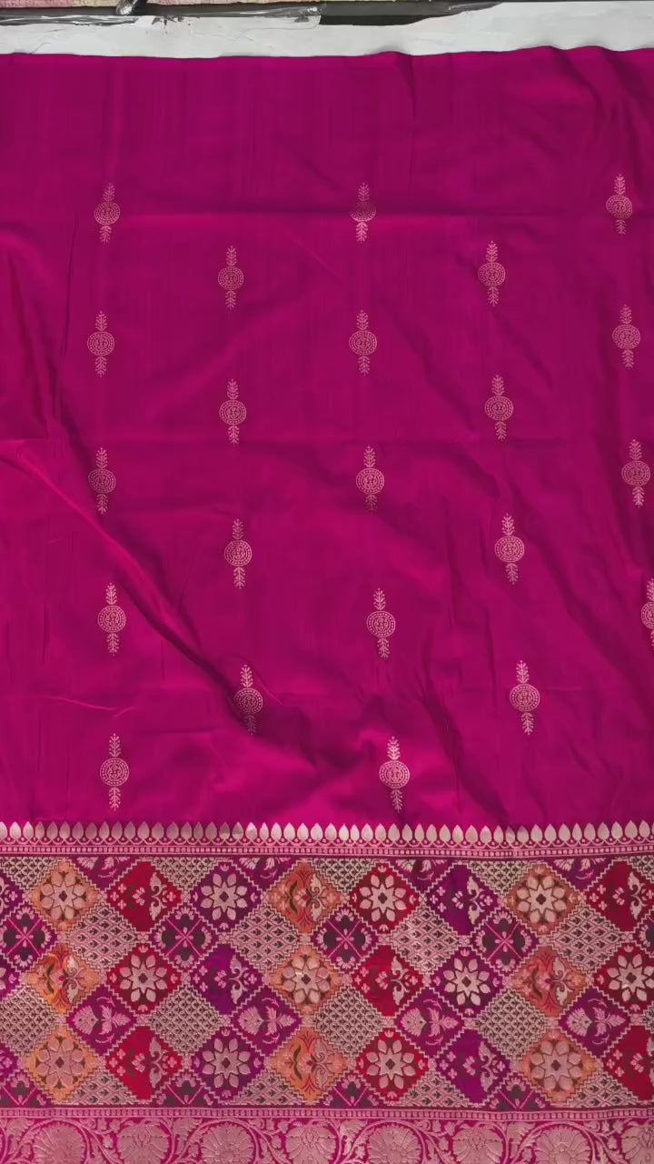 This vibrant Rani Pink Banarasi saree beautifully combines the richness of half Katan and half tissue silk, creating a luxurious and textured finish. The saree body is adorned with delicate zari buttas, adding subtle shimmer and elegance. Its striking skirt features a Meenakari-inspired geometric zari border, which brings intricate artistry and a festive charm to the ensemble. Lightweight yet opulent, the saree drapes gracefully, making it perfect for weddings, festivals, and special occasions. A perfect blend of traditional Banarasi craftsmanship and contemporary design, it is a show-stopping piece for any celebratory wardrobe.
