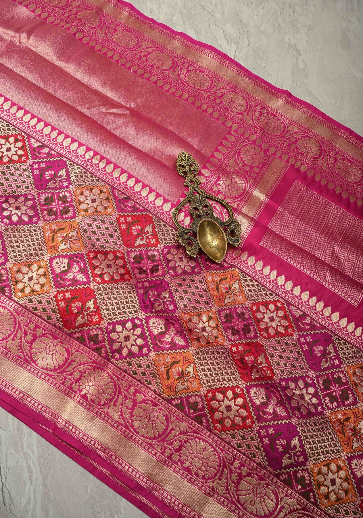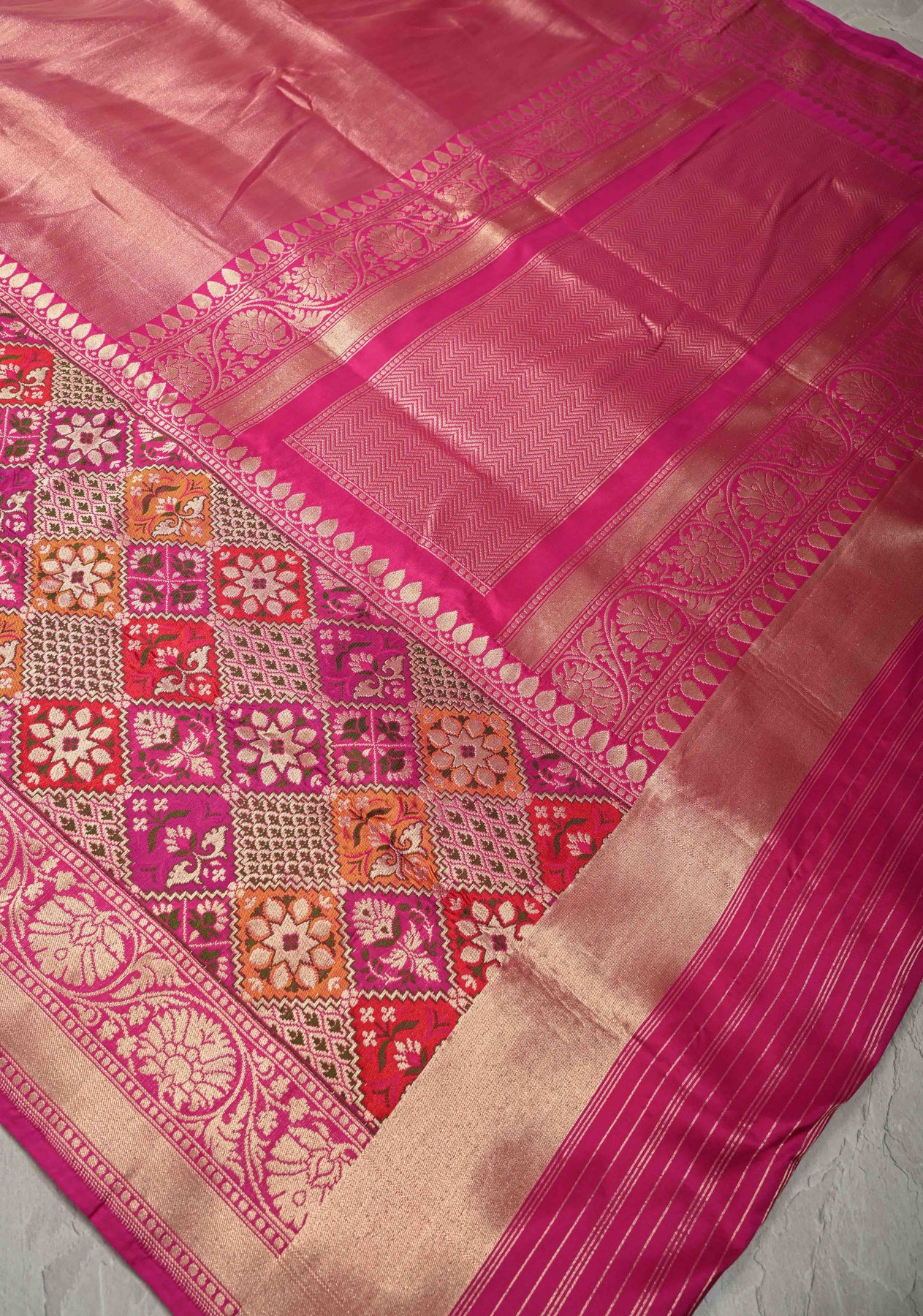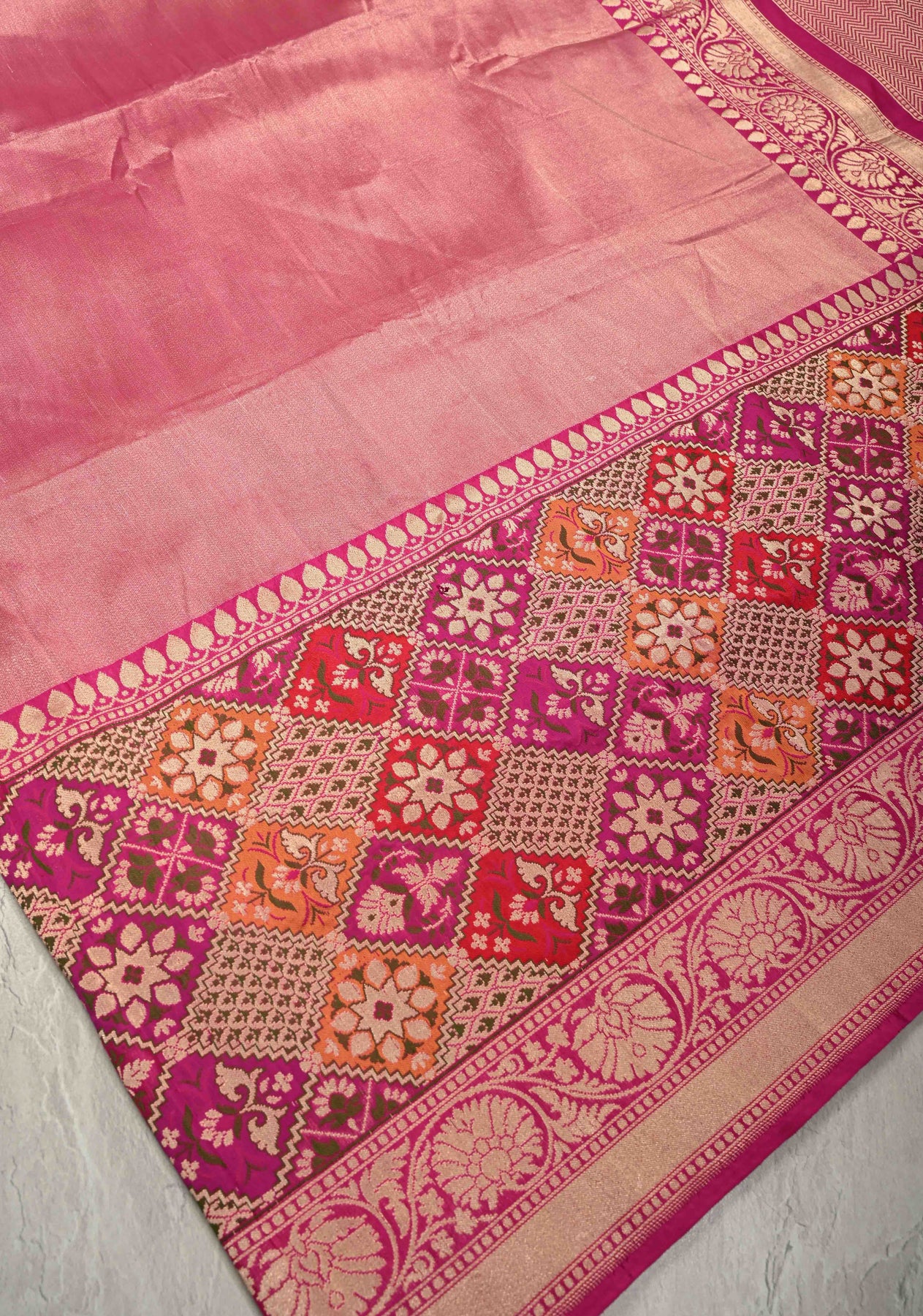 This vibrant Rani Pink Banarasi saree beautifully combines the richness of half Katan and half tissue silk, creating a luxurious and textured finish. The saree body is adorned with delicate zari buttas, adding subtle shimmer and elegance. Its striking skirt features a Meenakari-inspired geometric zari border, which brings intricate artistry and a festive charm to the ensemble. Lightweight yet opulent, the saree drapes gracefully, making it perfect for weddings, festivals, and special occasions. A perfect blend of traditional Banarasi craftsmanship and contemporary design, it is a show-stopping piece for any celebratory wardrobe.