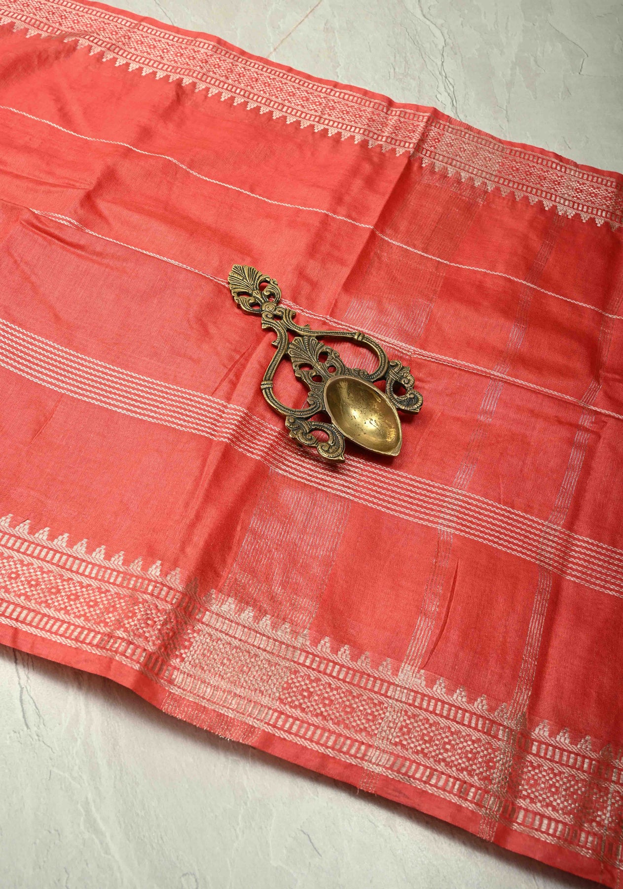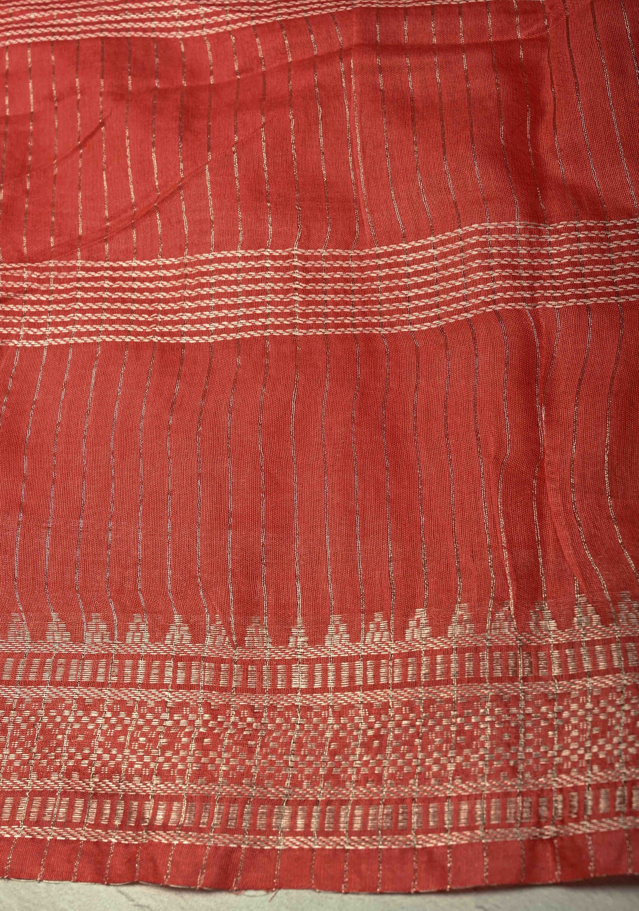 Make a vibrant statement with this Red-Orange Semi Tussar Saree, crafted from soft, breathable semi-tussar fabric that drapes elegantly and feels lightweight. The striking red-orange body is adorned with subtle thread stripes, adding texture and contemporary charm. A beautifully detailed temple-inspired zari border enhances the saree with traditional motifs, making it perfect for weddings, festive occasions, and cultural celebrations. Lightweight, stylish, and graceful, this saree blends heritage craftsmanship with modern elegance.
