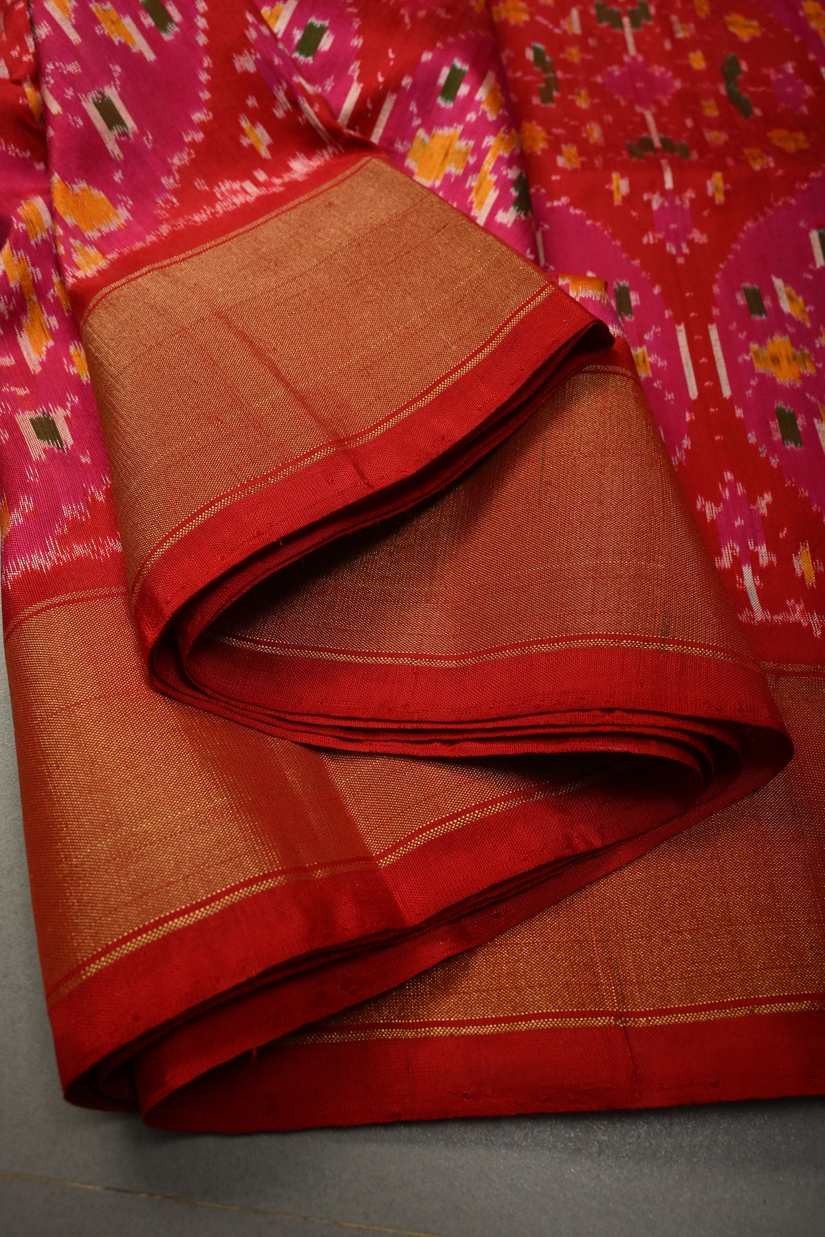 The Red-Rani Pink Dual Tone Pochampally Ikat Silk Saree is a stunning celebration of traditional Indian handloom artistry, woven from pure silk that radiates a natural sheen and drapes with effortless elegance. Its vibrant red and rani pink dual-tone body is intricately rendered in classic Pochampally ikkat patterns — a signature tie-and-dye weave that creates striking geometric and trellis motifs reminiscent of Moroccan latticework, adding a contemporary twist to heritage design. Framing the rich body is a delicate tissue zari border that shimmers subtly with every movement, lending an opulent yet refined finish, while the pallu flows gracefully with coordinated tones that enhance the overall visual harmony. Light in weight yet majestic in presence, this saree effortlessly blends timeless craftsmanship with modern style — perfect for weddings, festivals, or any special occasion where you want to make a memorable impression